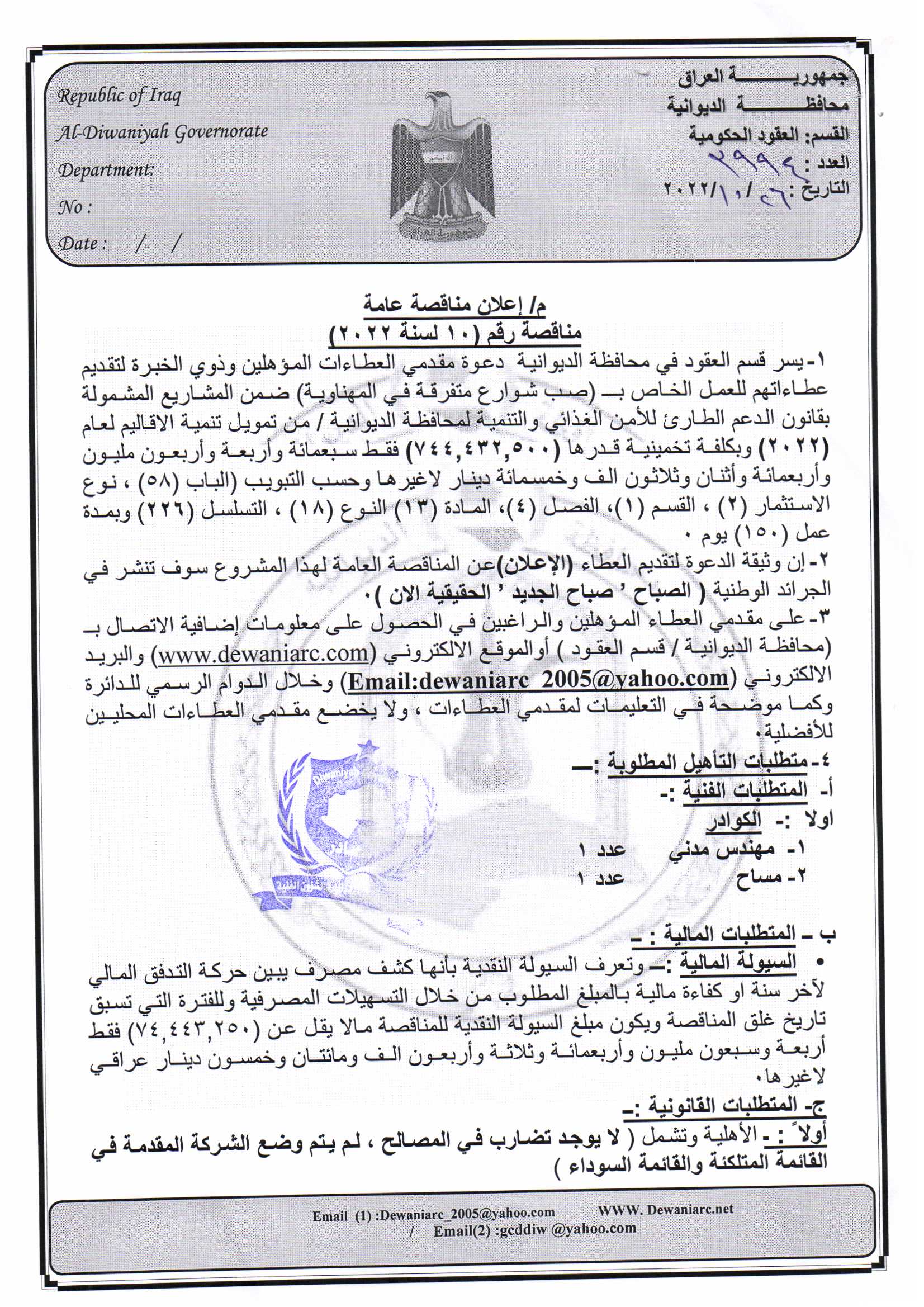 ﴿ إعلان مناقصة (10) لسنة 2022