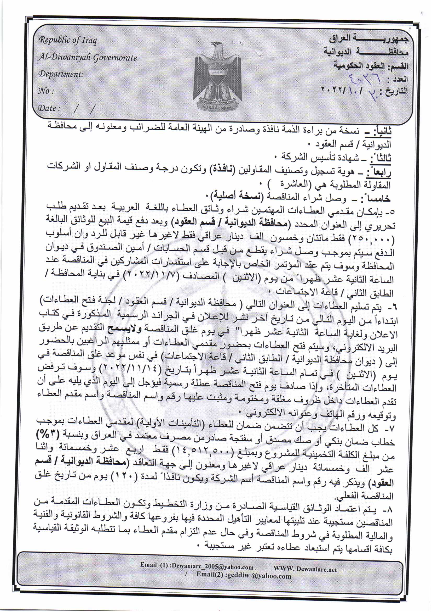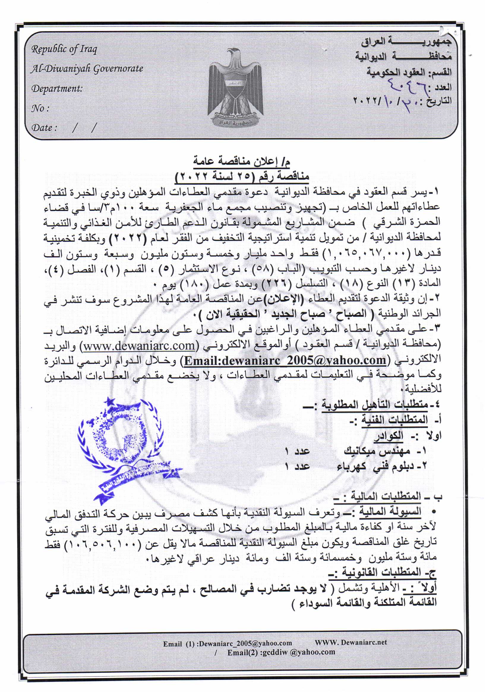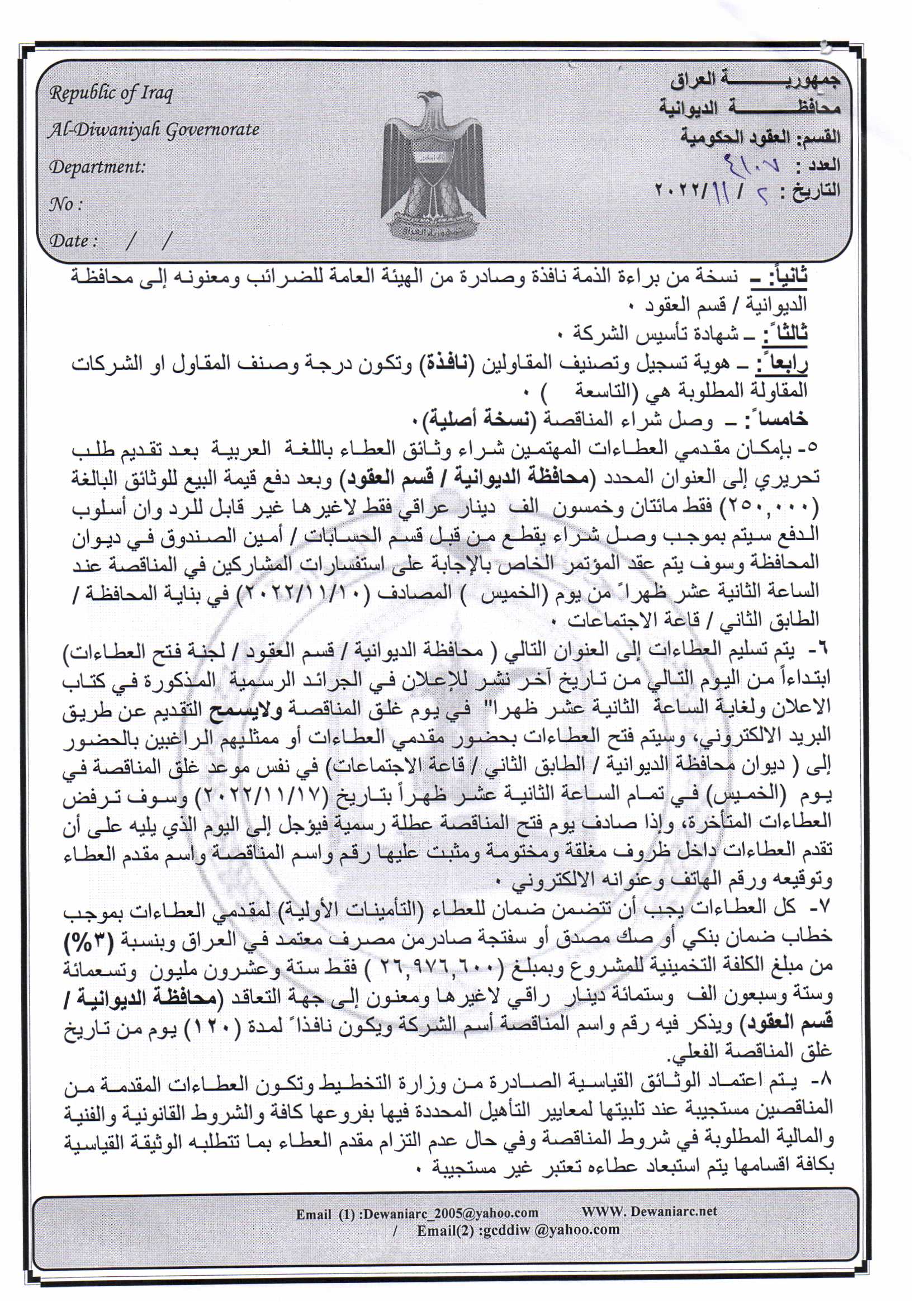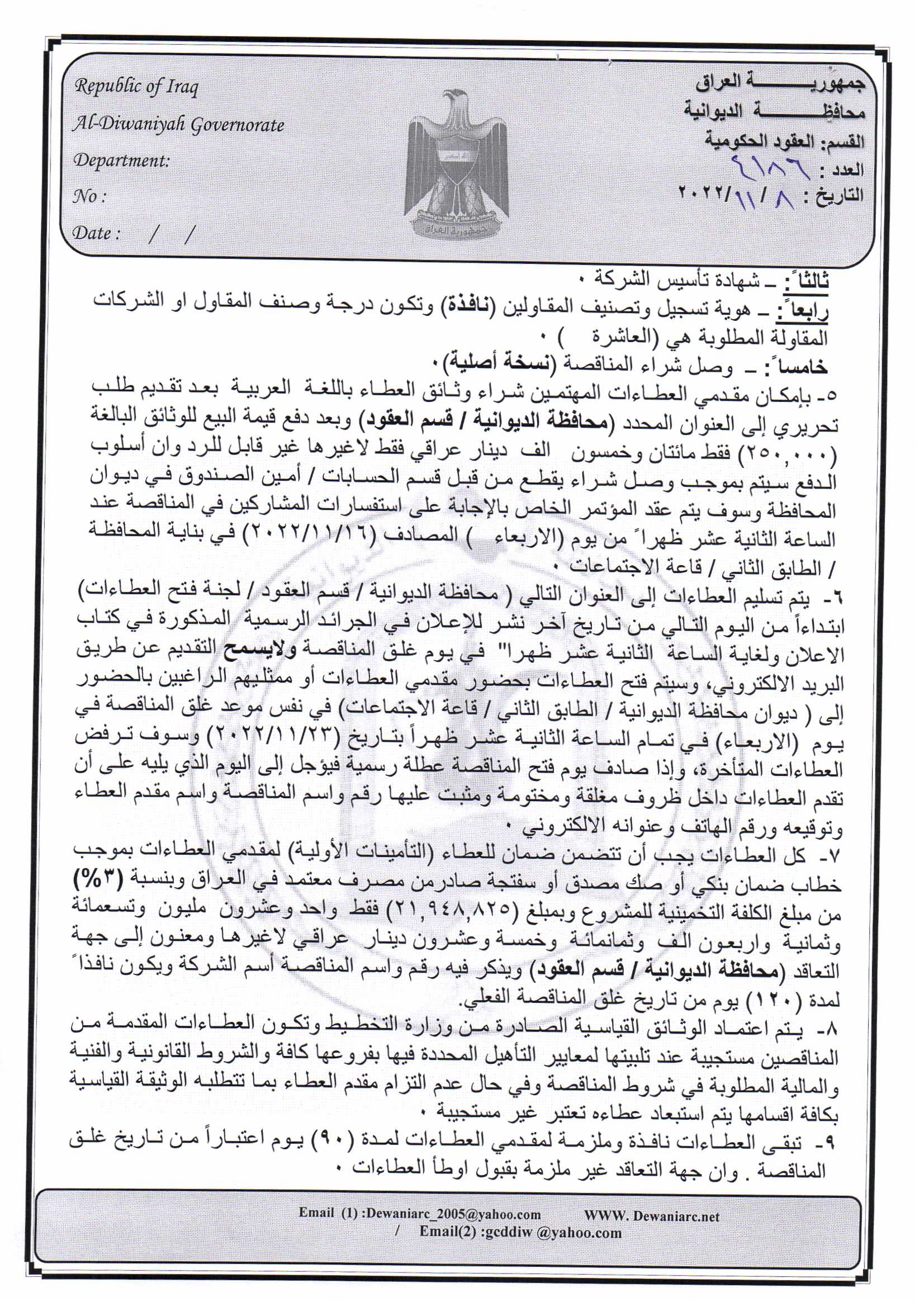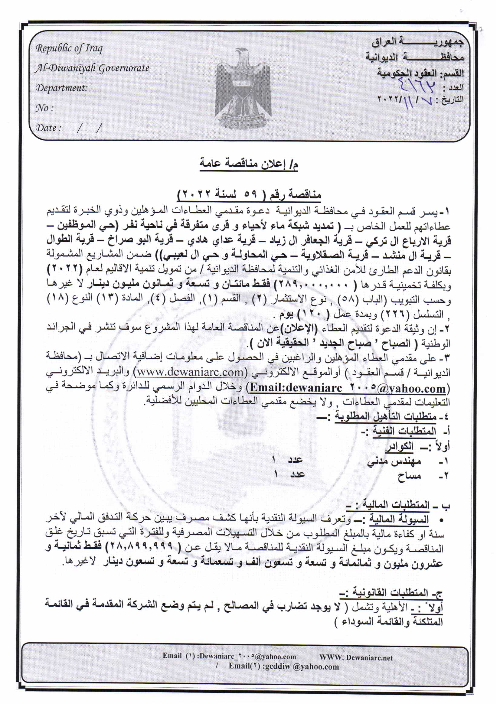 ﴿ إعلان مناقصة (26) لسنة 2022