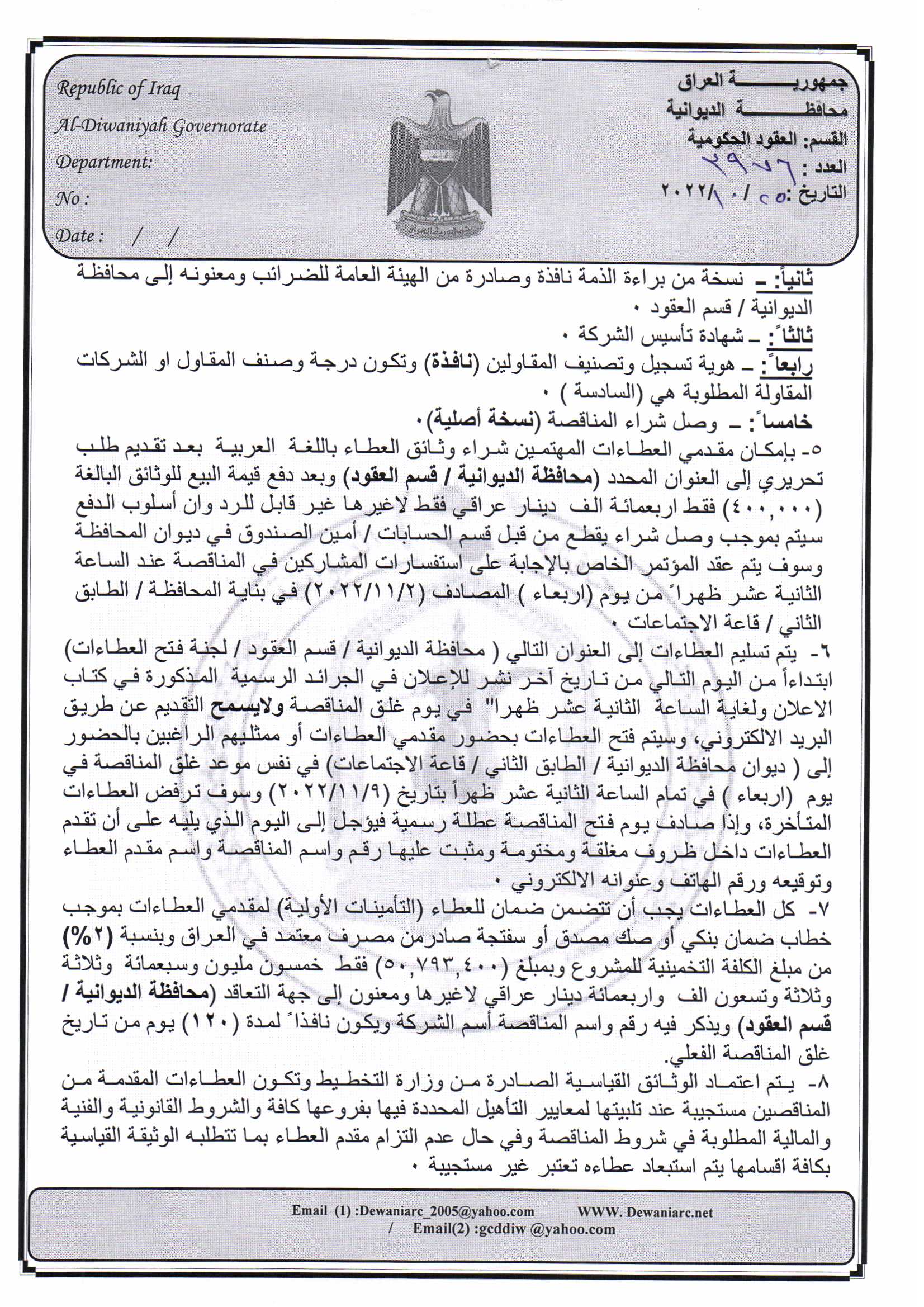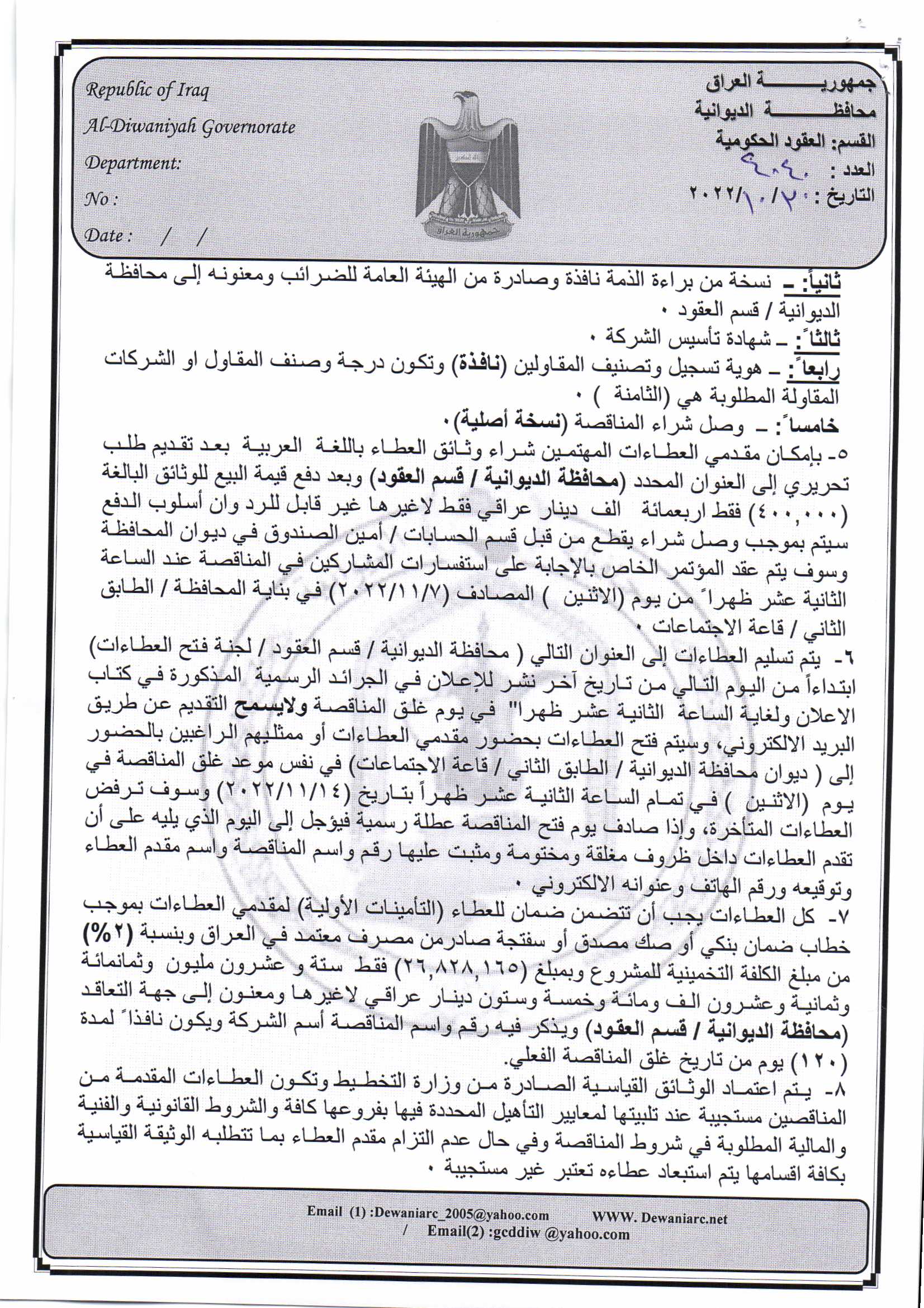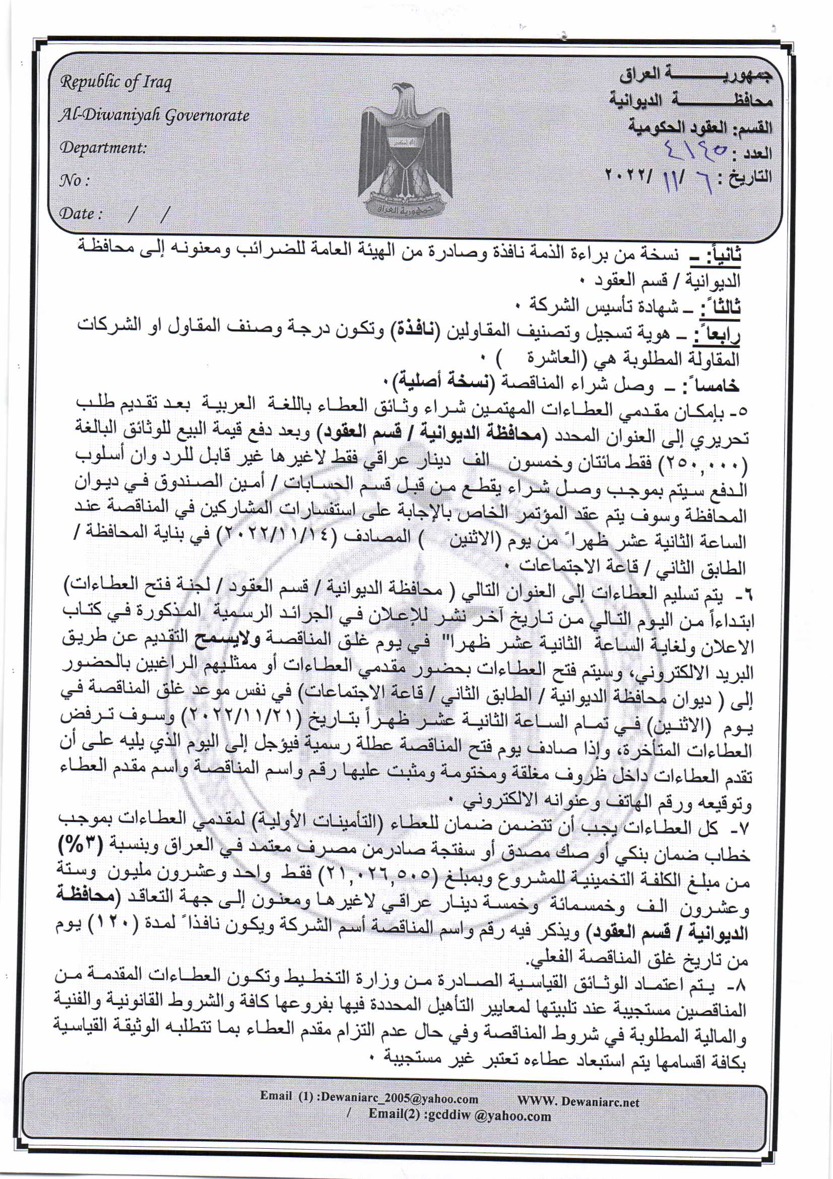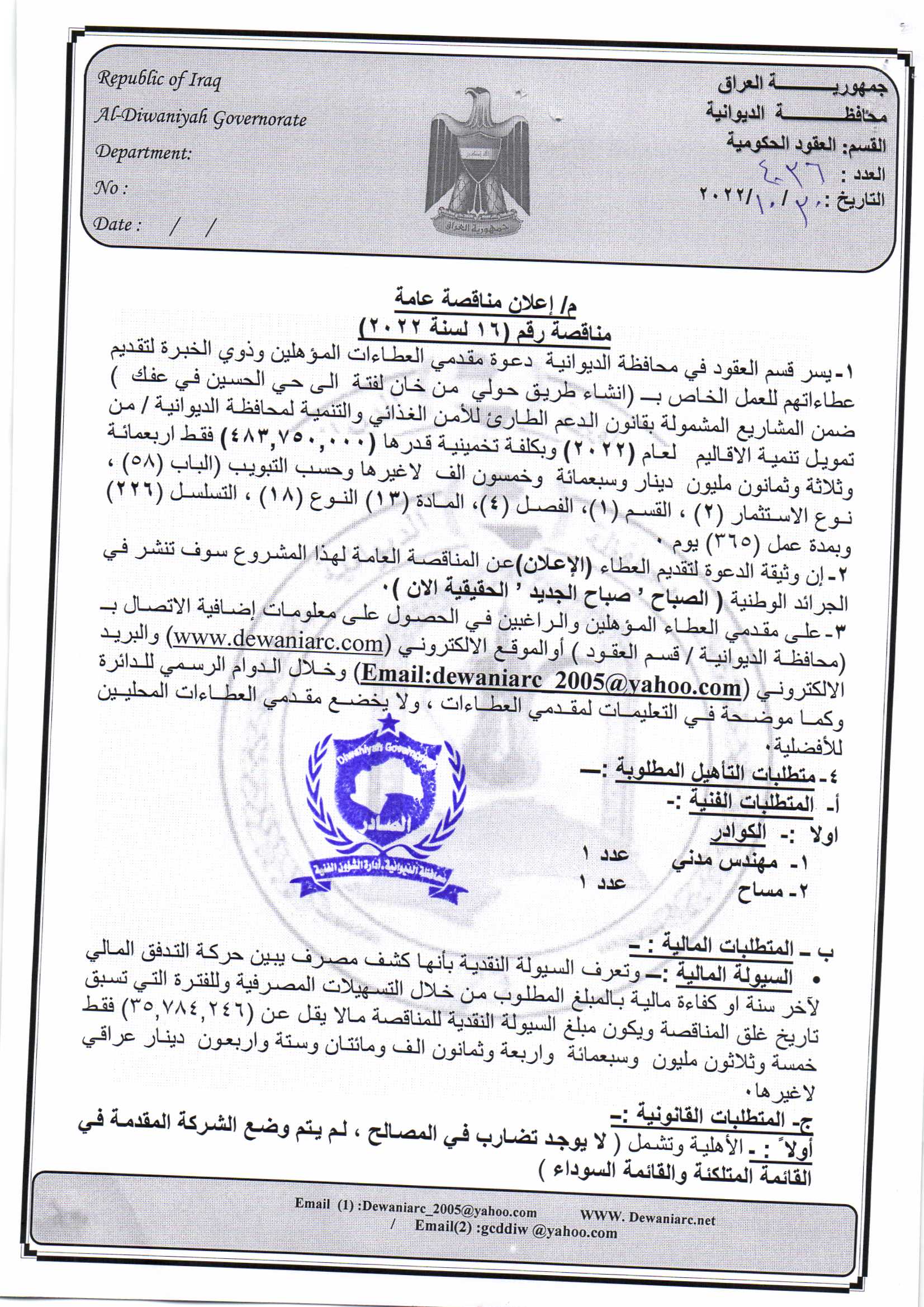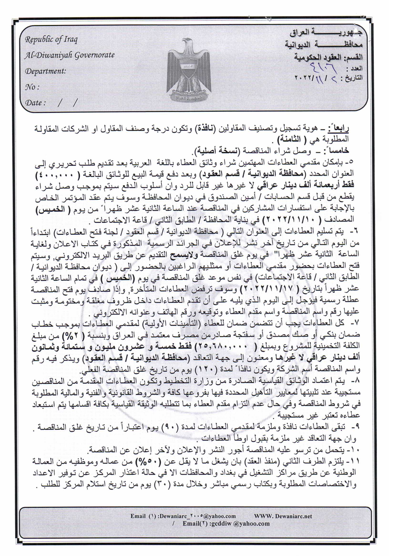 ﴿ إعلان مناقصة (26) لسنة 2022