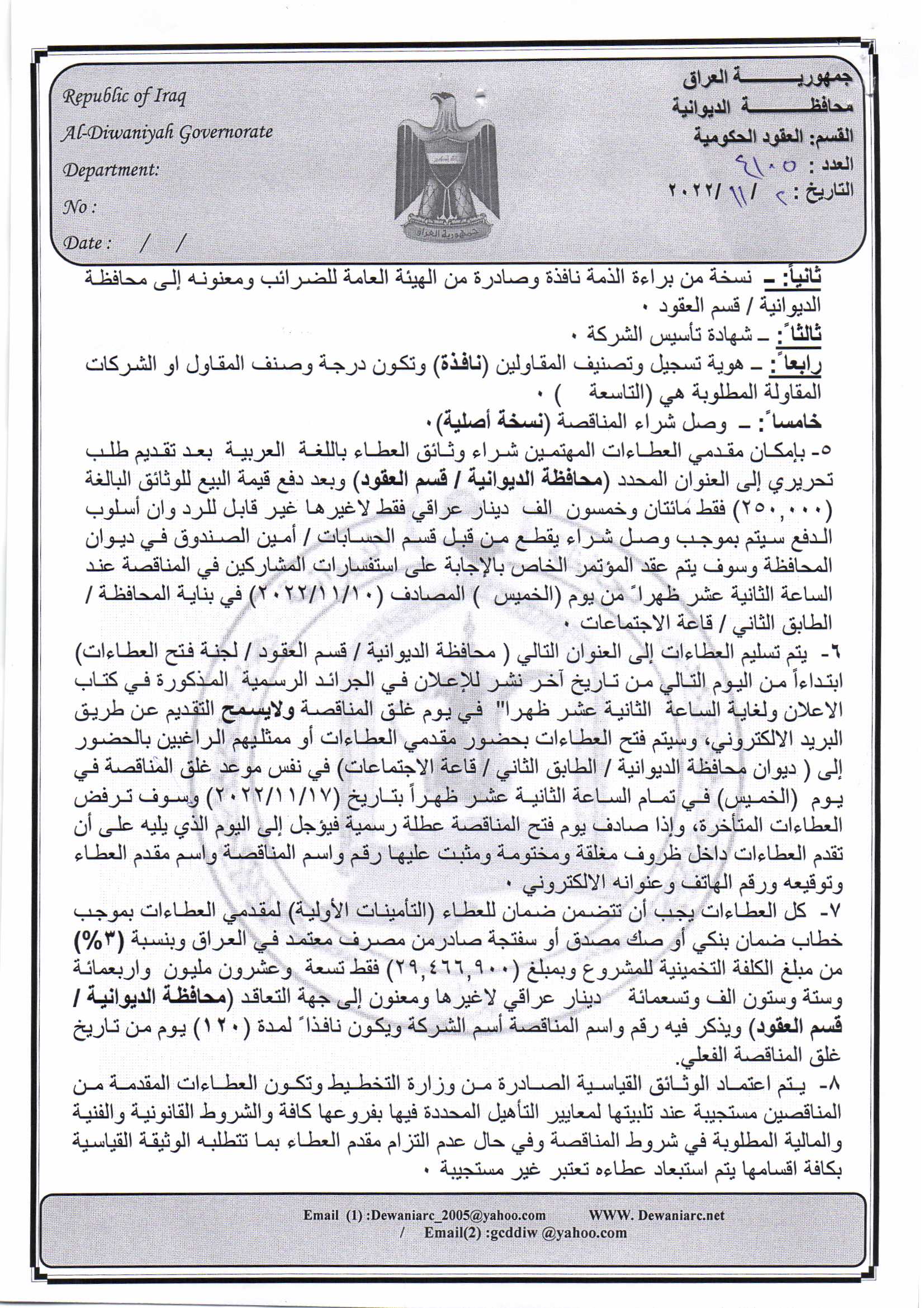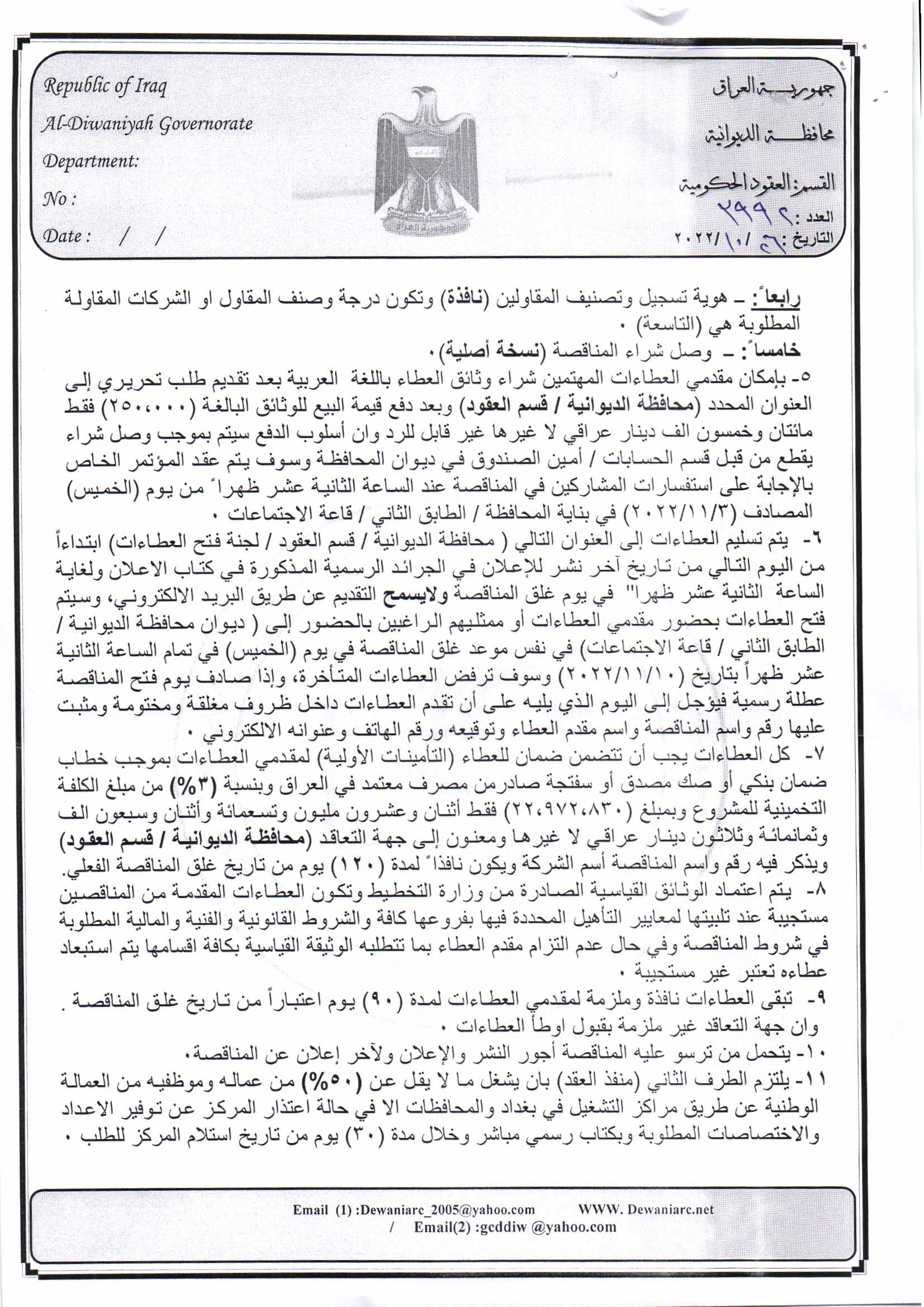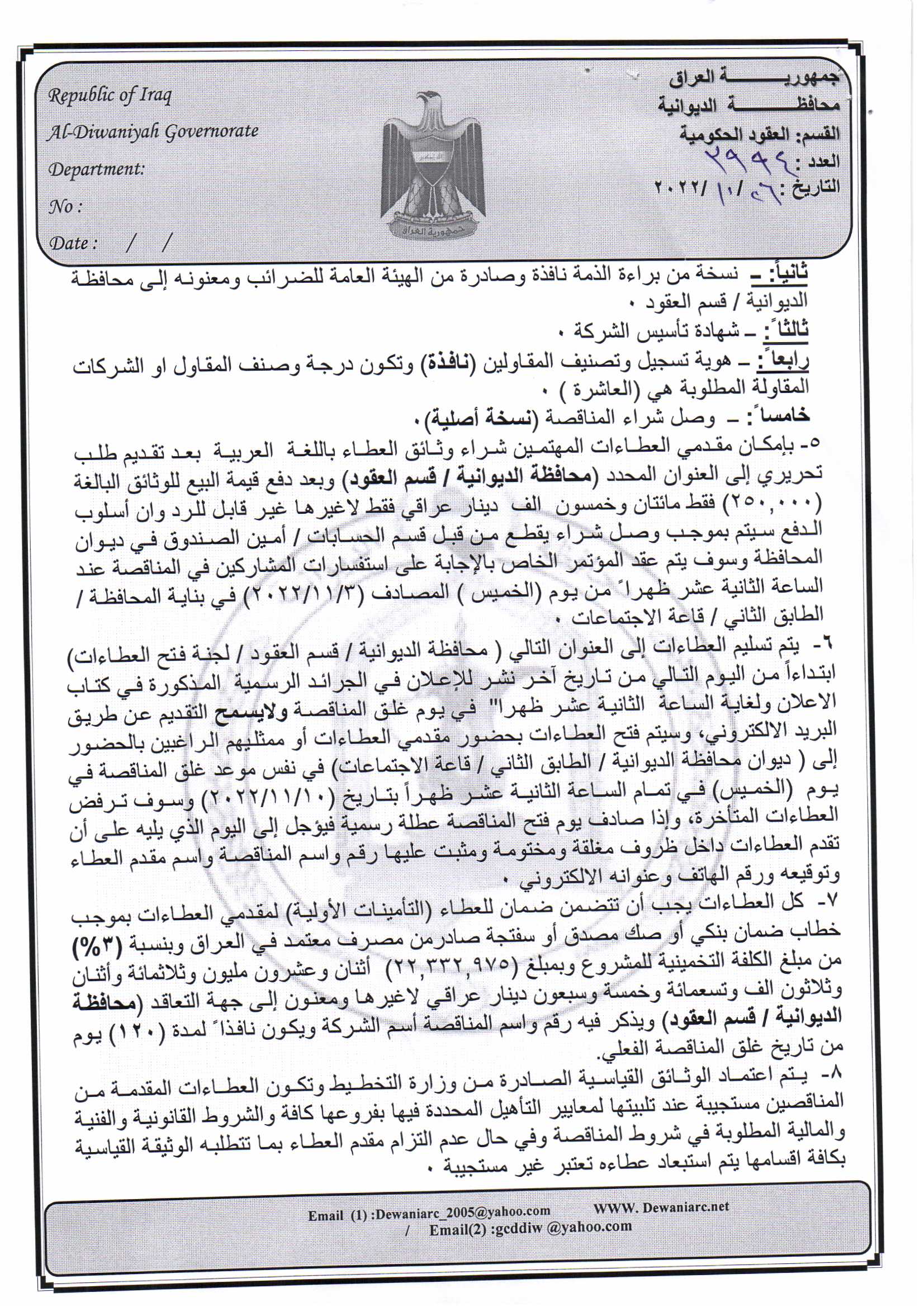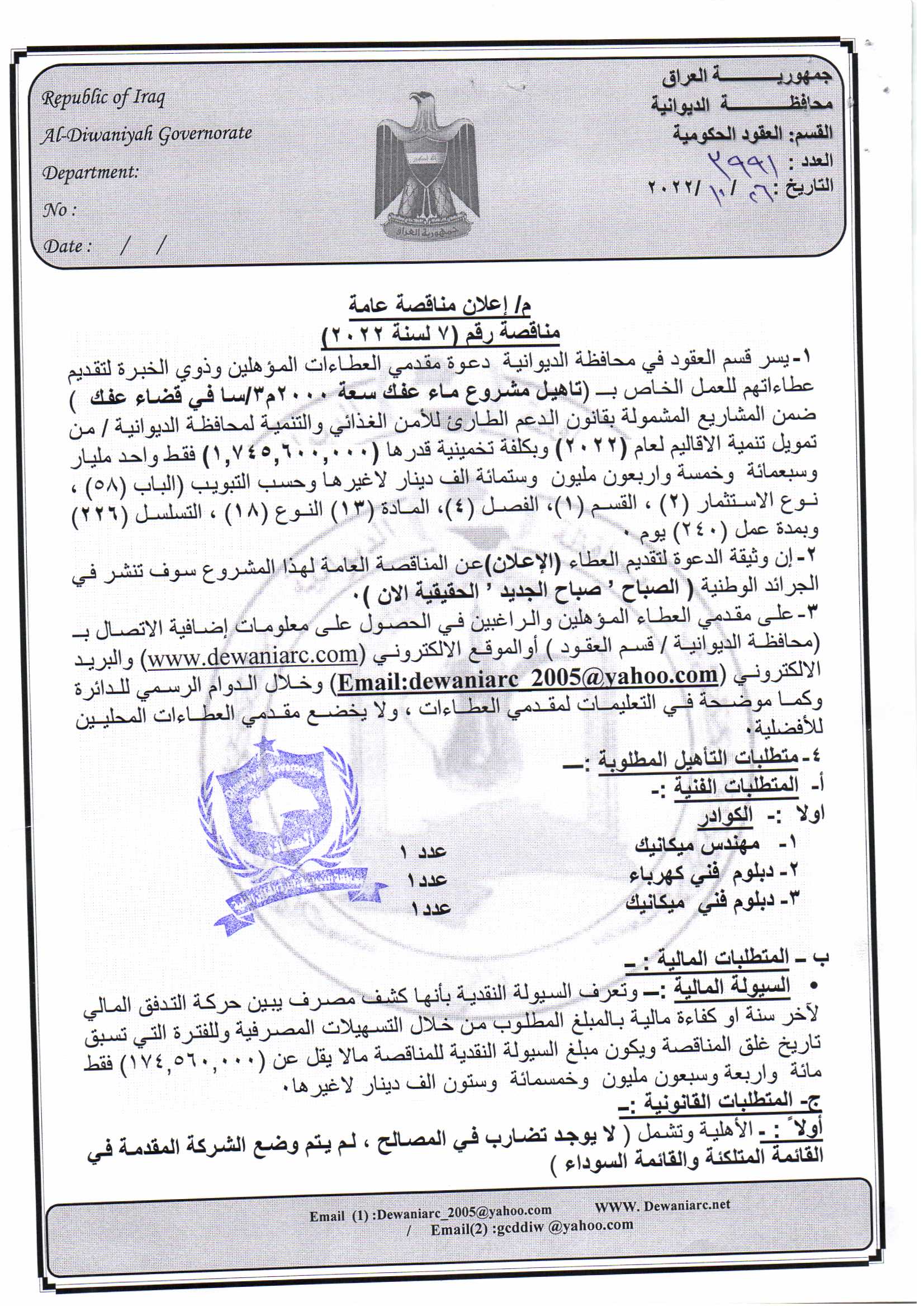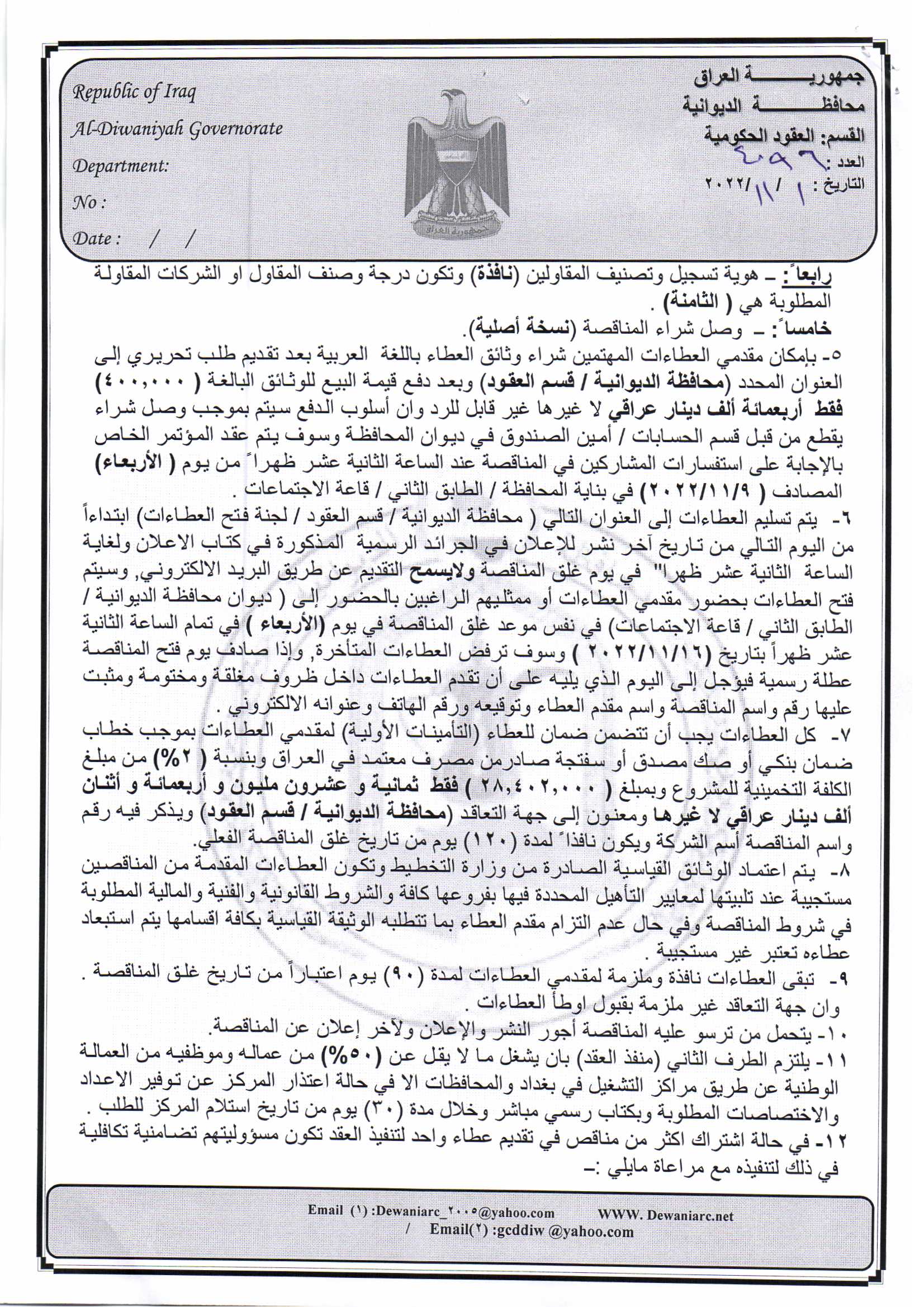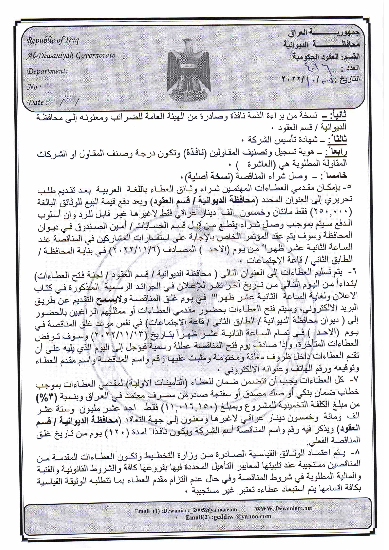 ﴿ إعلان مناقصة (26) لسنة 2022