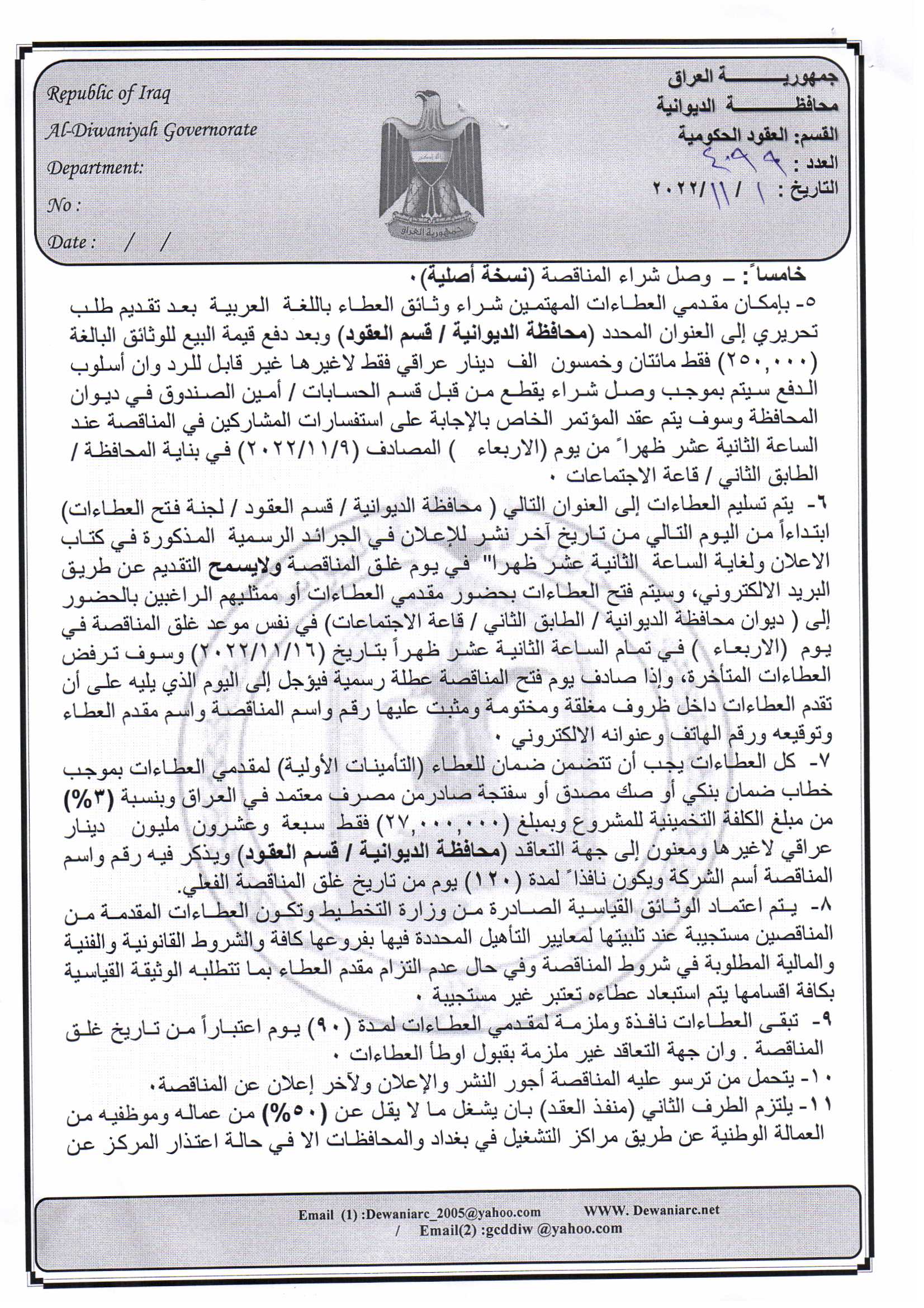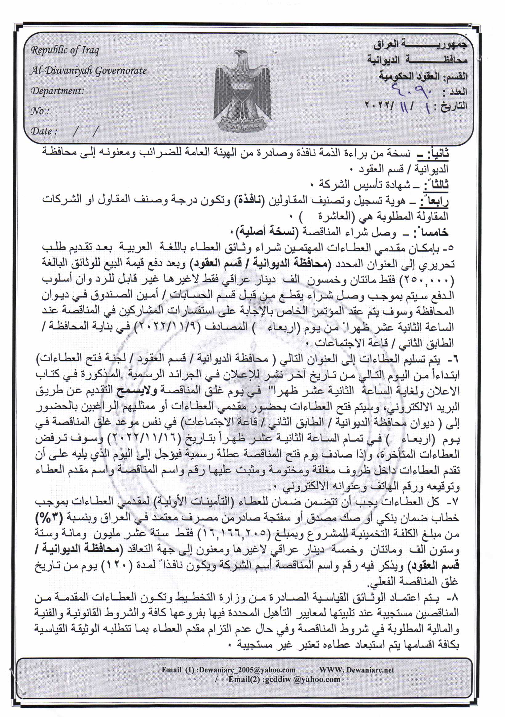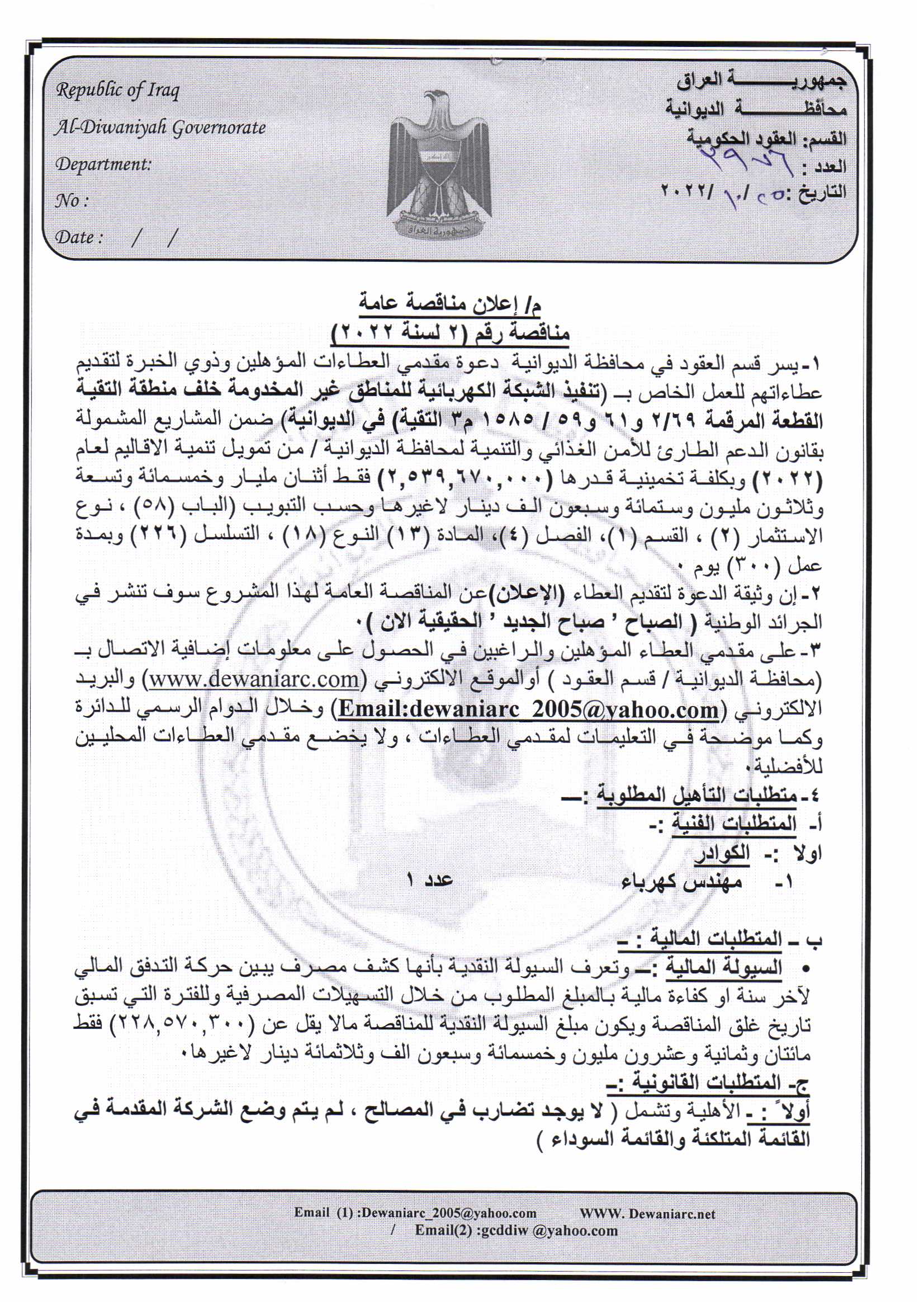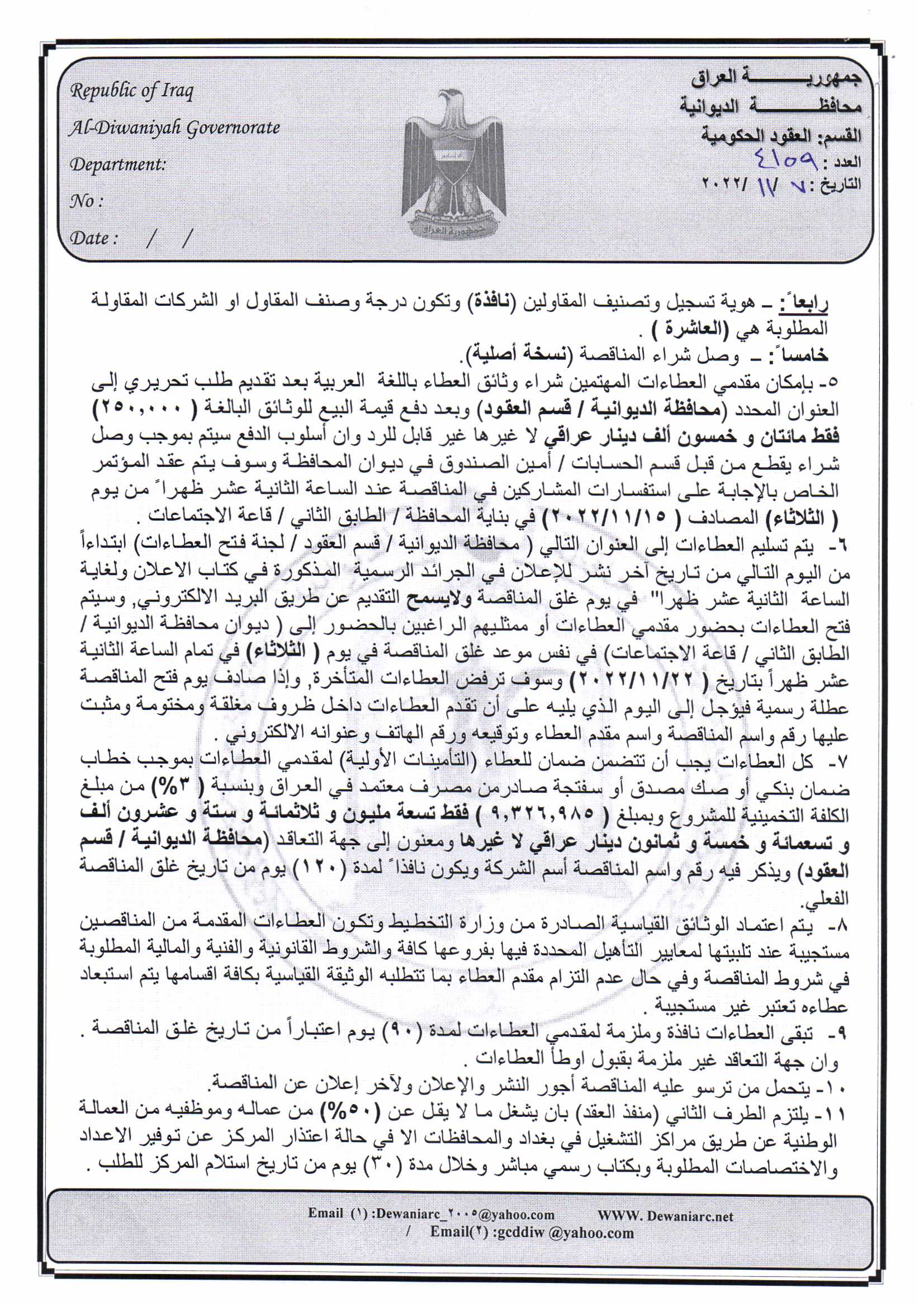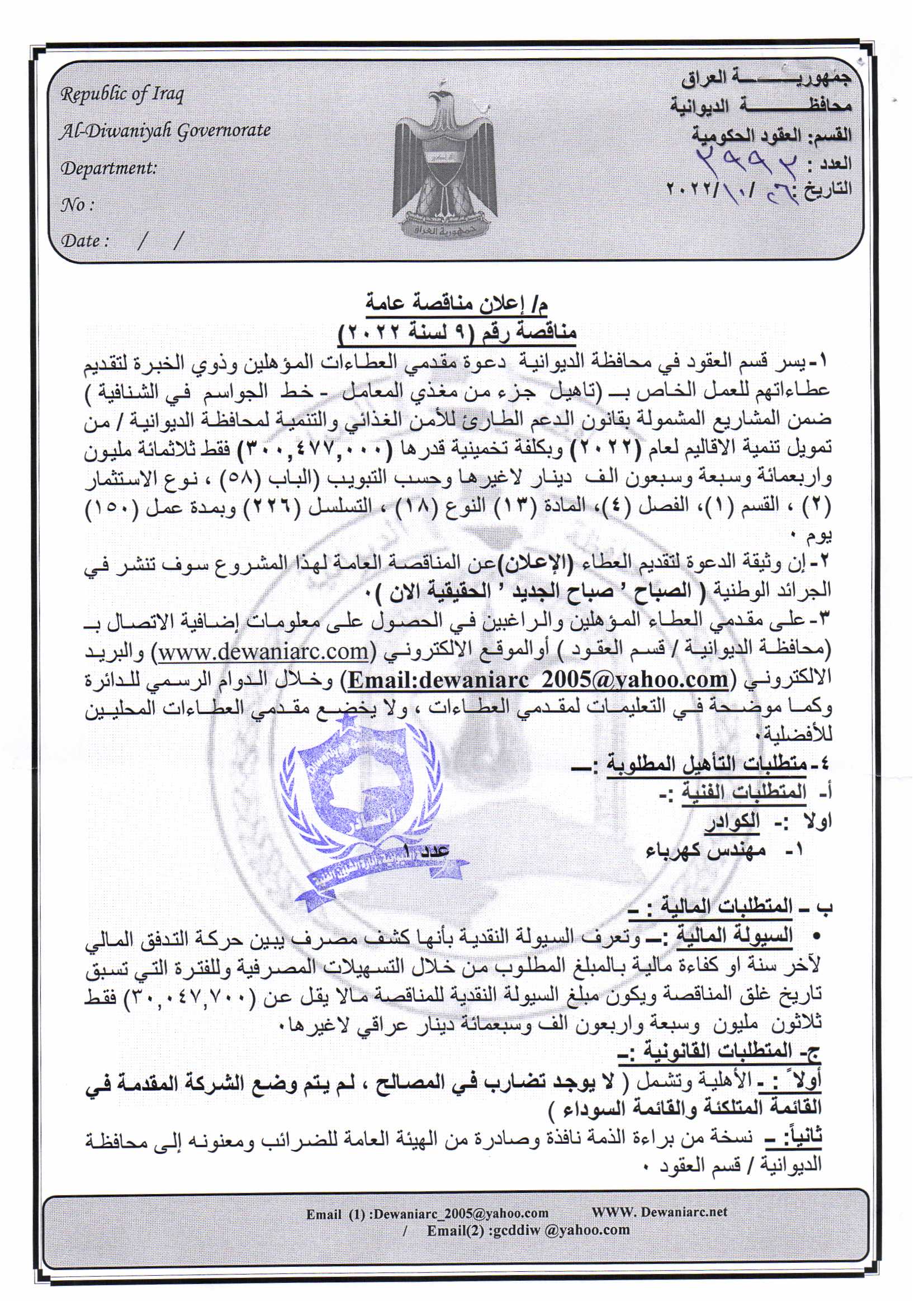 ﴿ إعلان مناقصة (9) لسنة 2022
