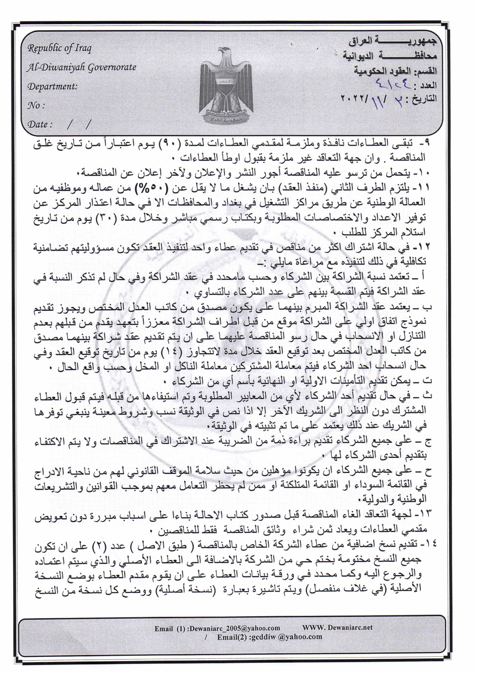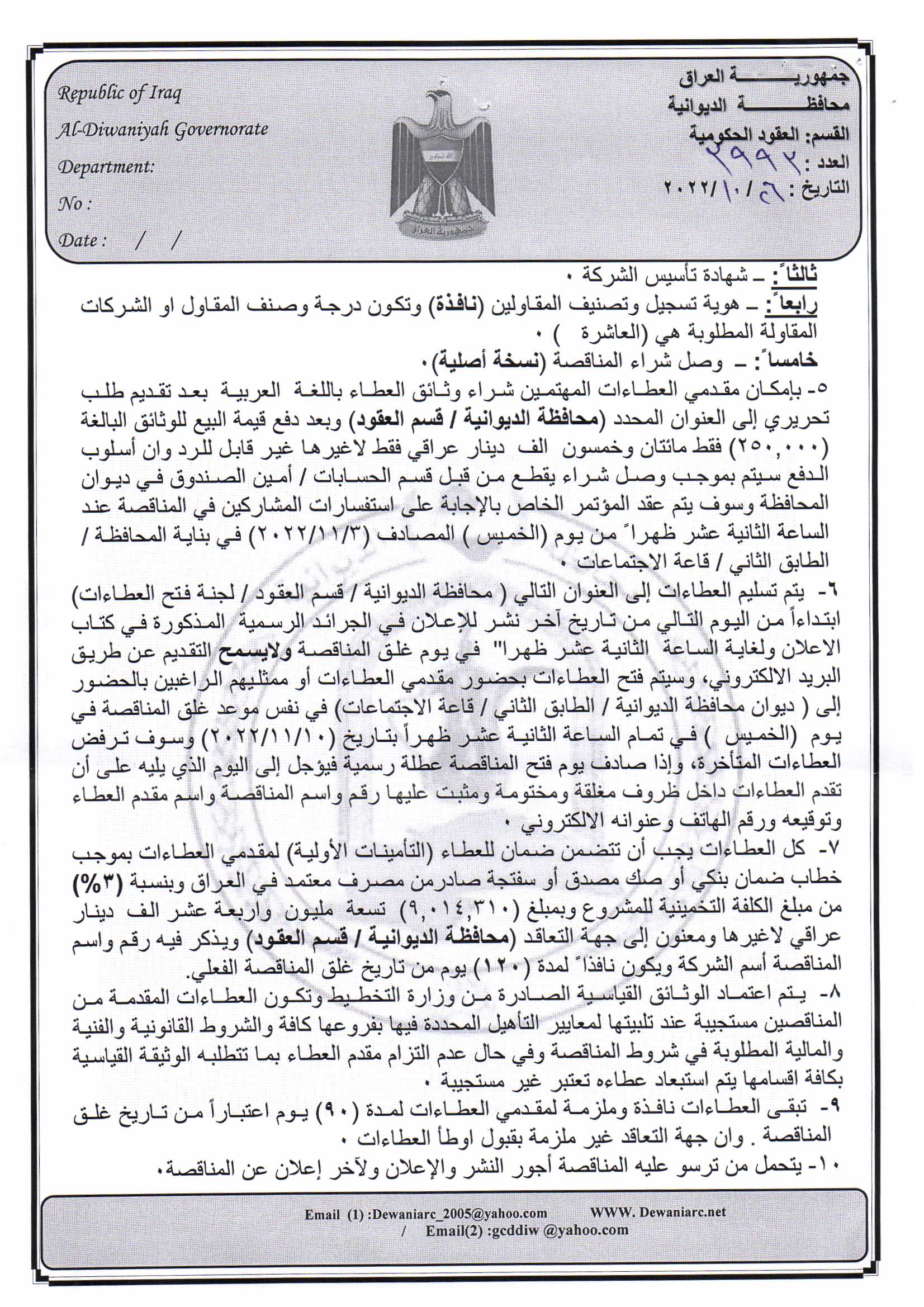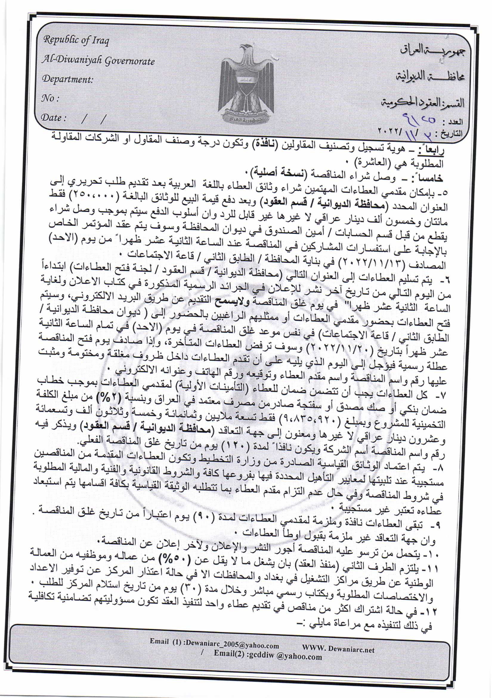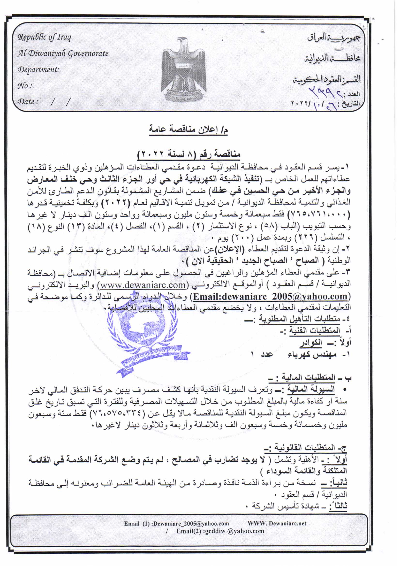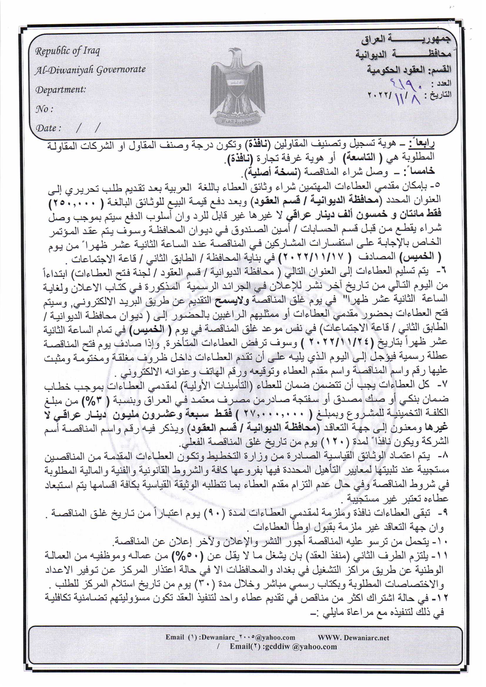 ﴿ إعلان مناقصة (9) لسنة 2022