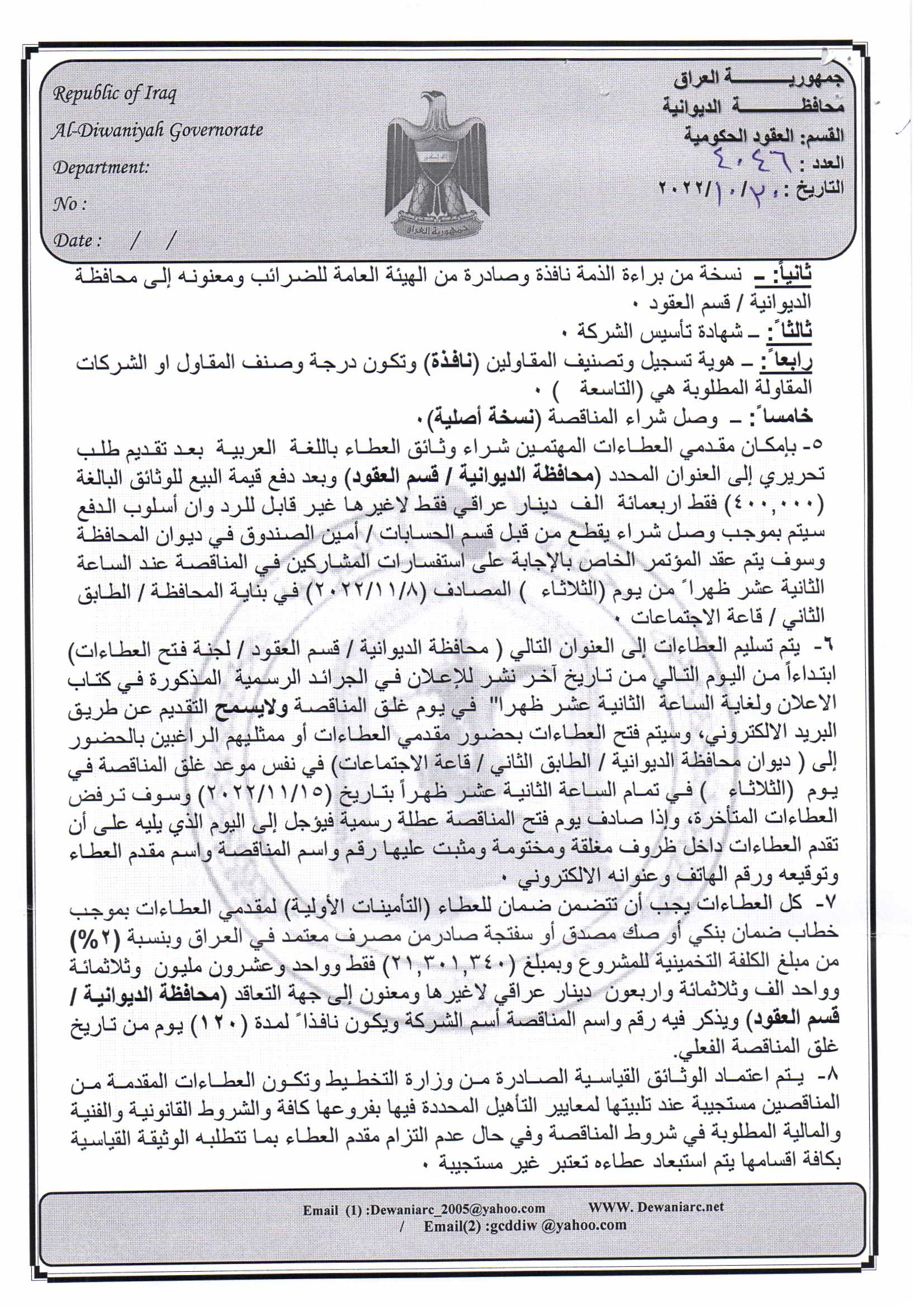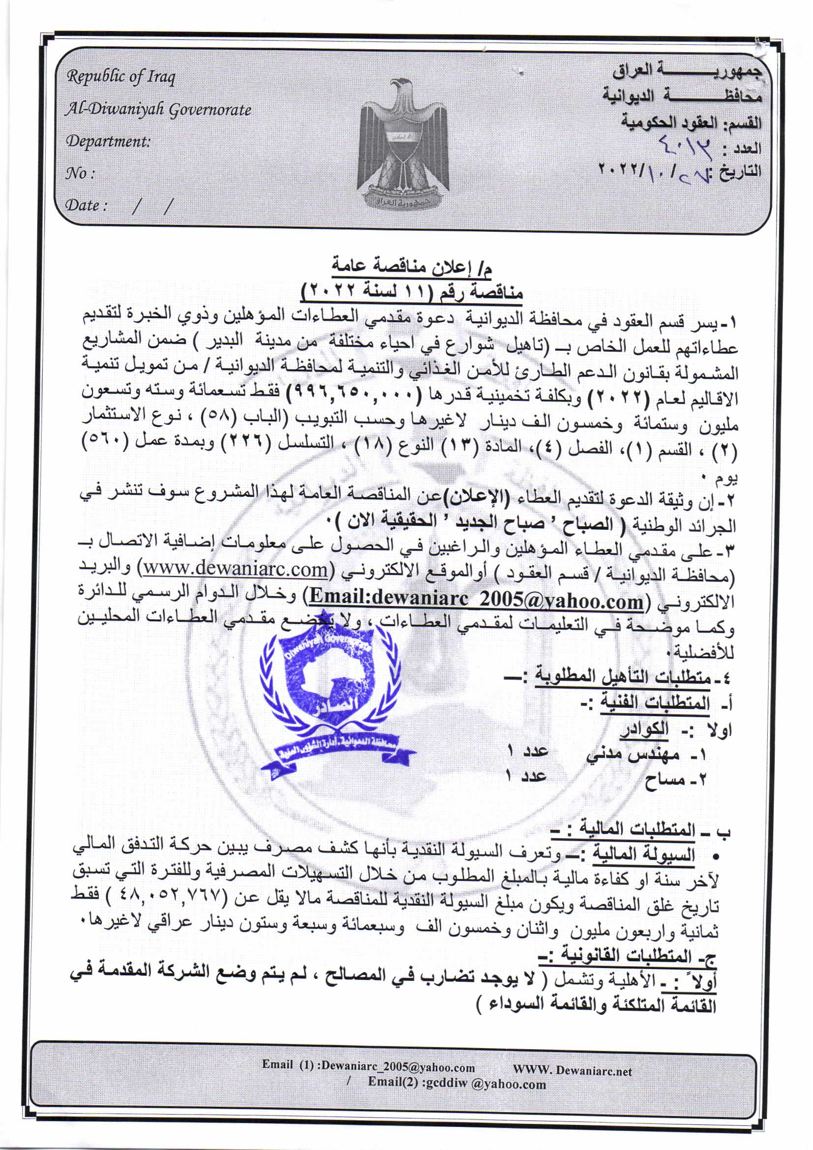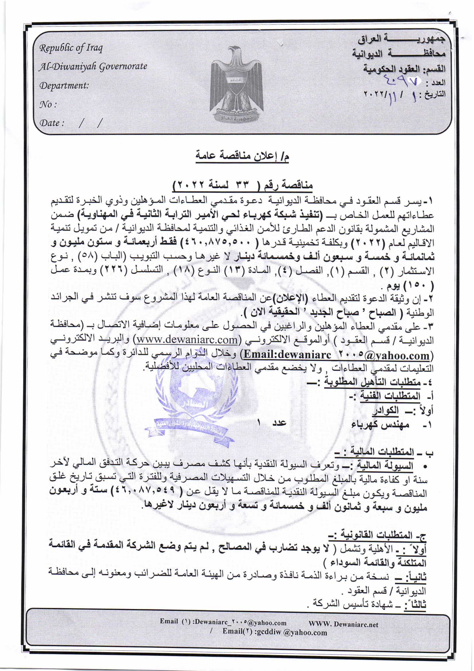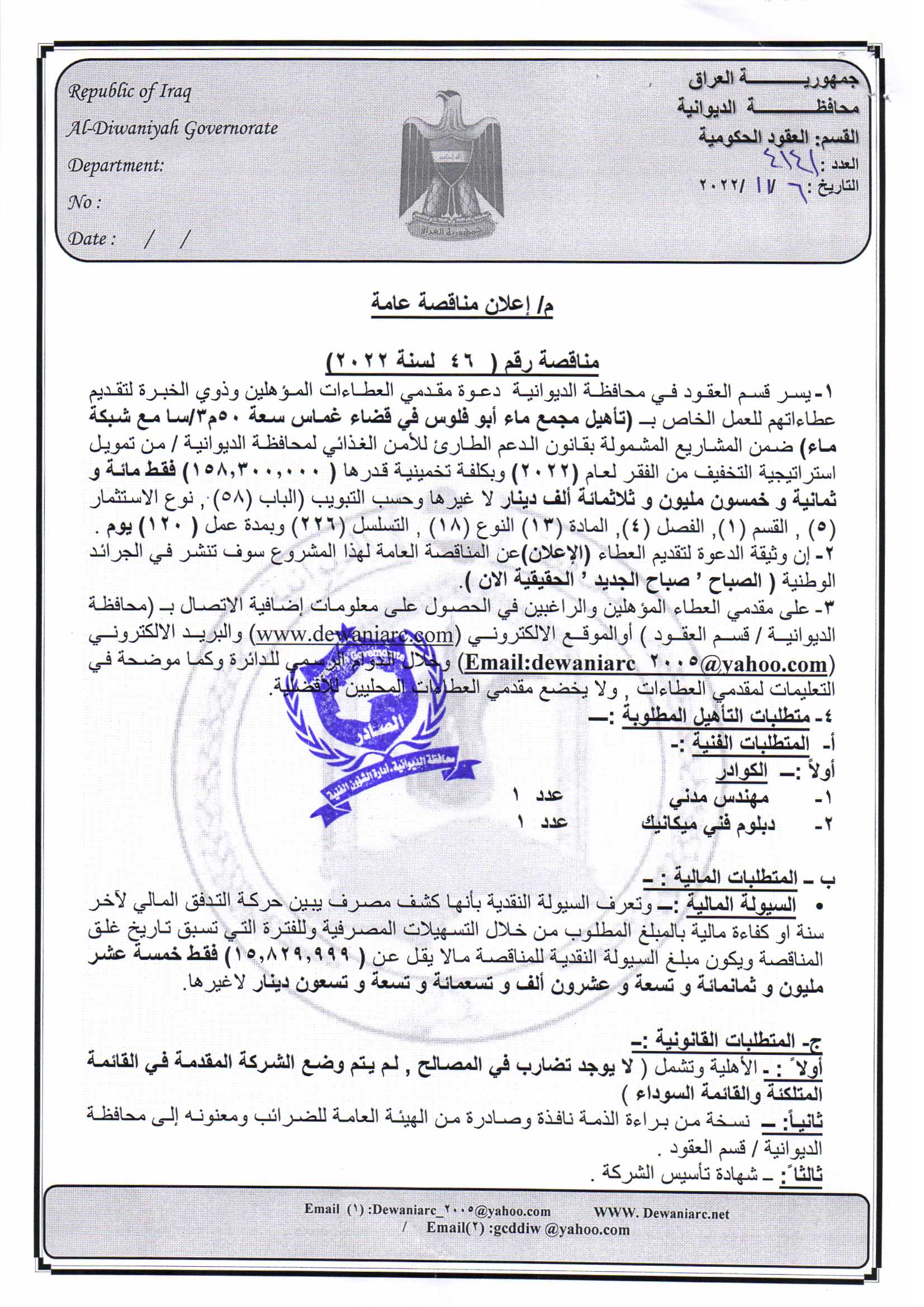 ﴿ إعلان مناقصة (46) لسنة 2022