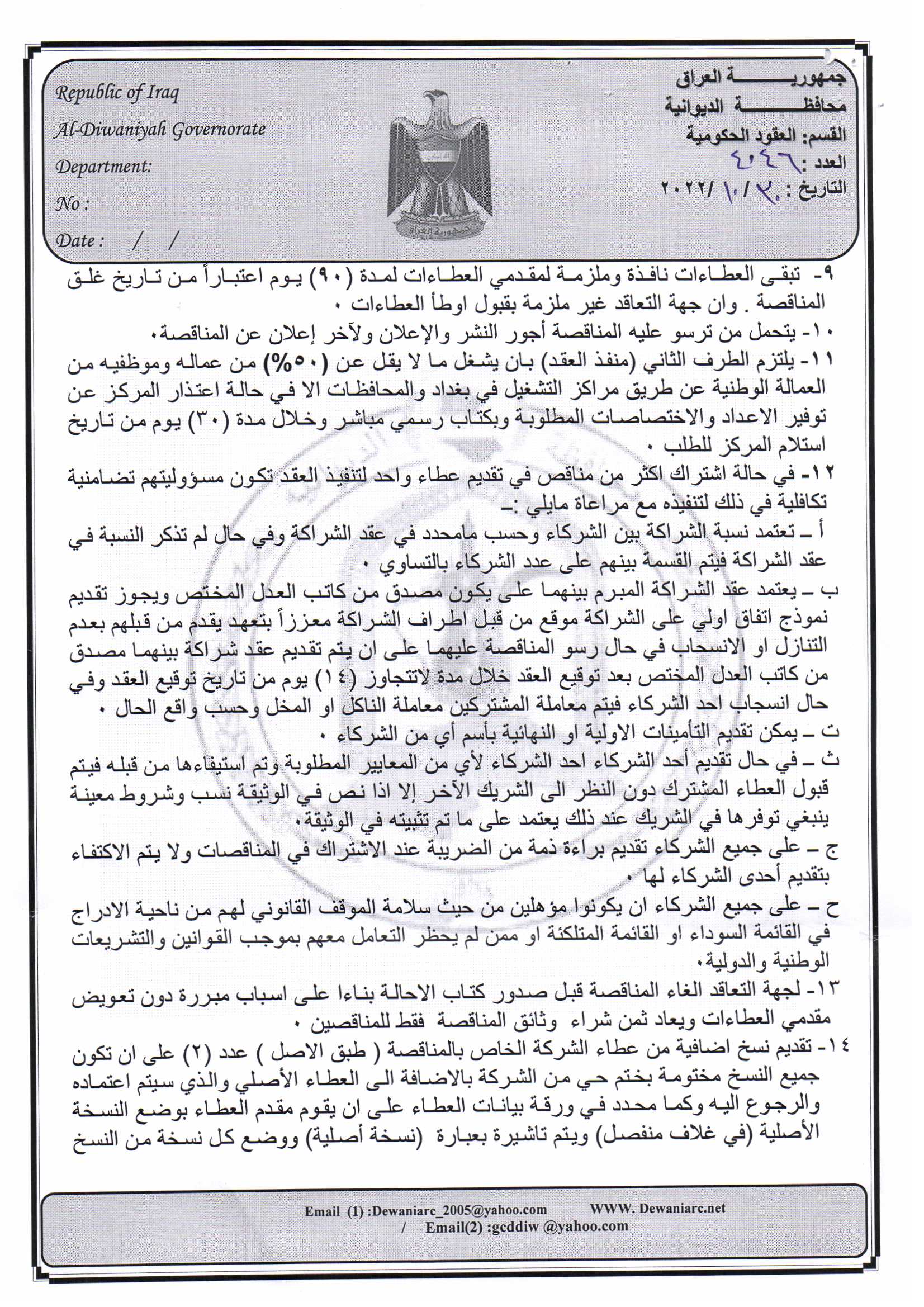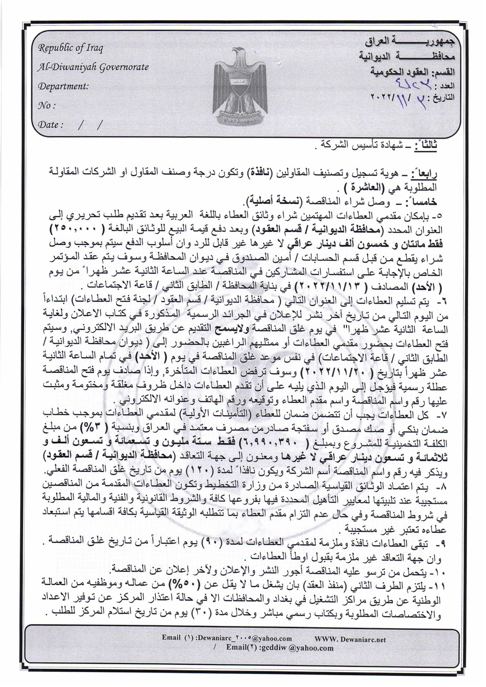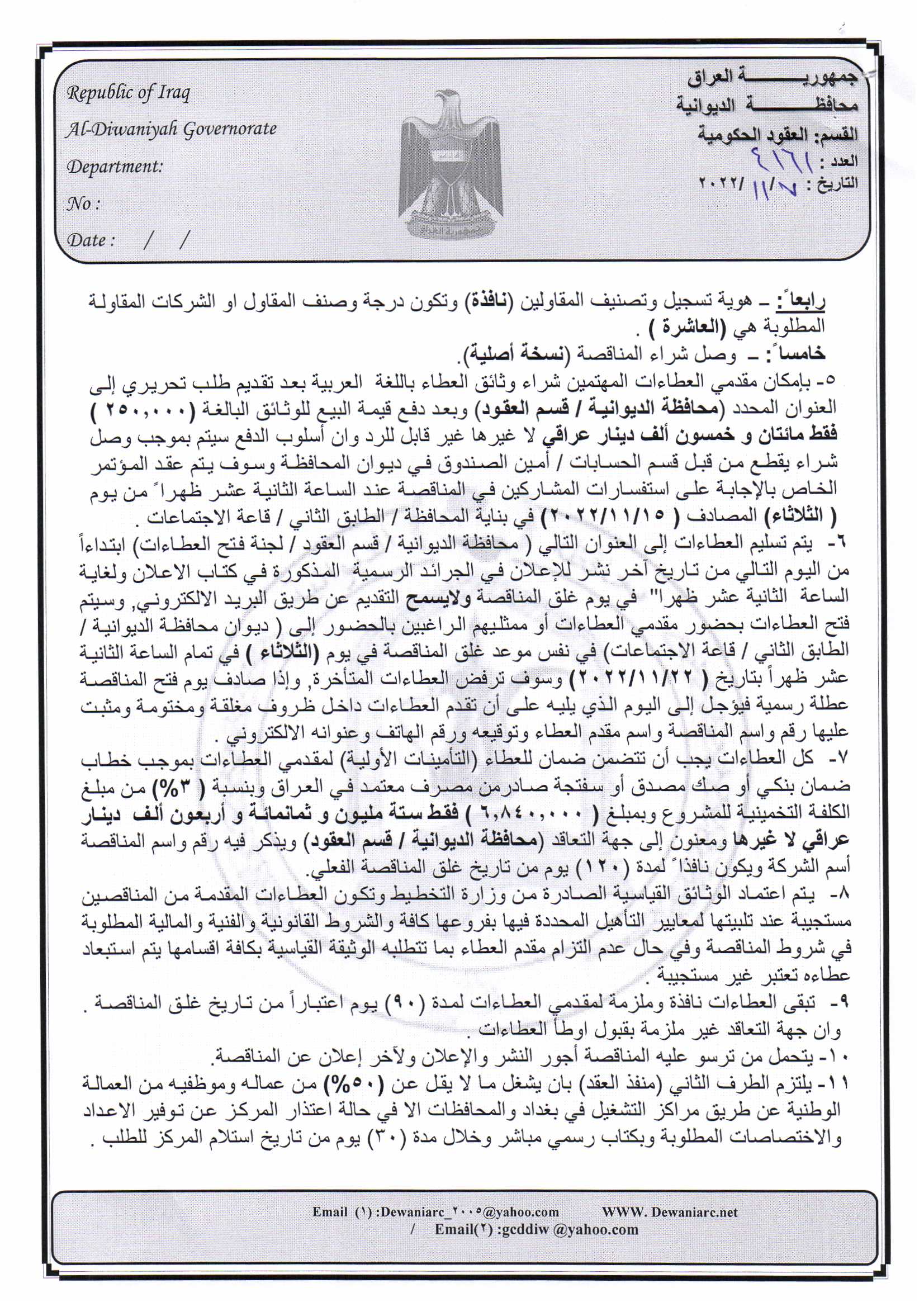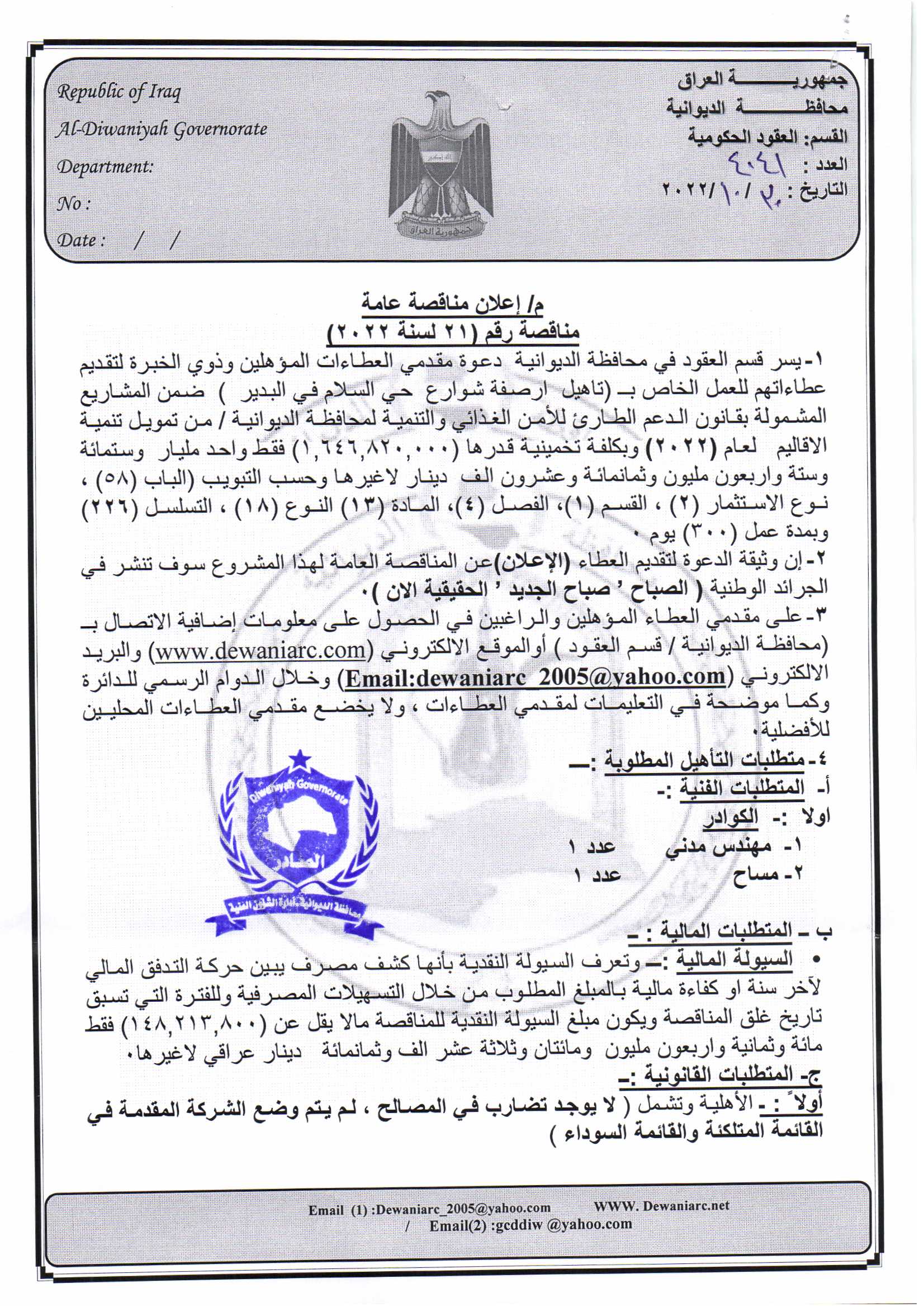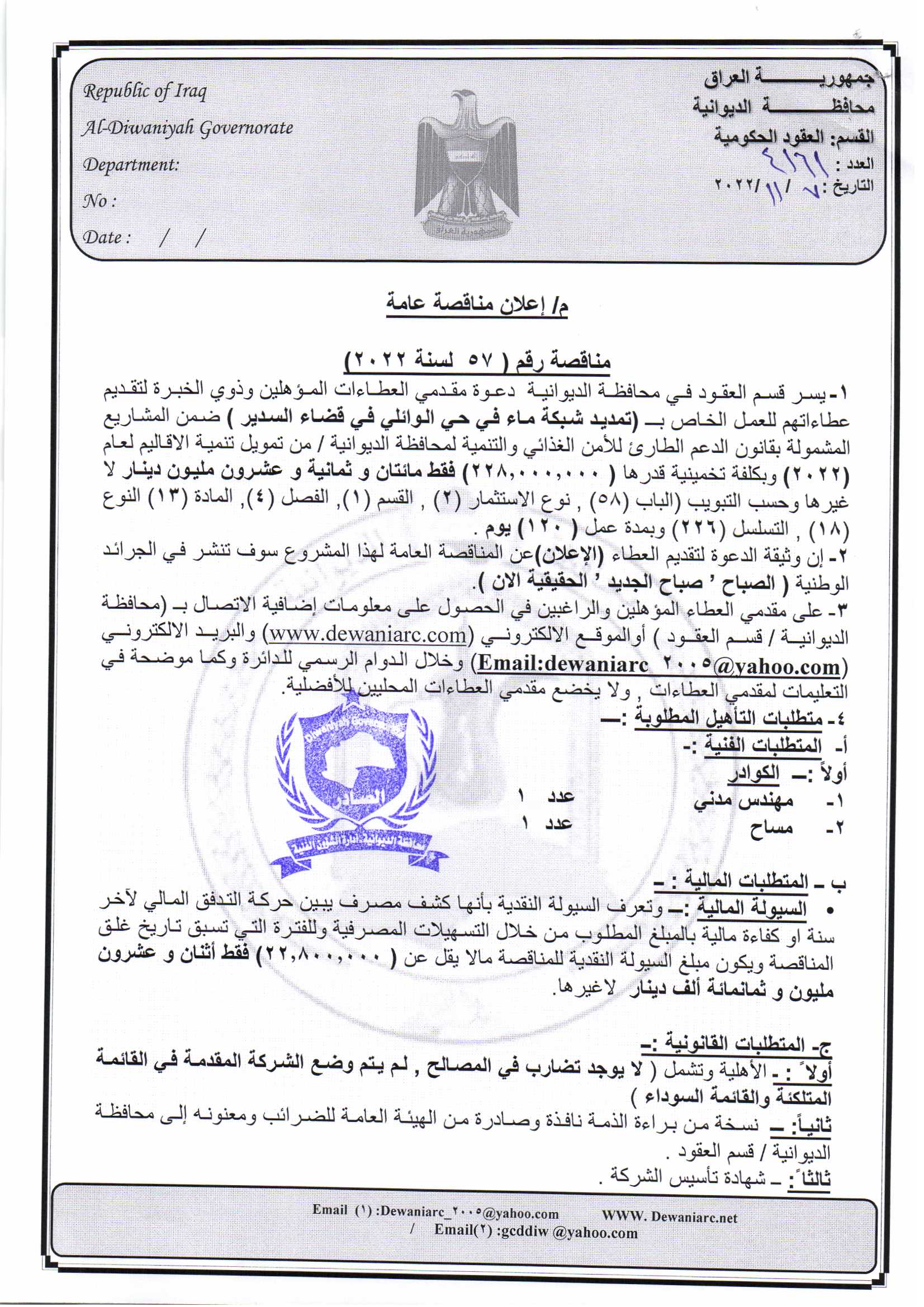 ﴿ إعلان مناقصة (46) لسنة 2022