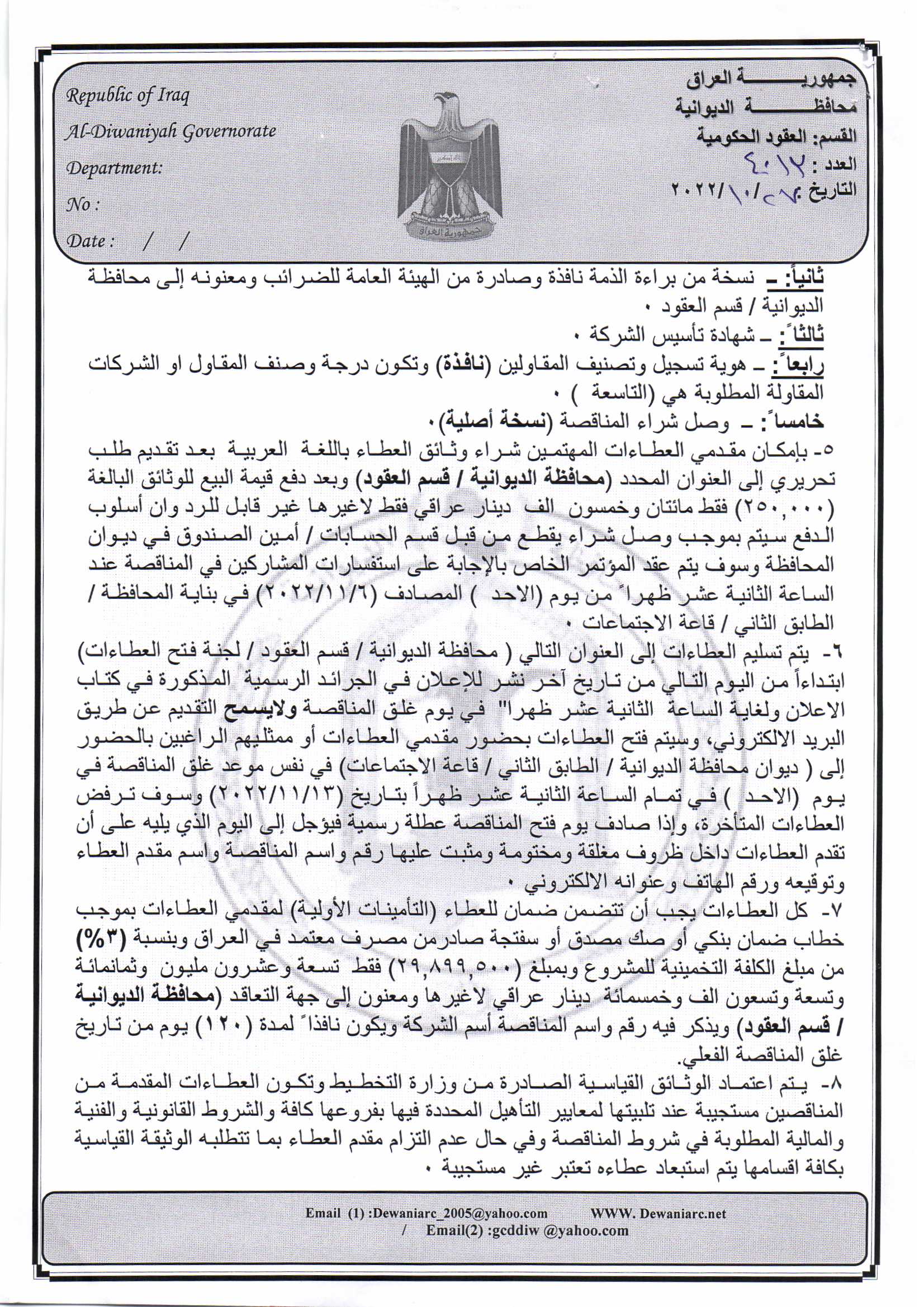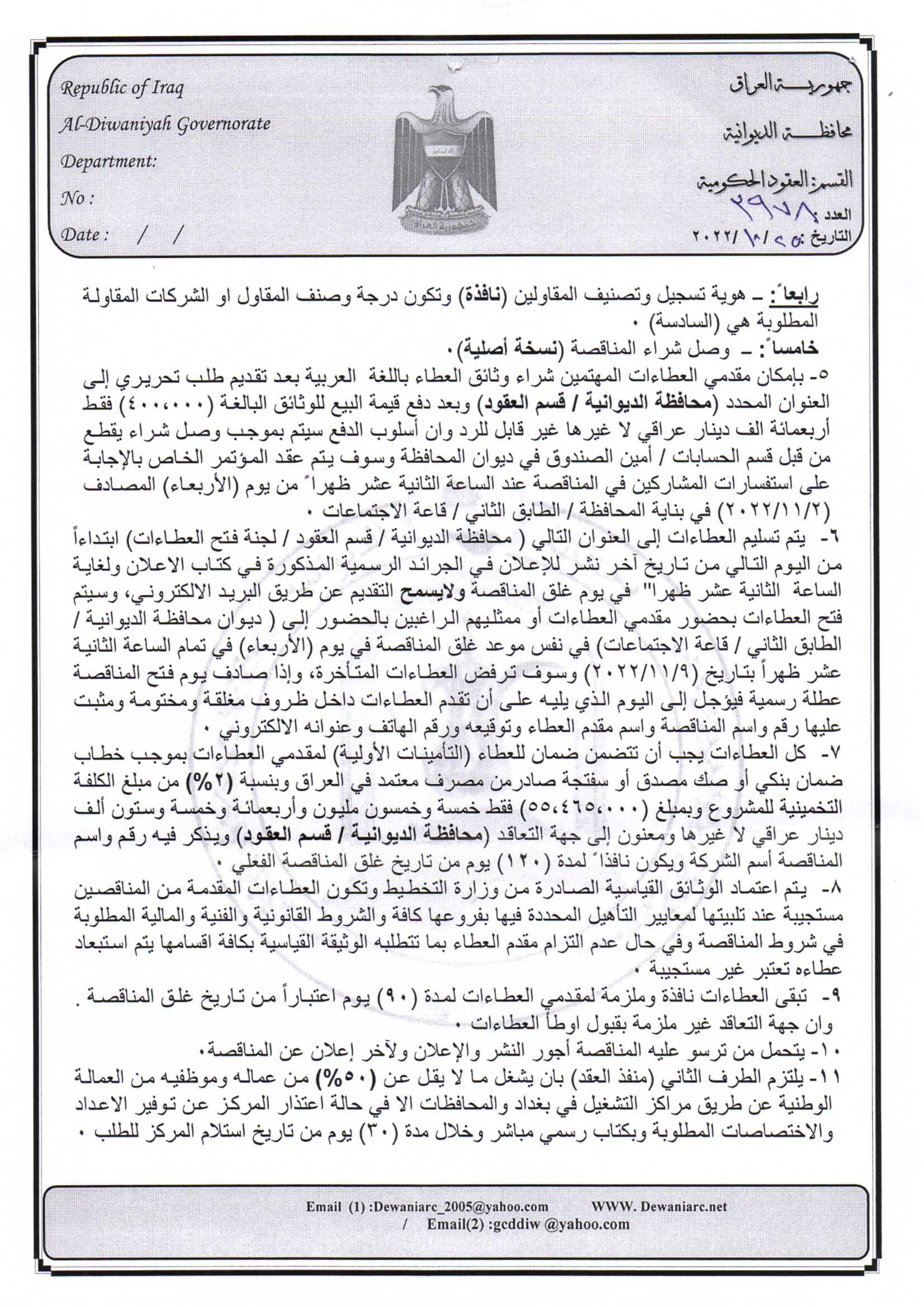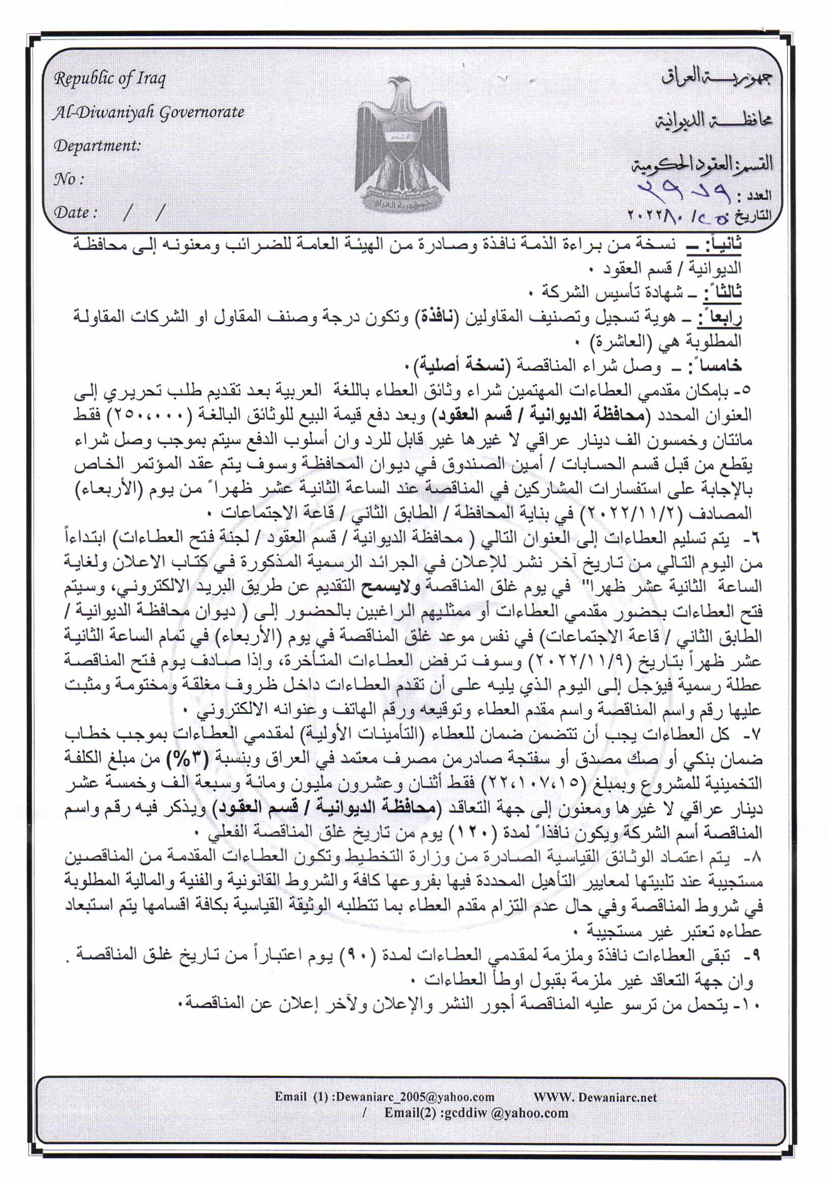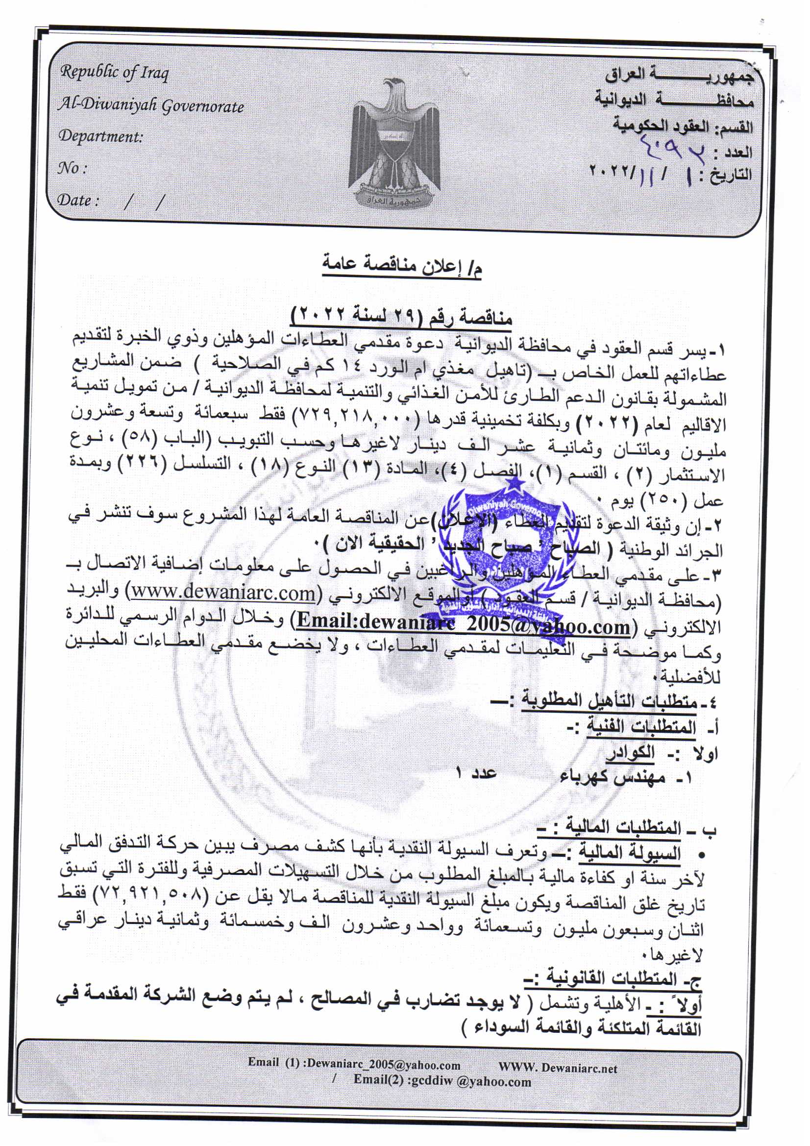 ﴿ إعلان مناقصة (29) لسنة 2022