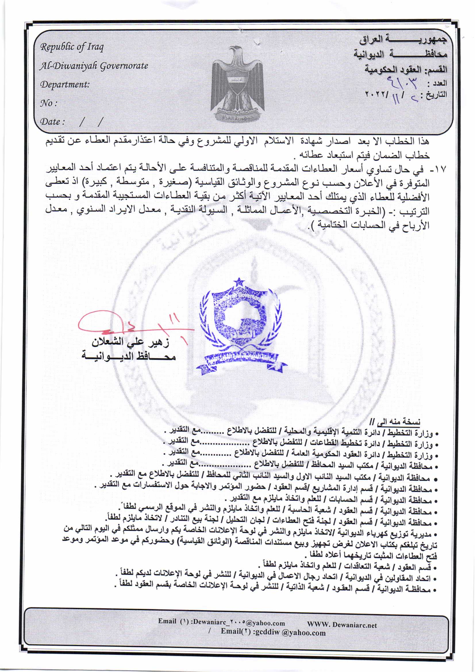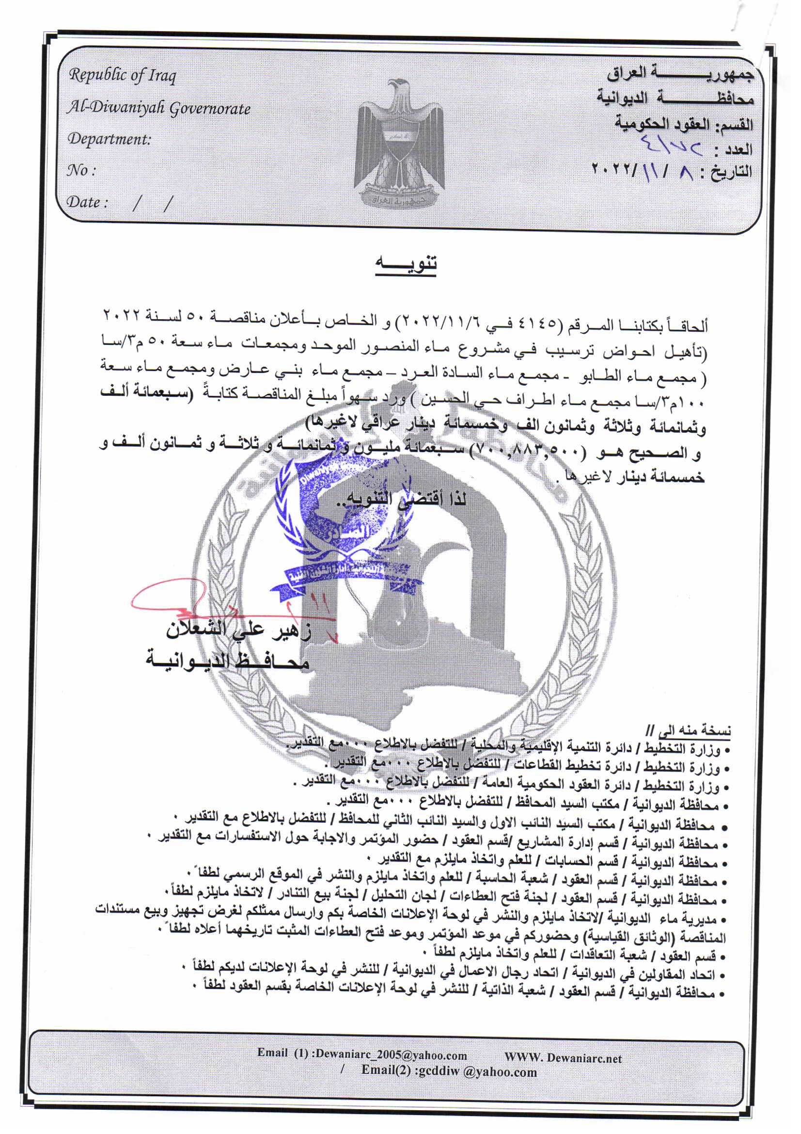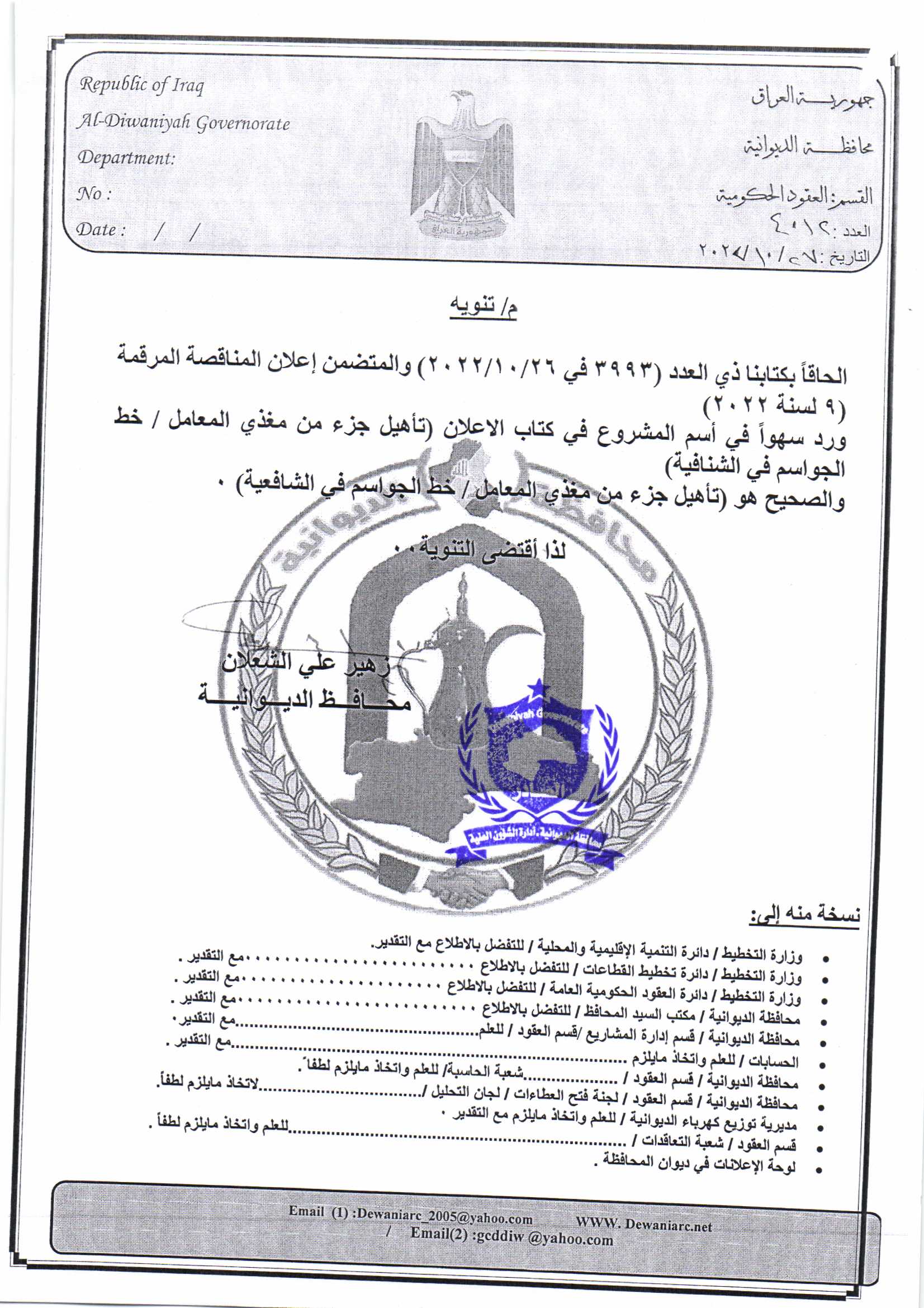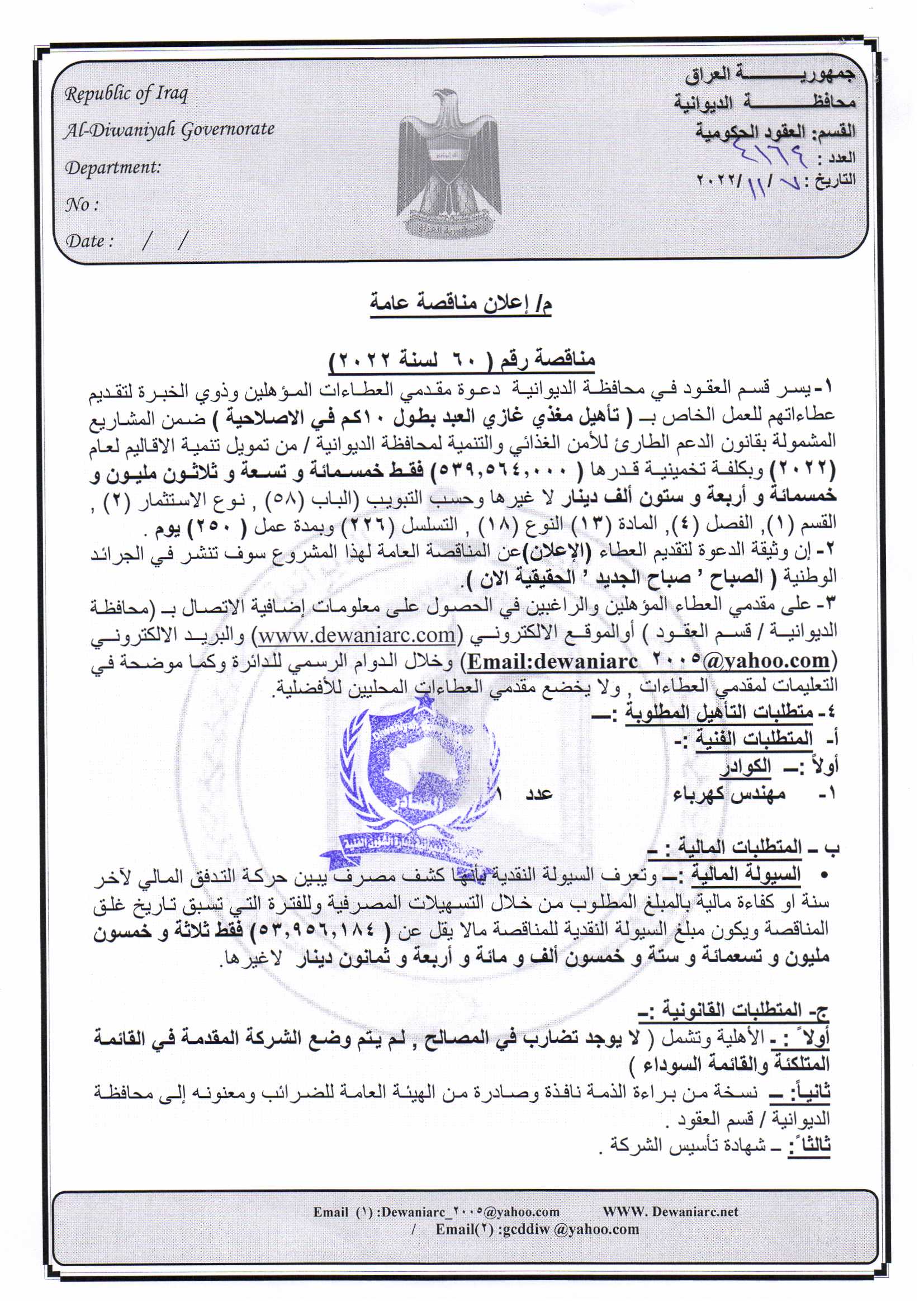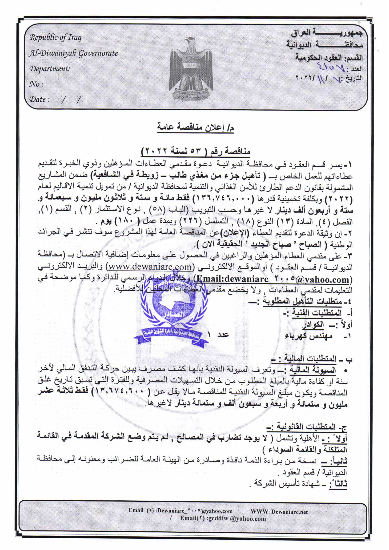 ﴿ إعلان مناقصة (53) لسنة 2022