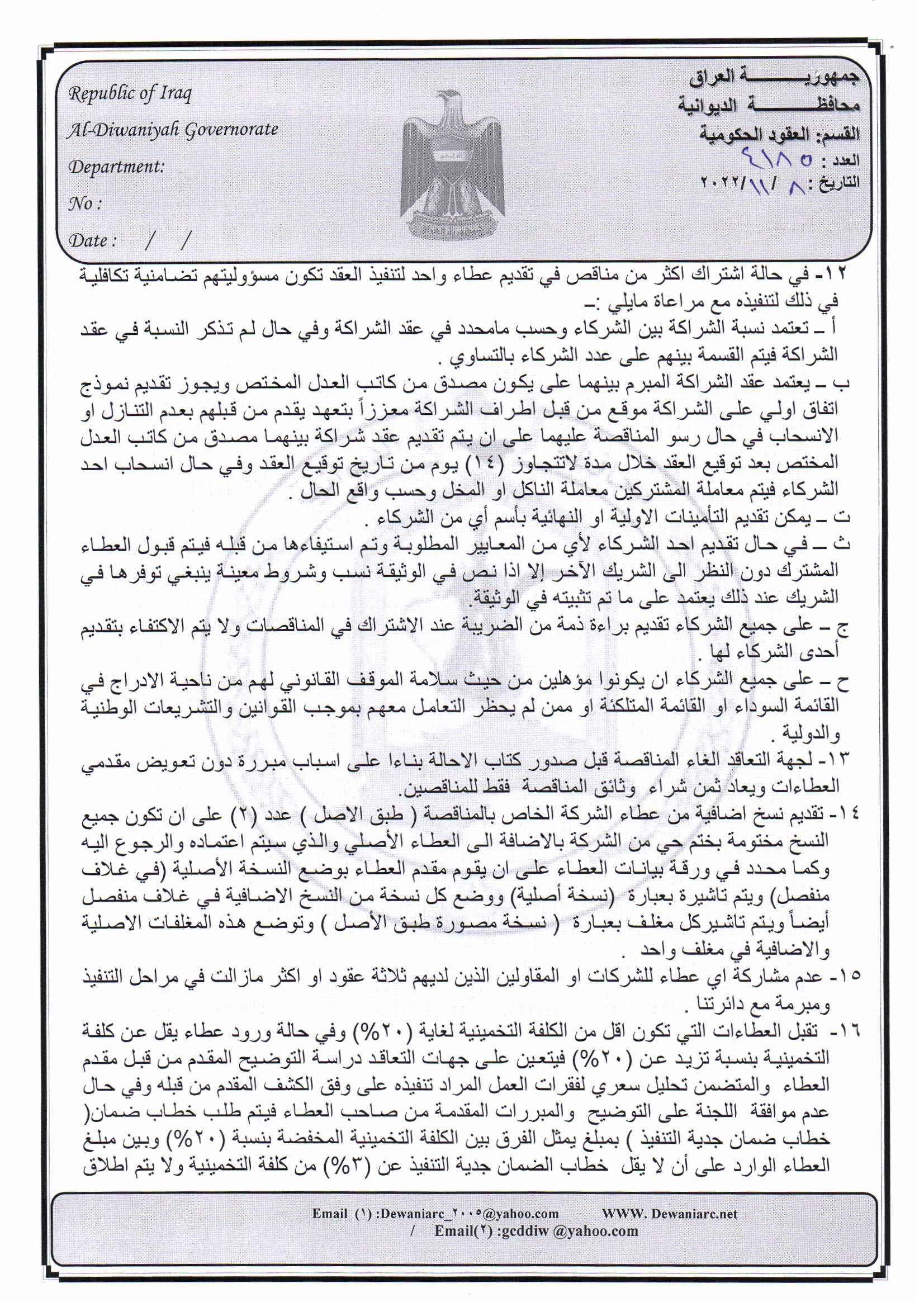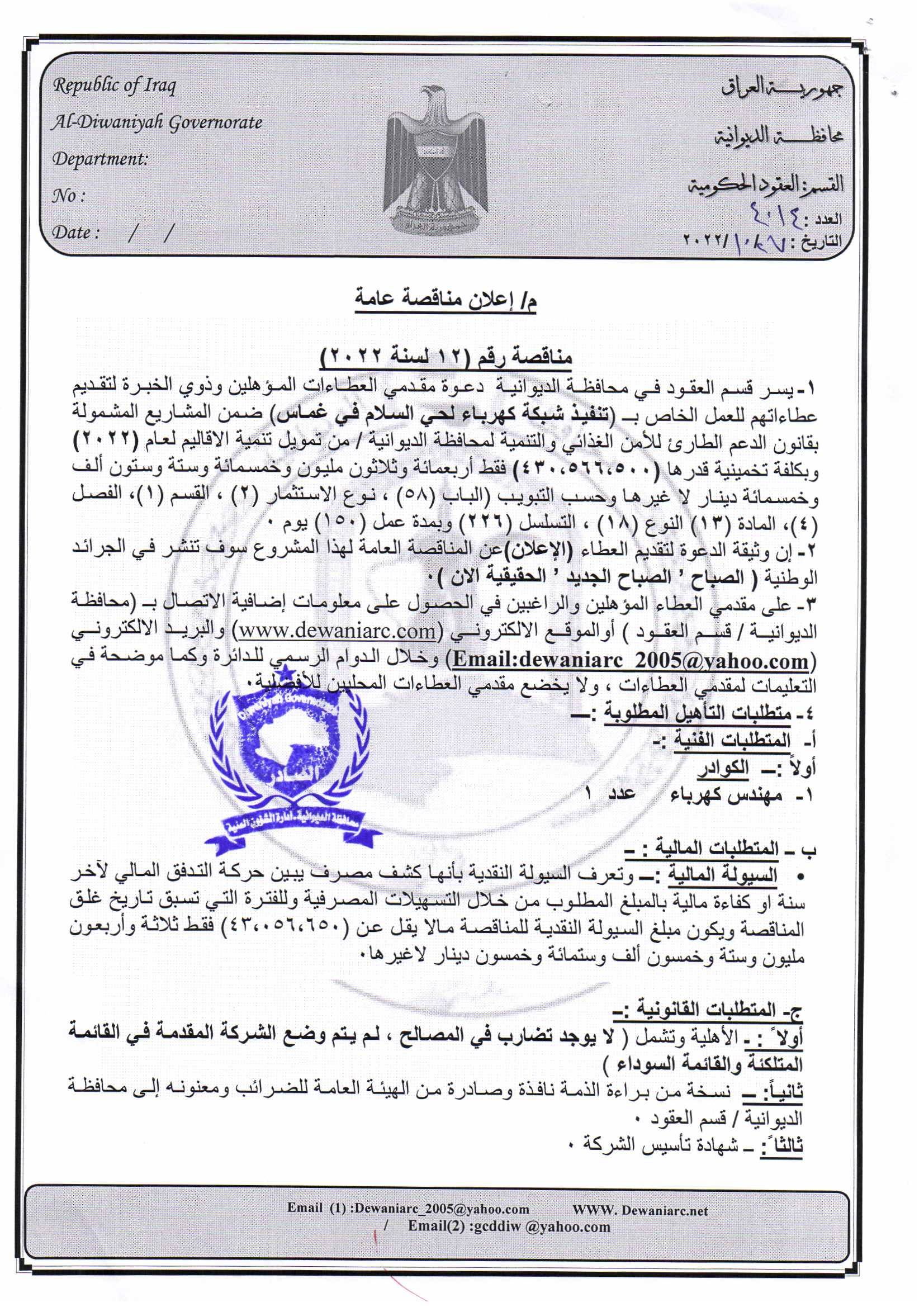 ﴿ إعلان مناقصة (12) لسنة 2022