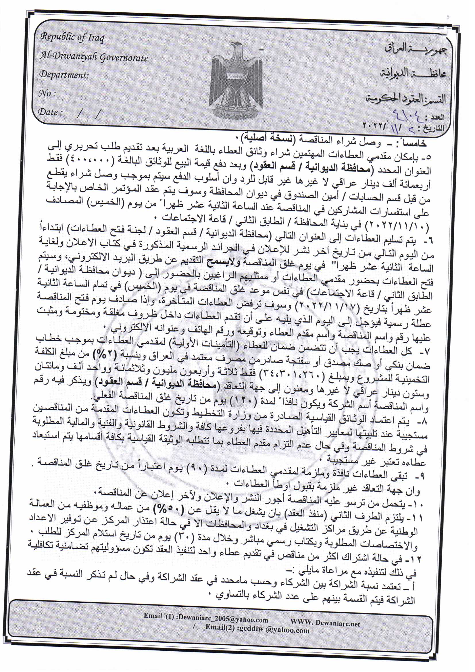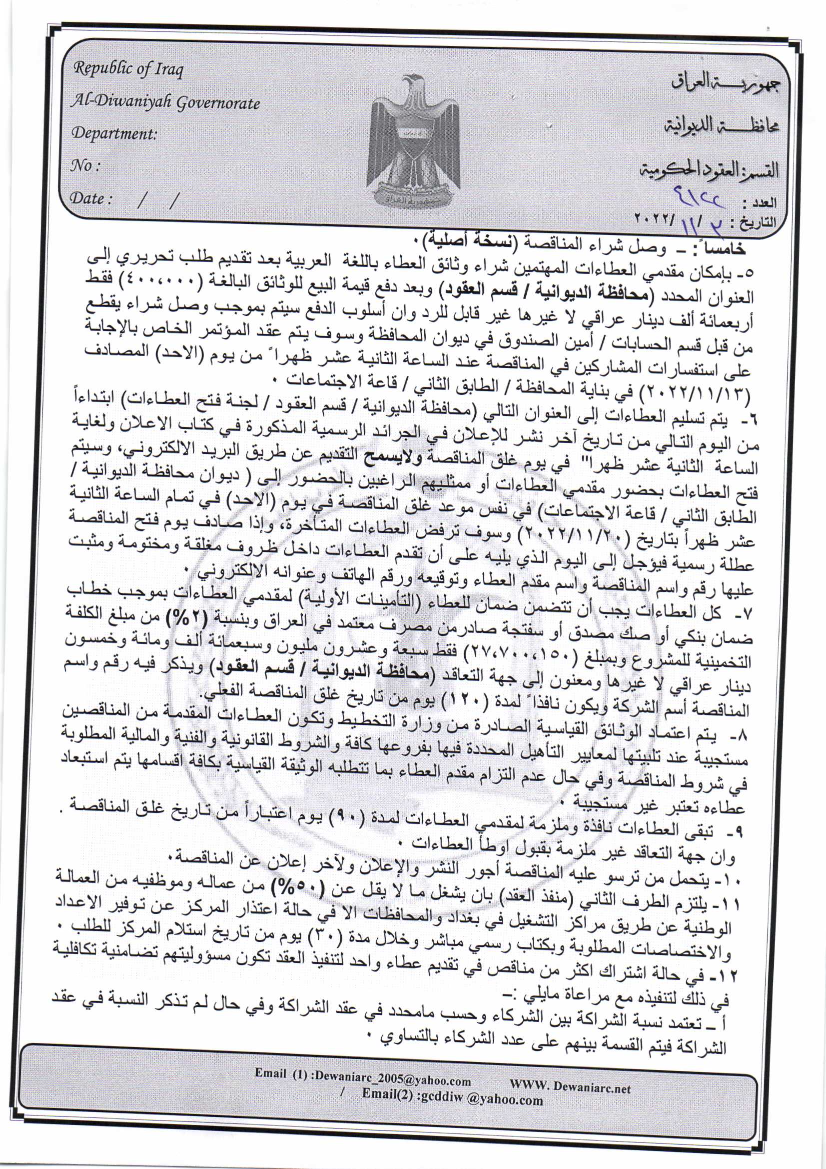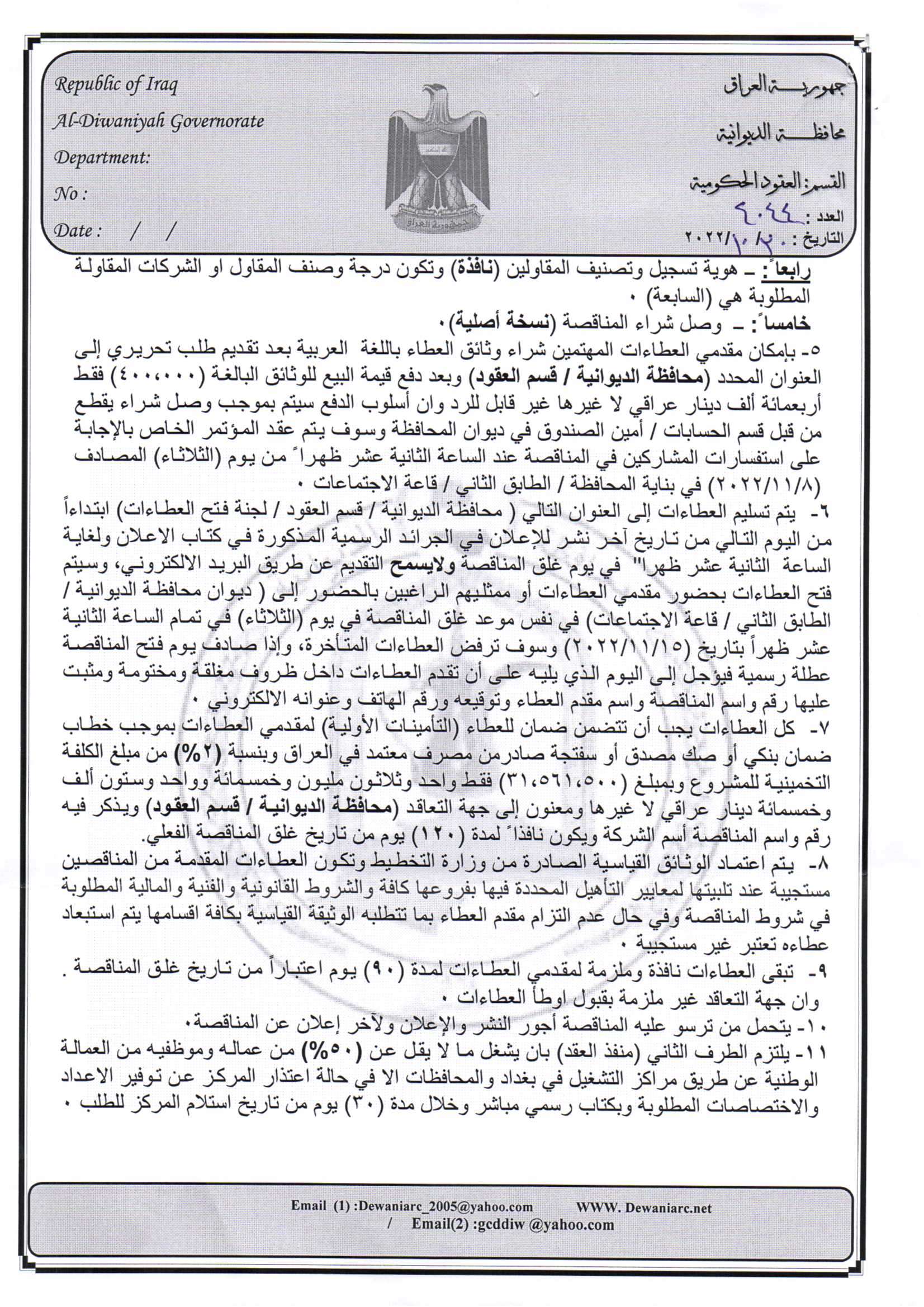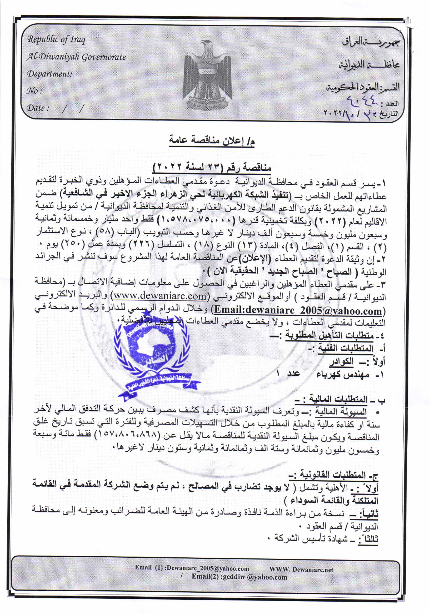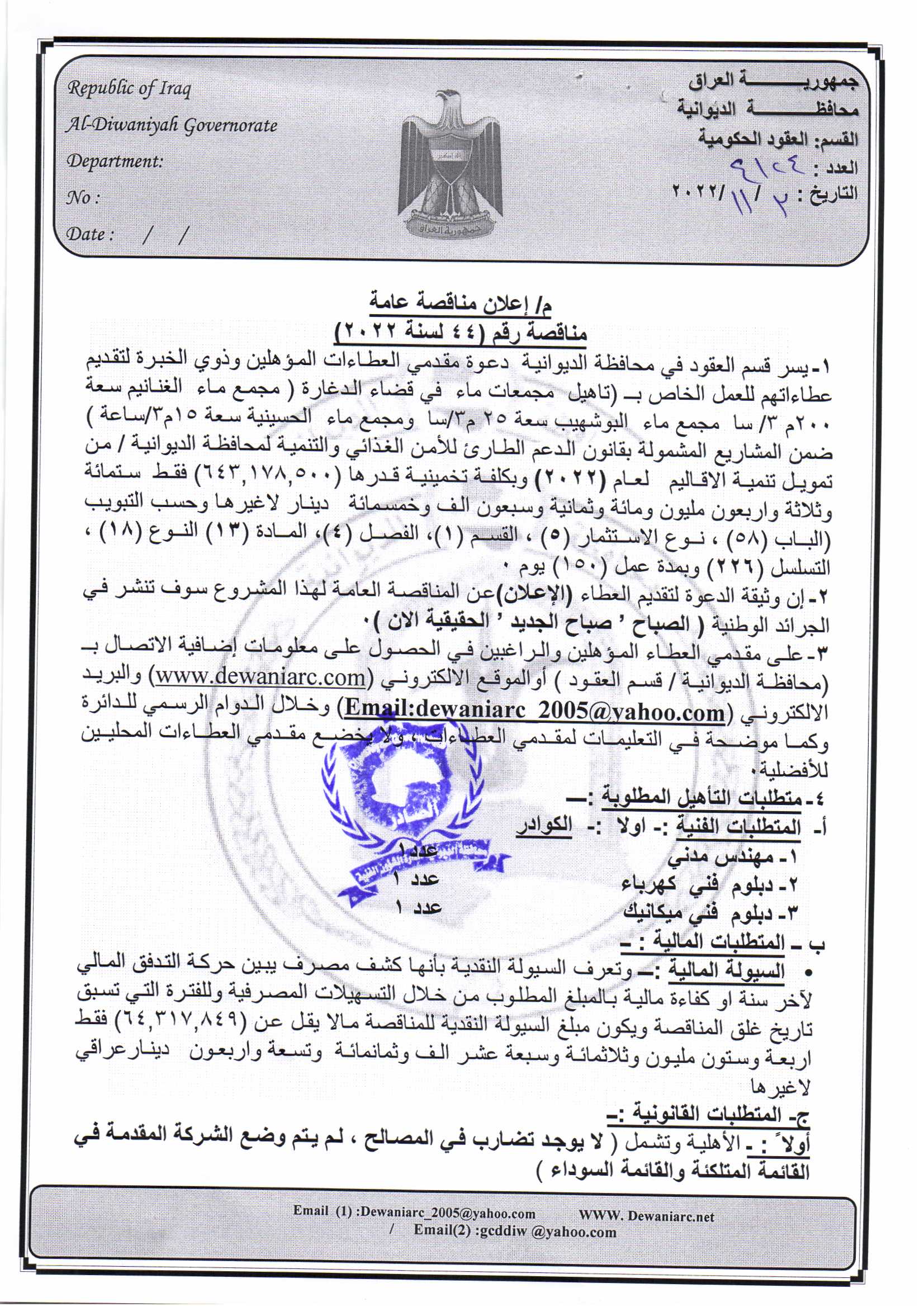 ﴿ إعلان مناقصة (44) لسنة 2022