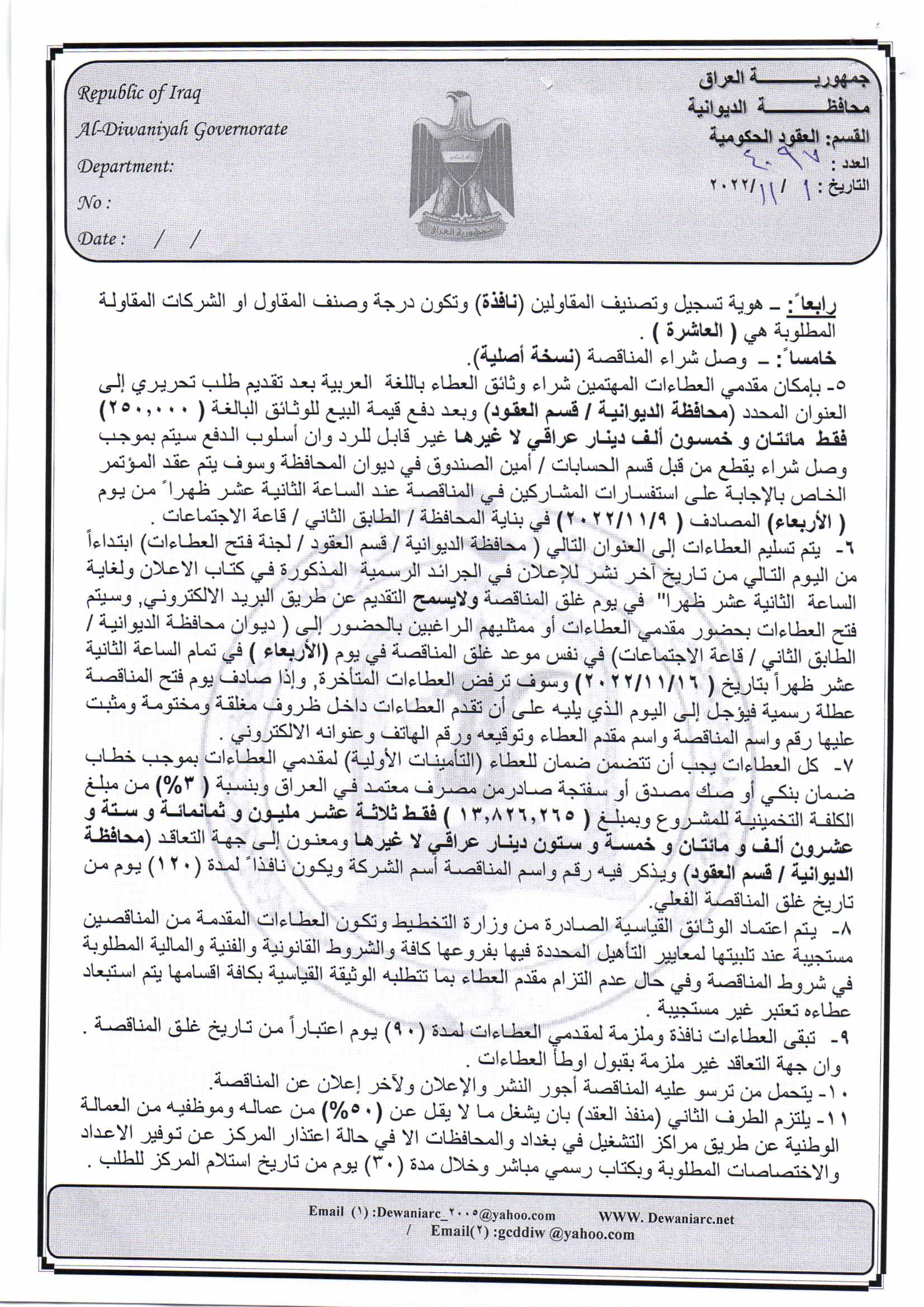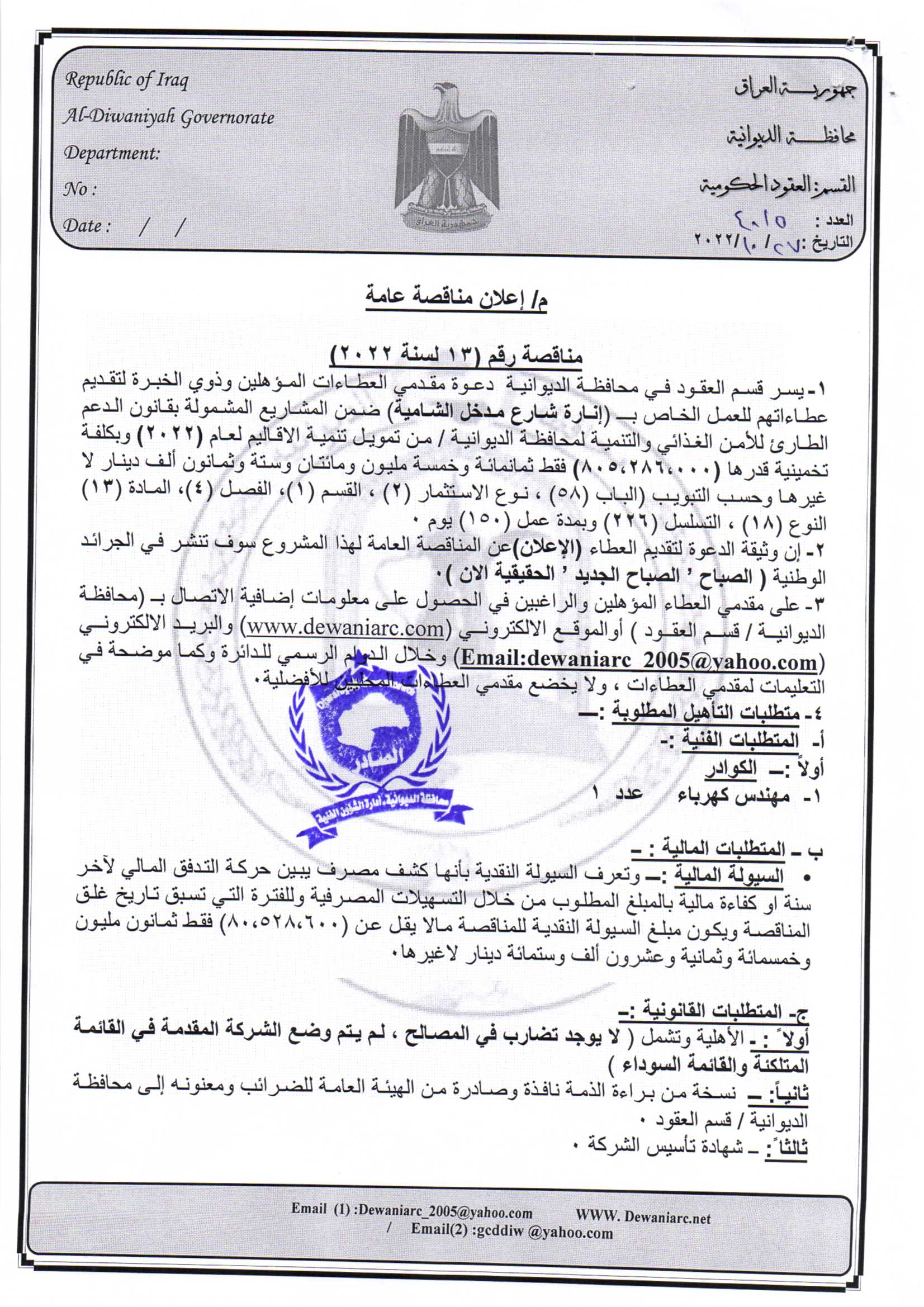 ﴿ إعلان مناقصة (13) لسنة 2022