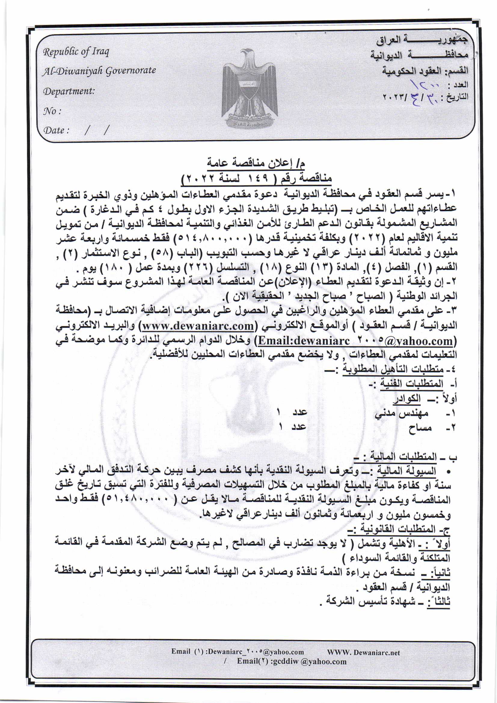﴿ إعلان مناقصة (149) لسنة 2022