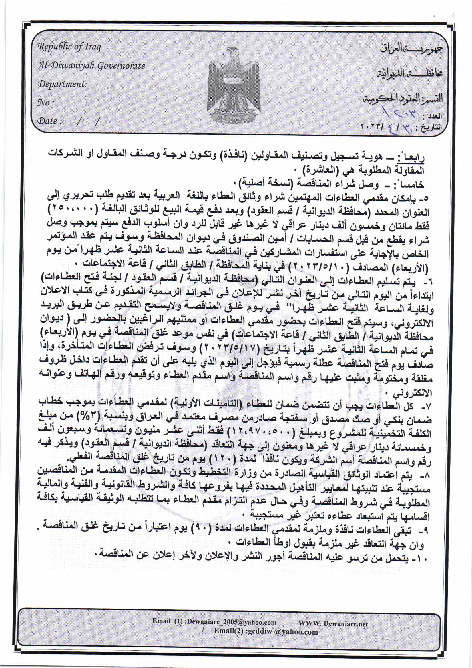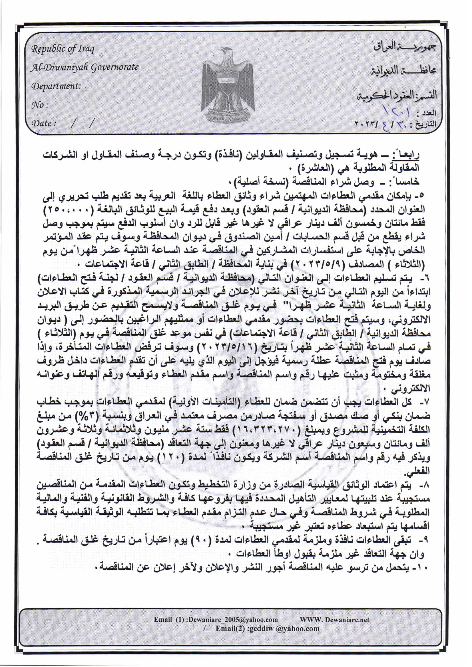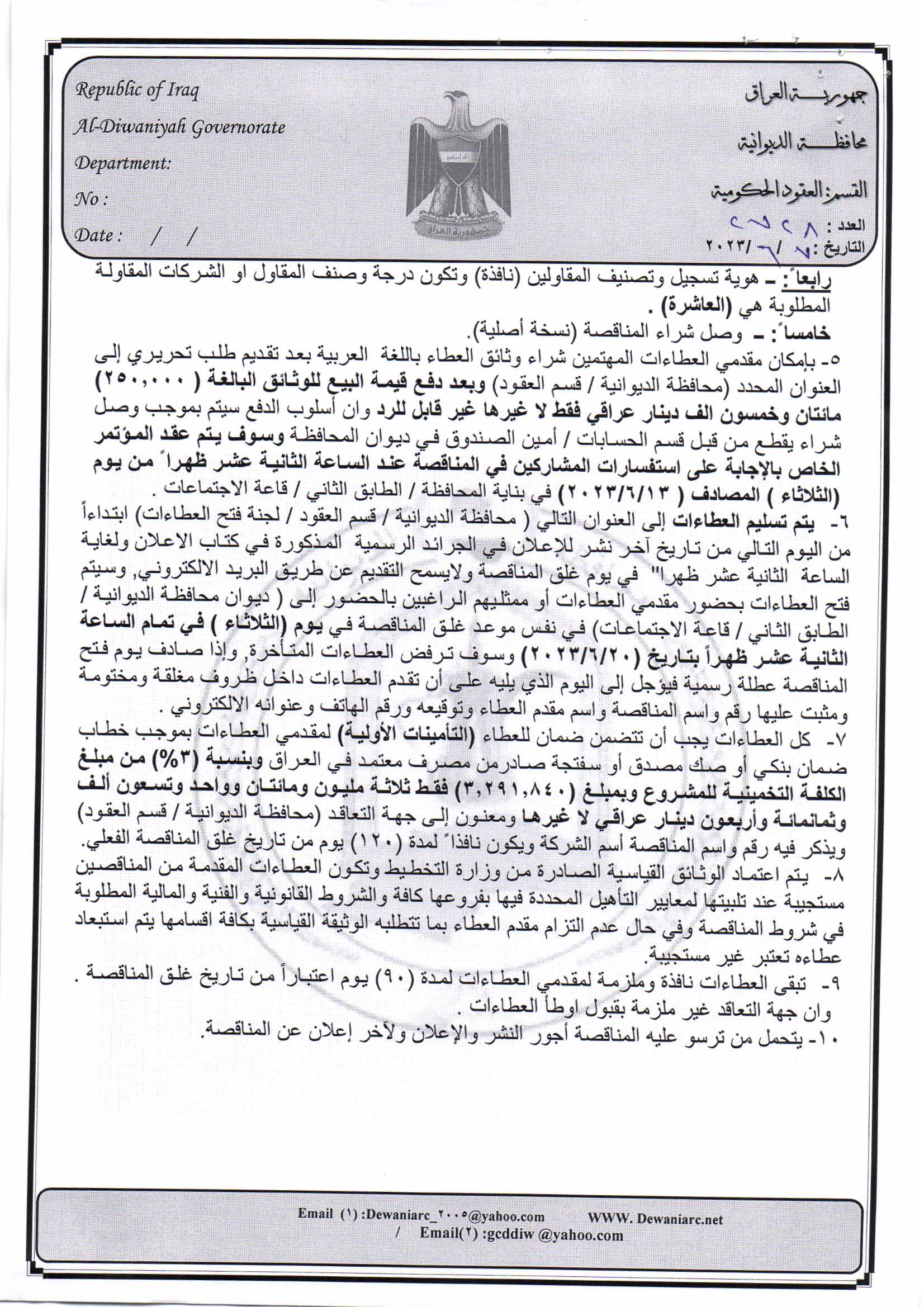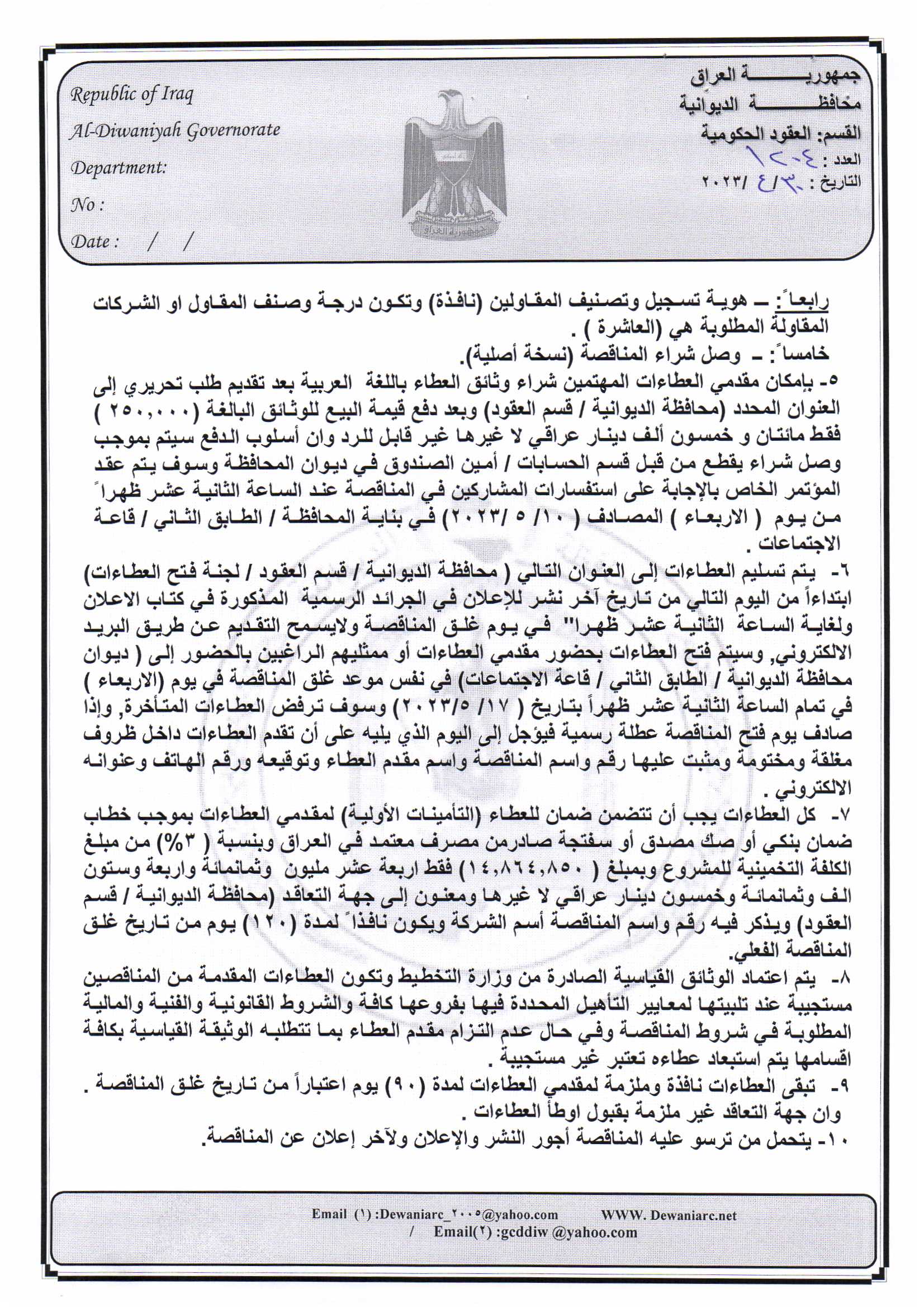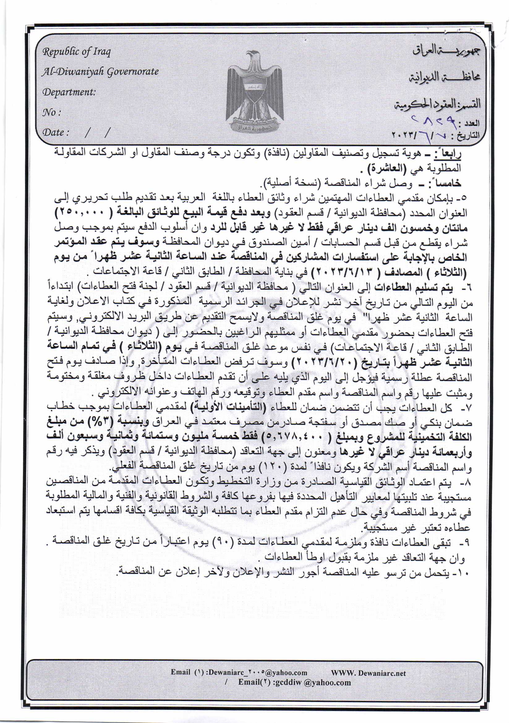 ﴿ إعلان مناقصة (23) لسنة 2022