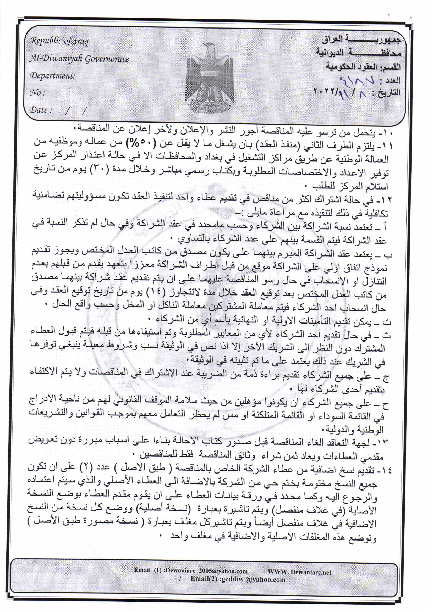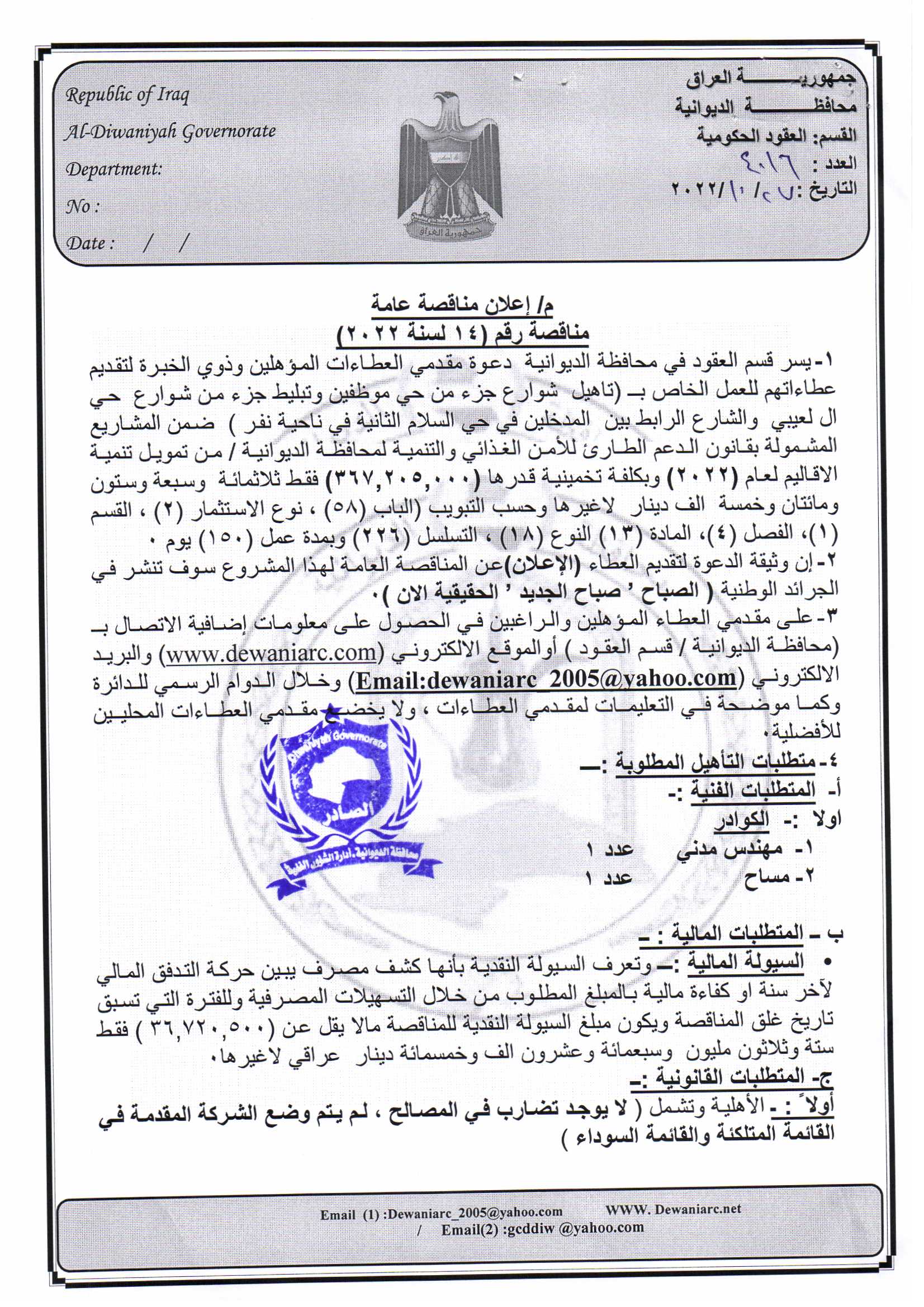 ﴿ إعلان مناقصة (14) لسنة 2022