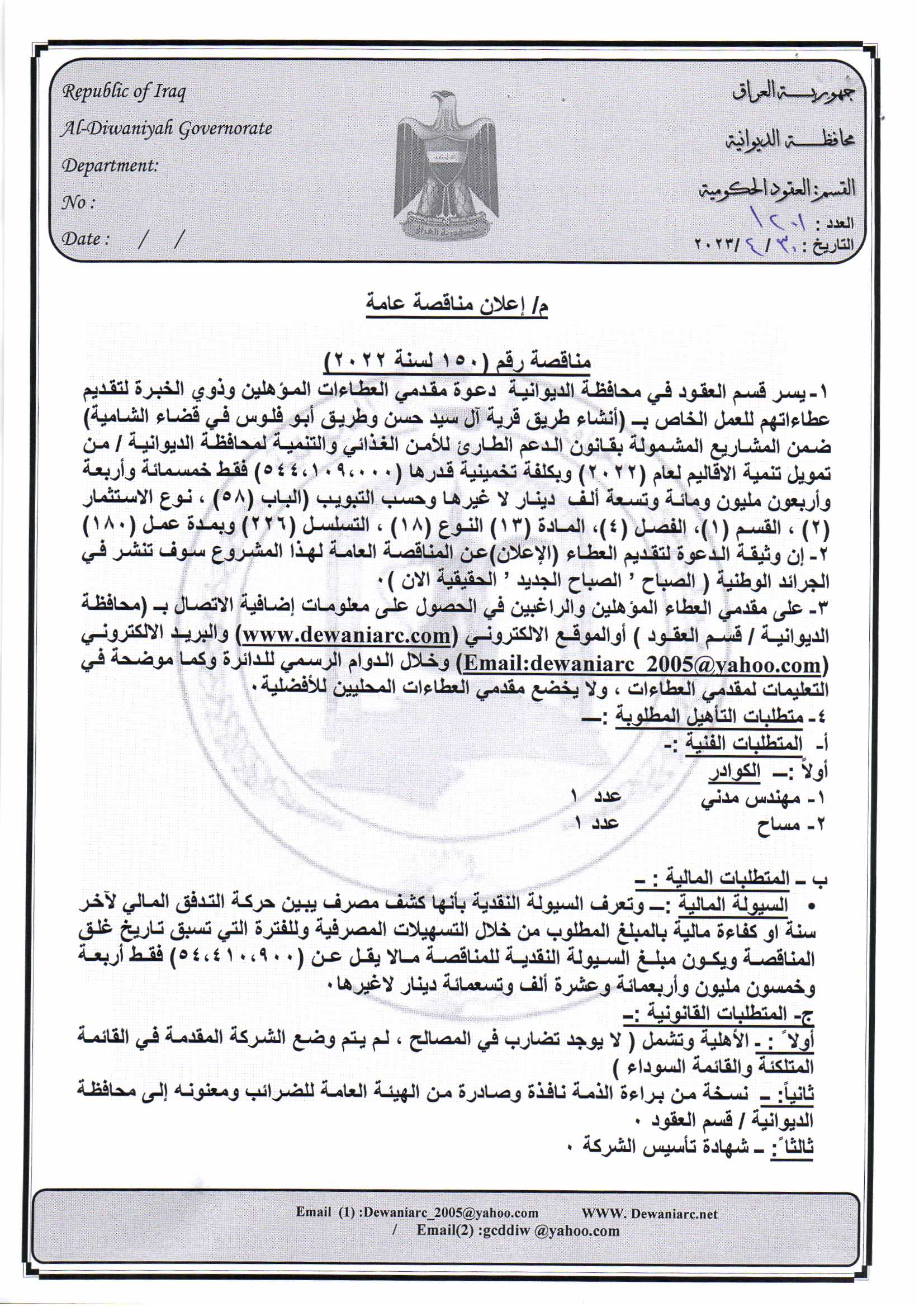 ﴿ إعلان مناقصة (150) لسنة 2022