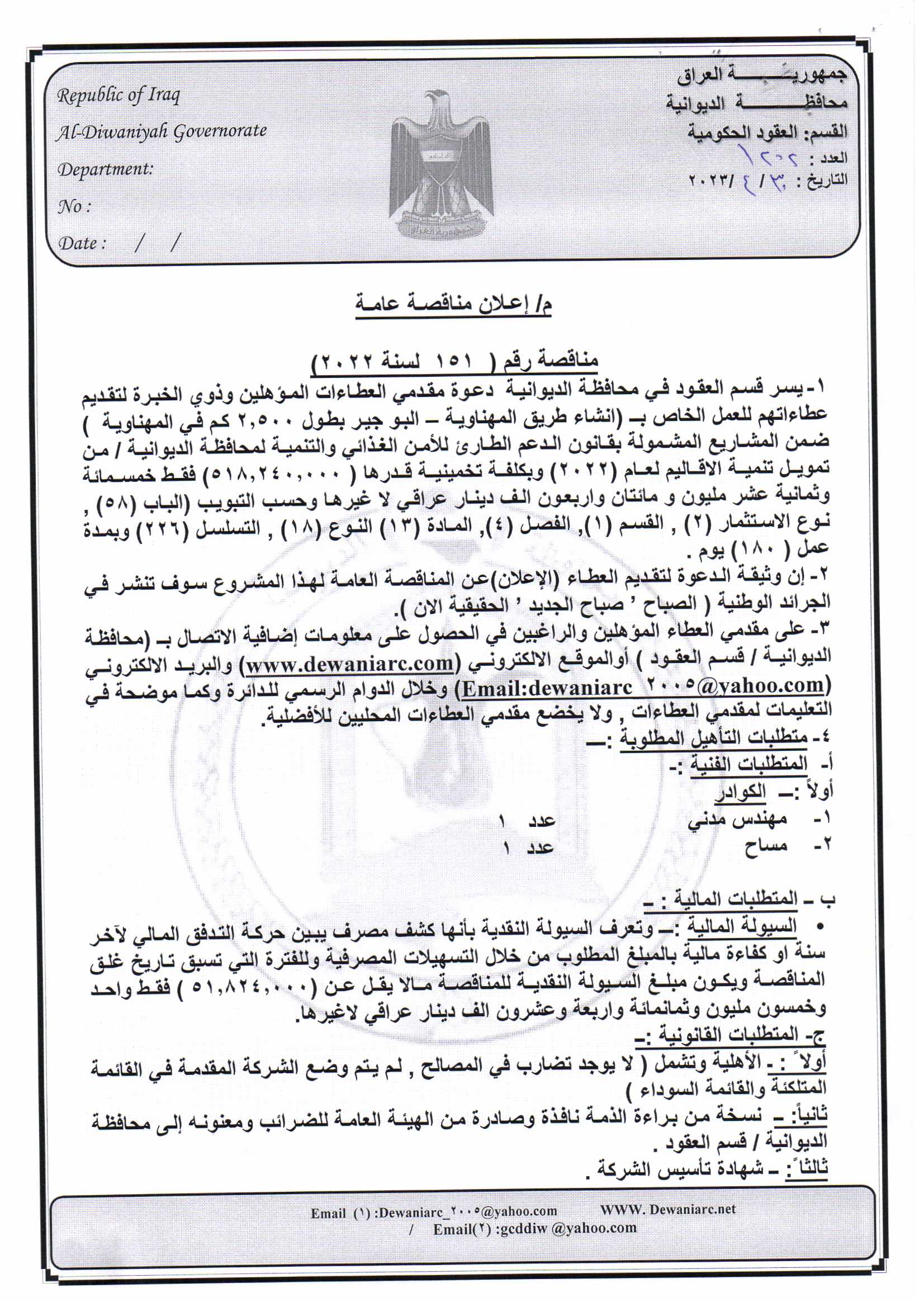 ﴿ إعلان مناقصة (151) لسنة 2022