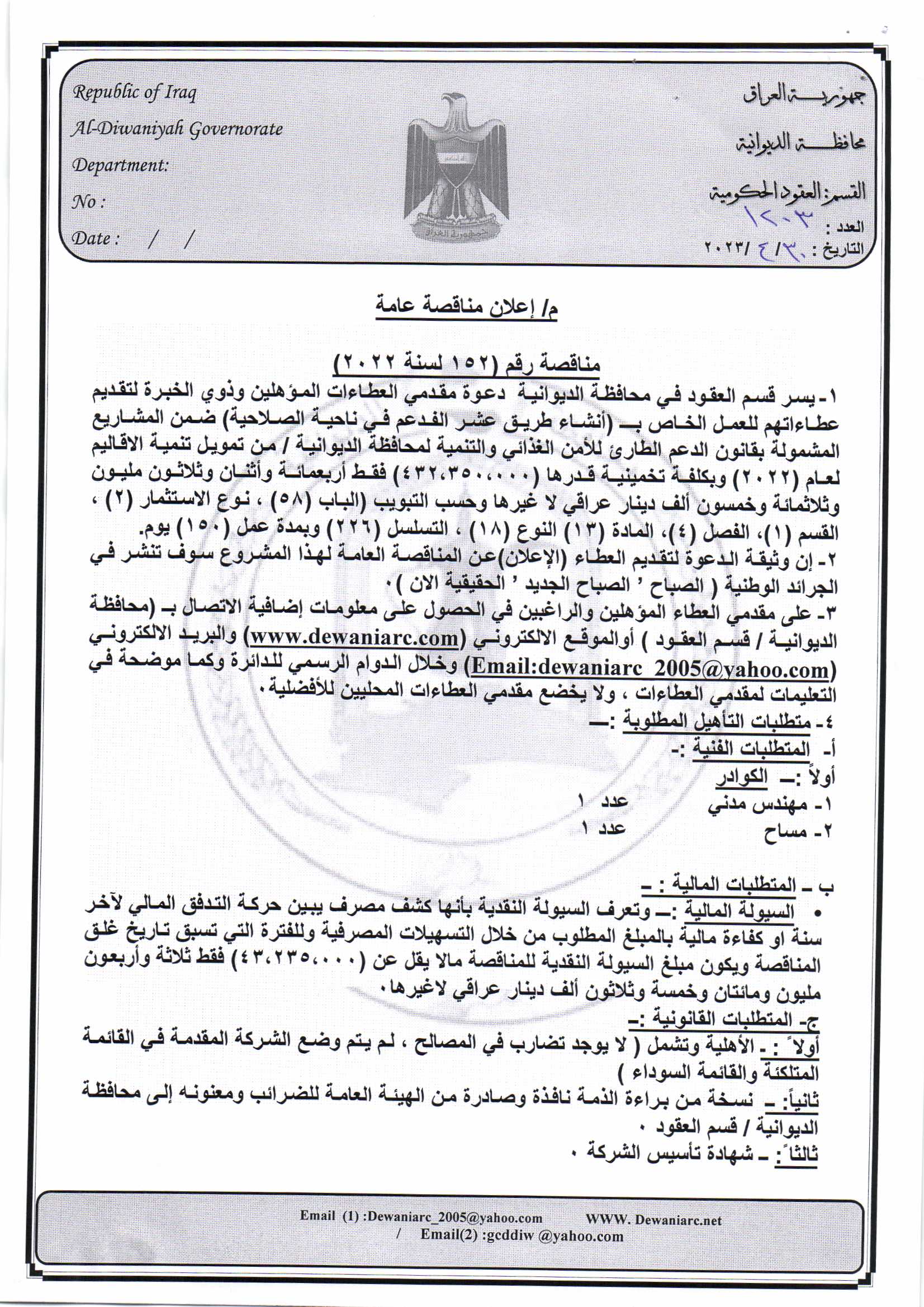 ﴿ إعلان مناقصة (152) لسنة 2022
