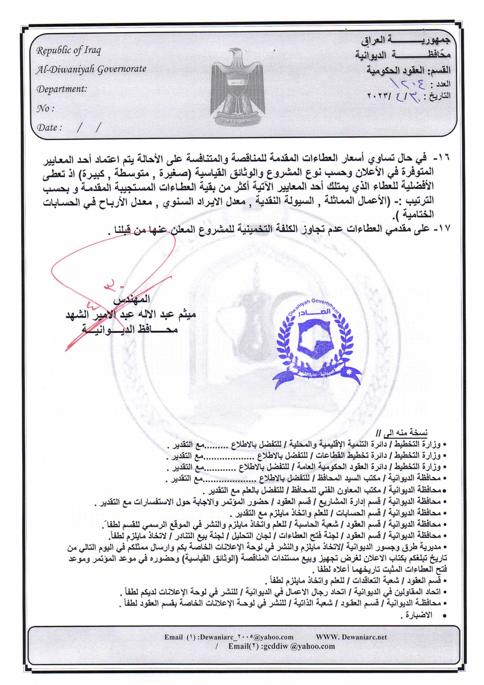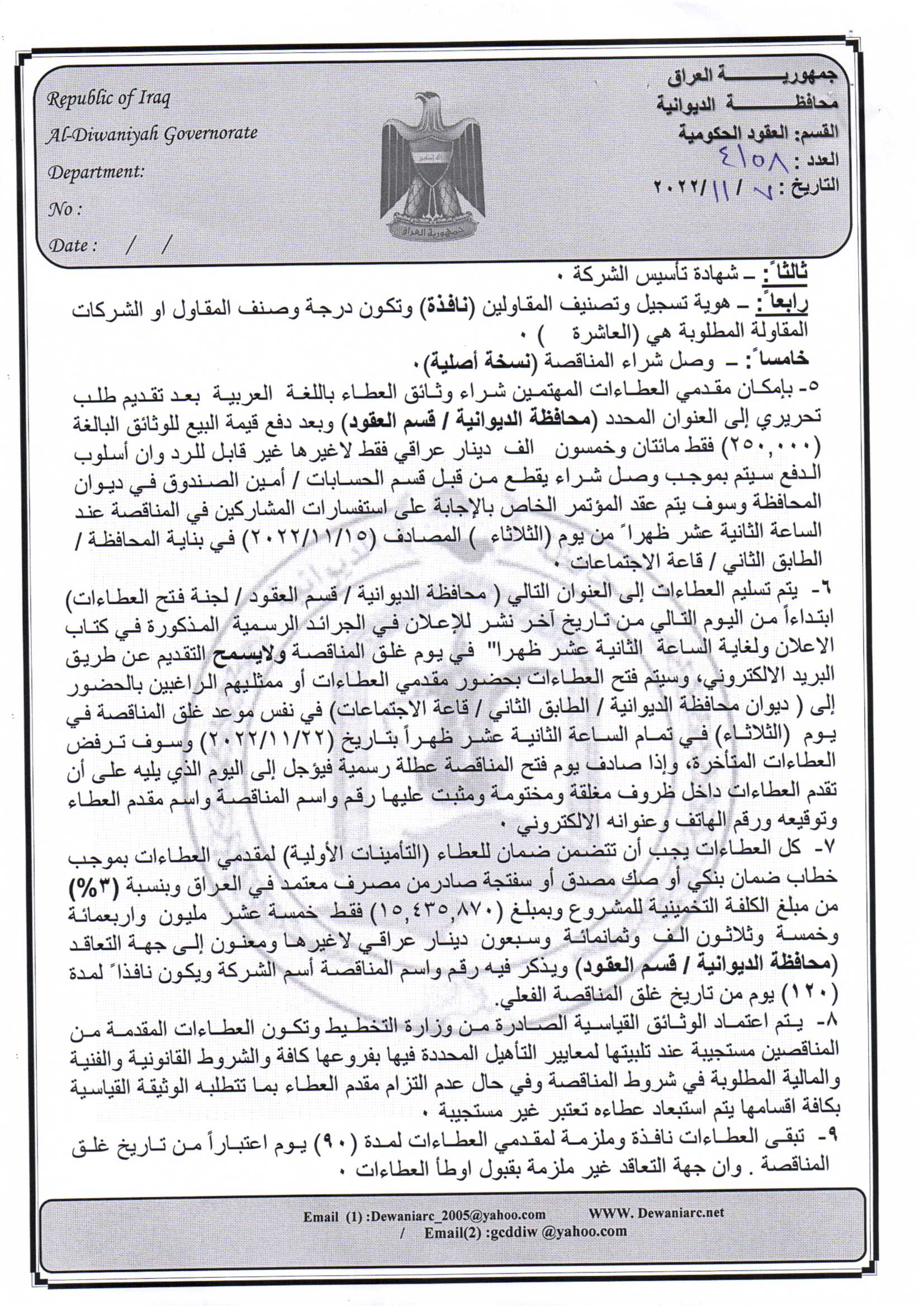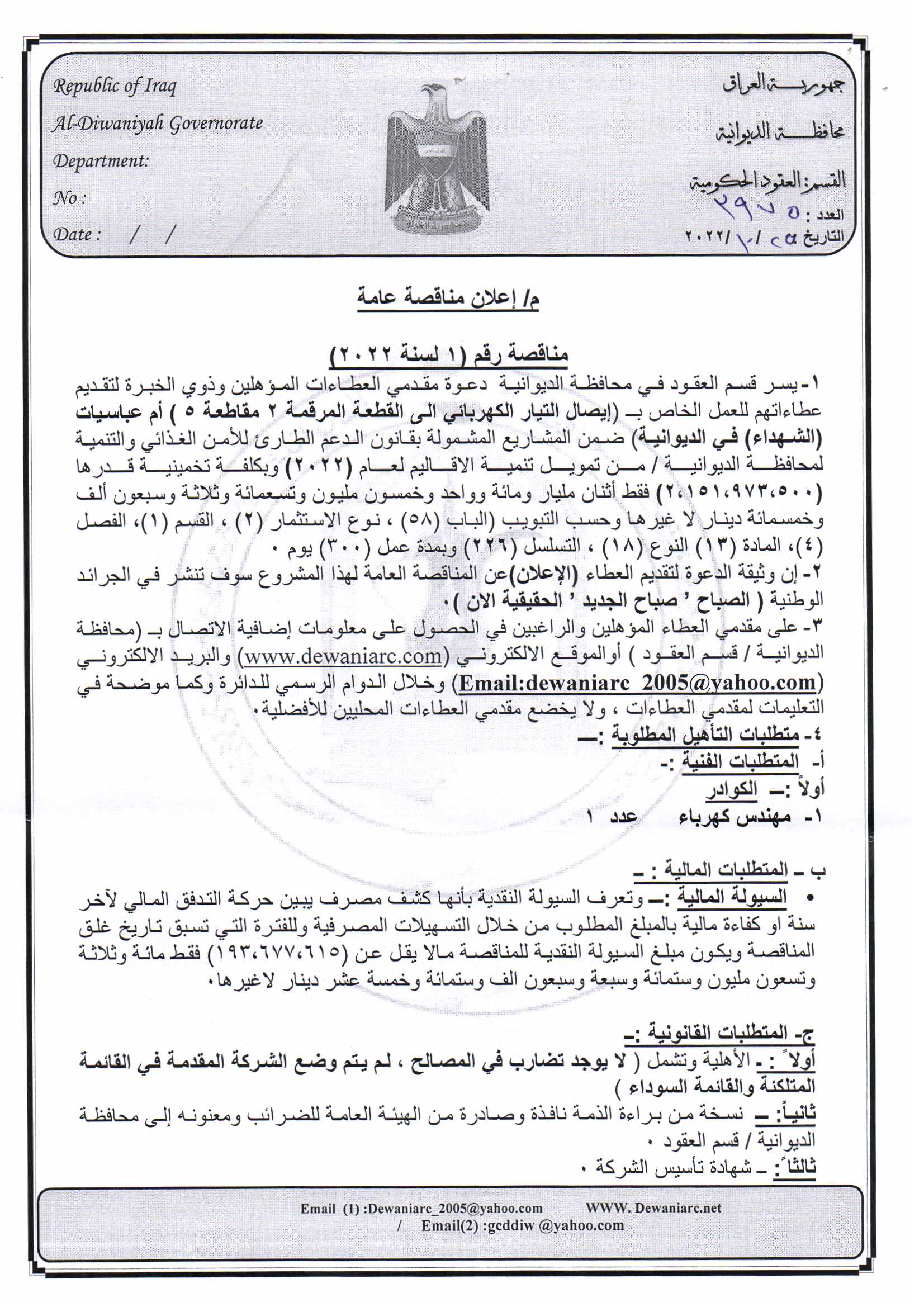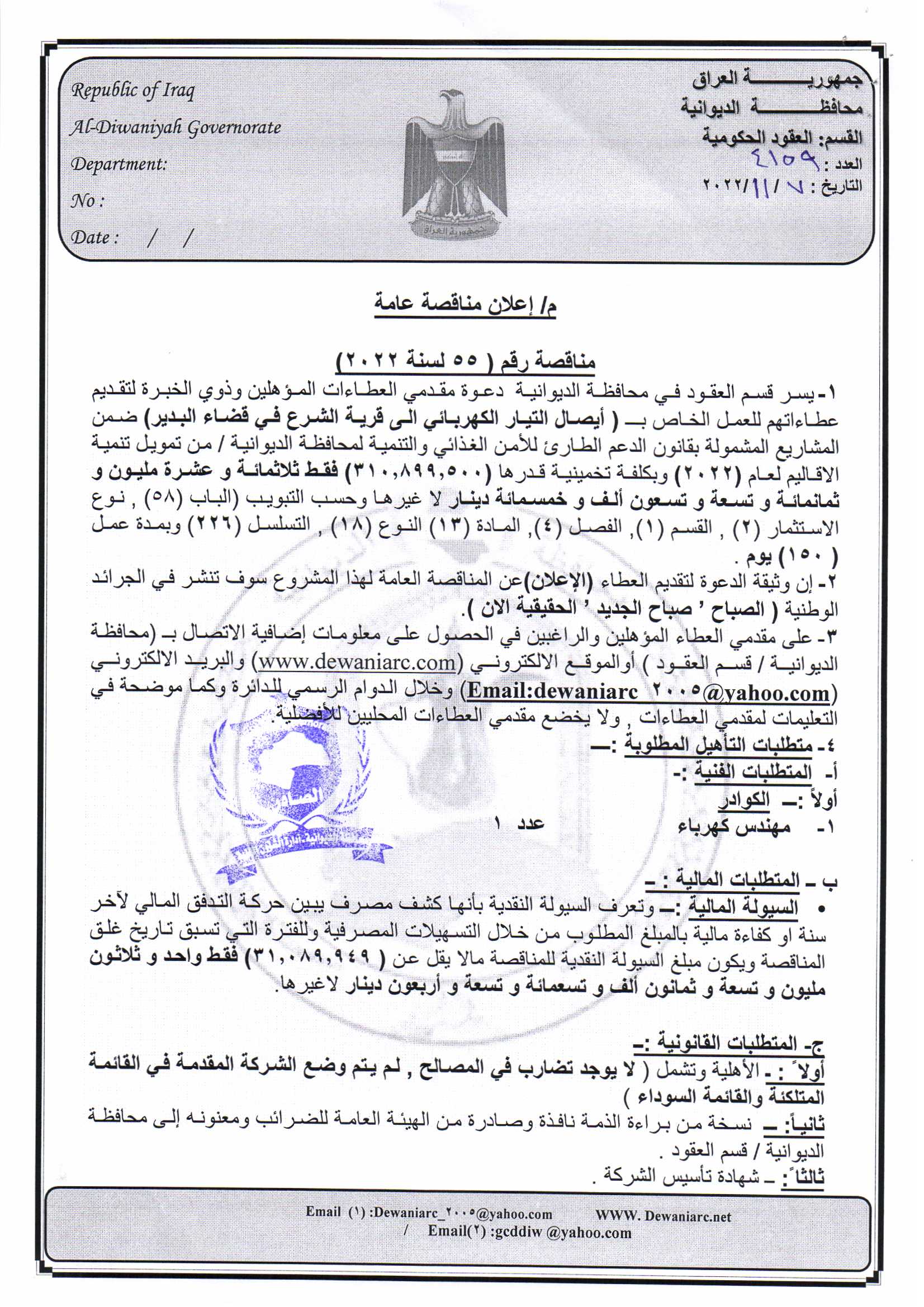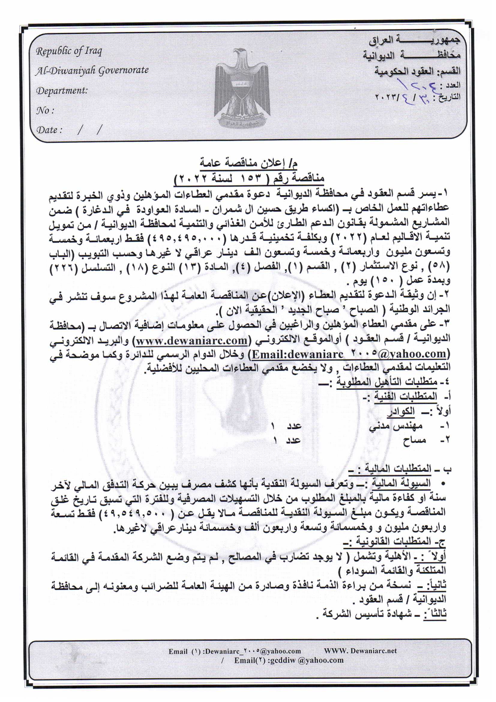 ﴿ إعلان مناقصة (153) لسنة 2022