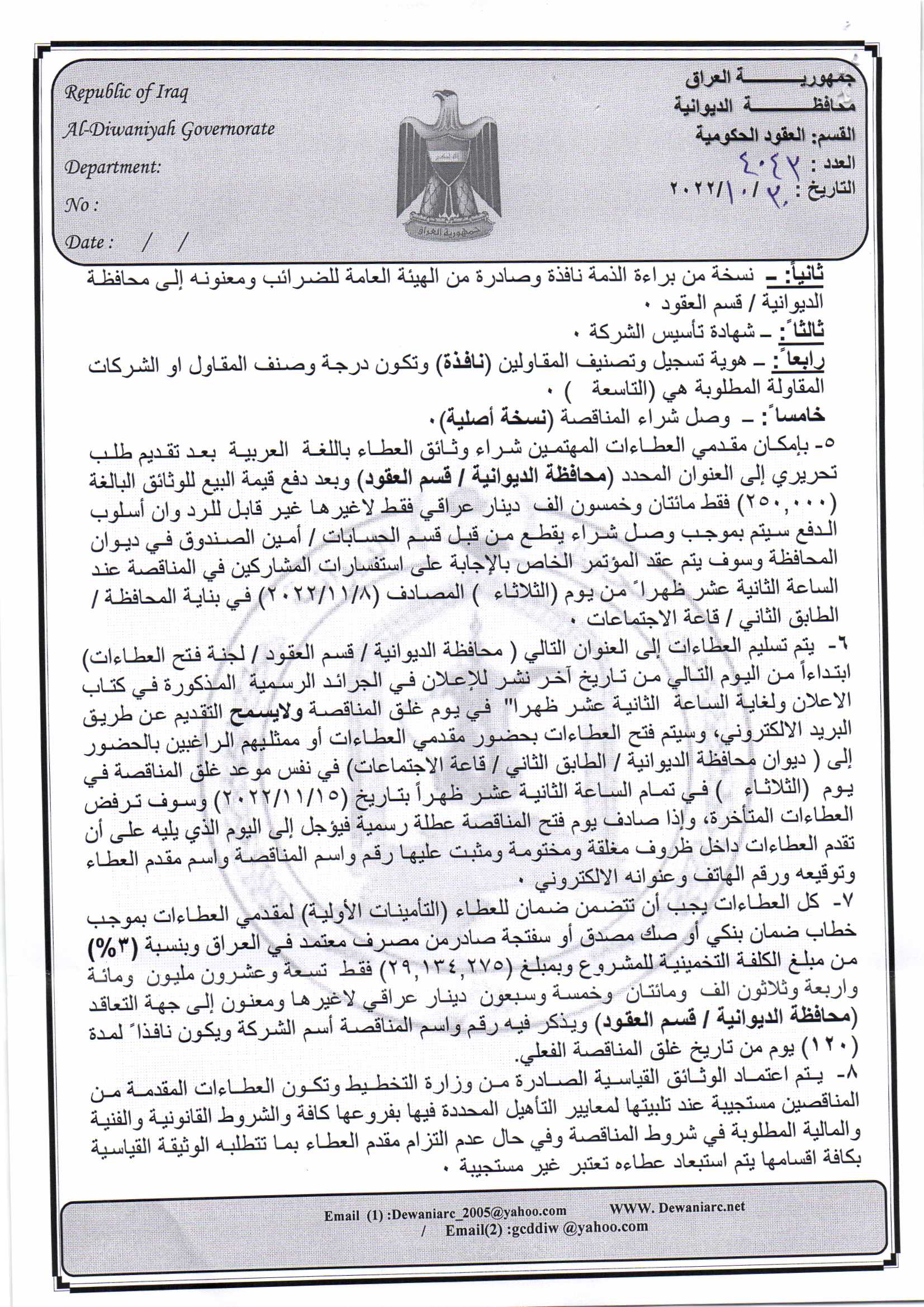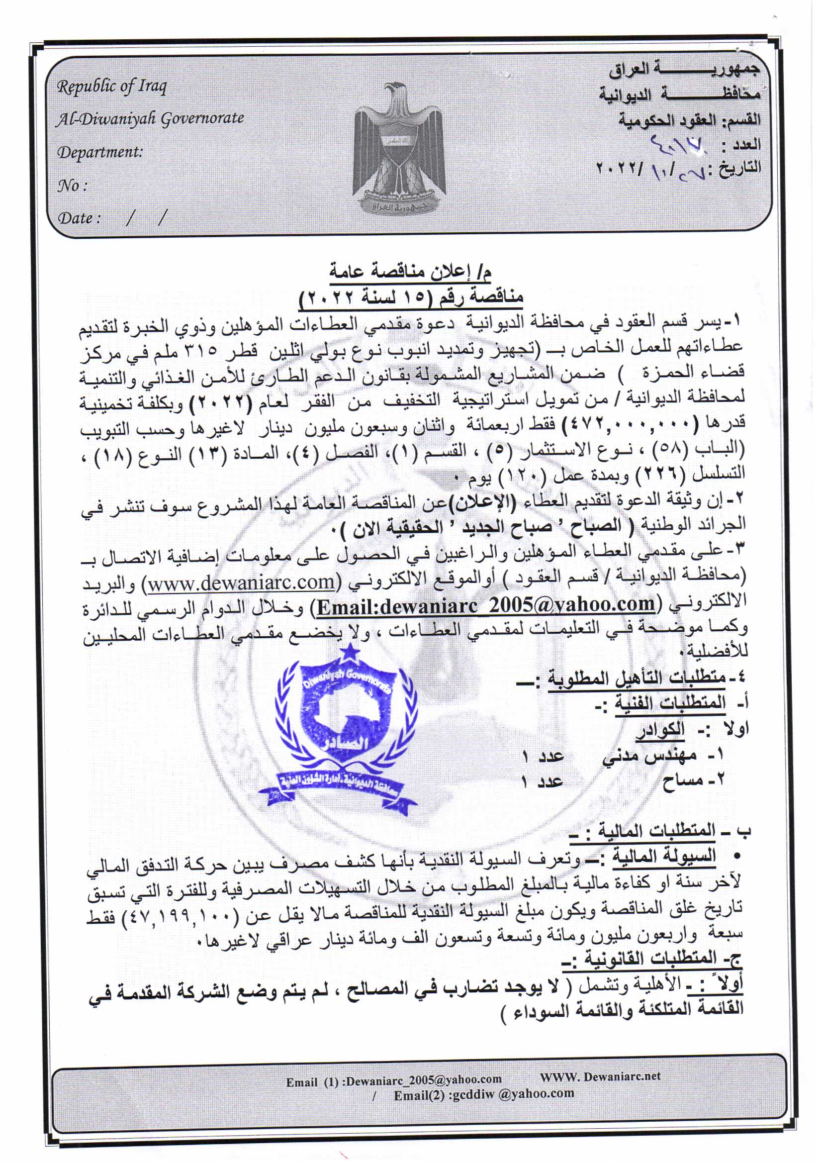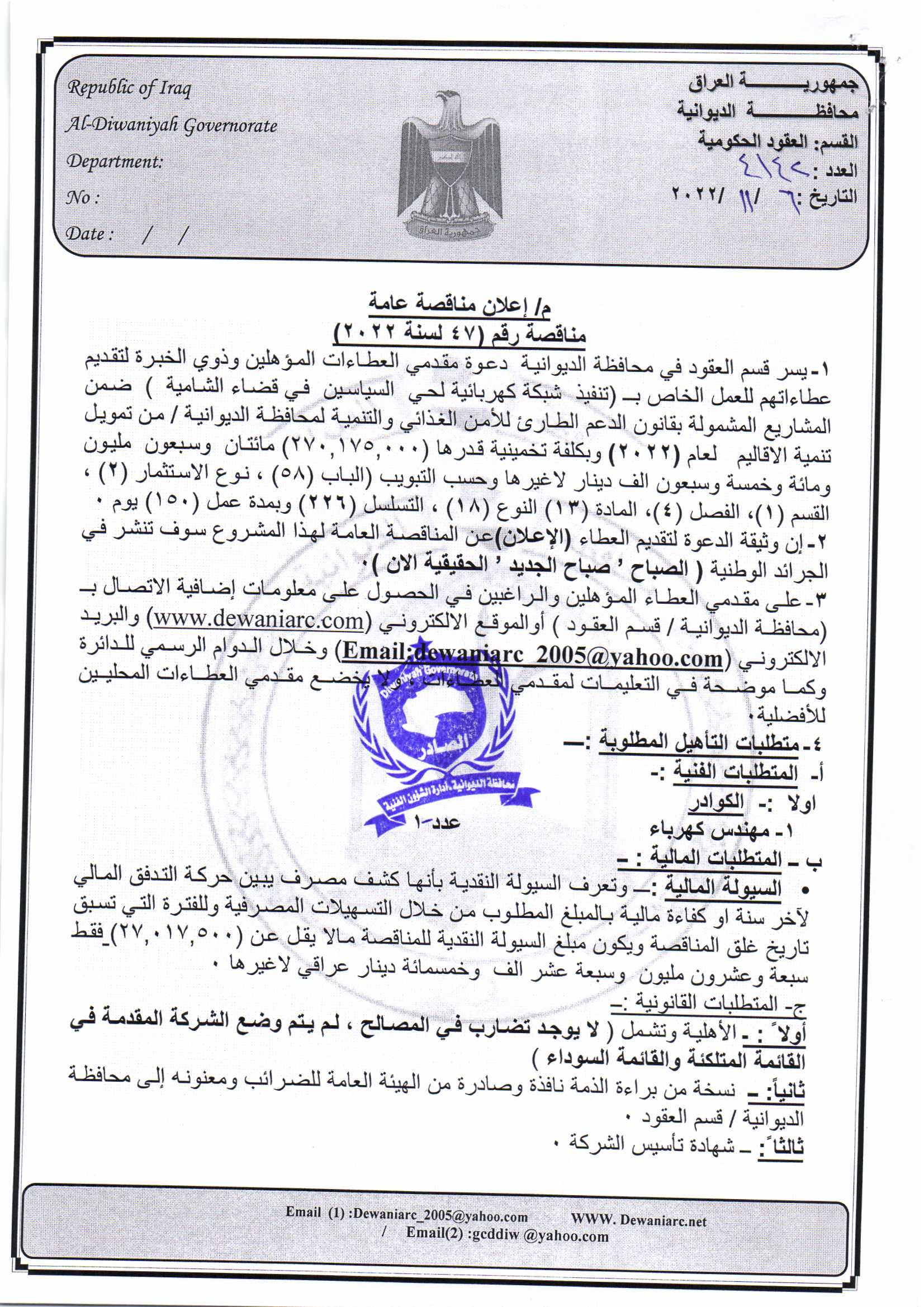 ﴿ إعلان مناقصة (47) لسنة 2022