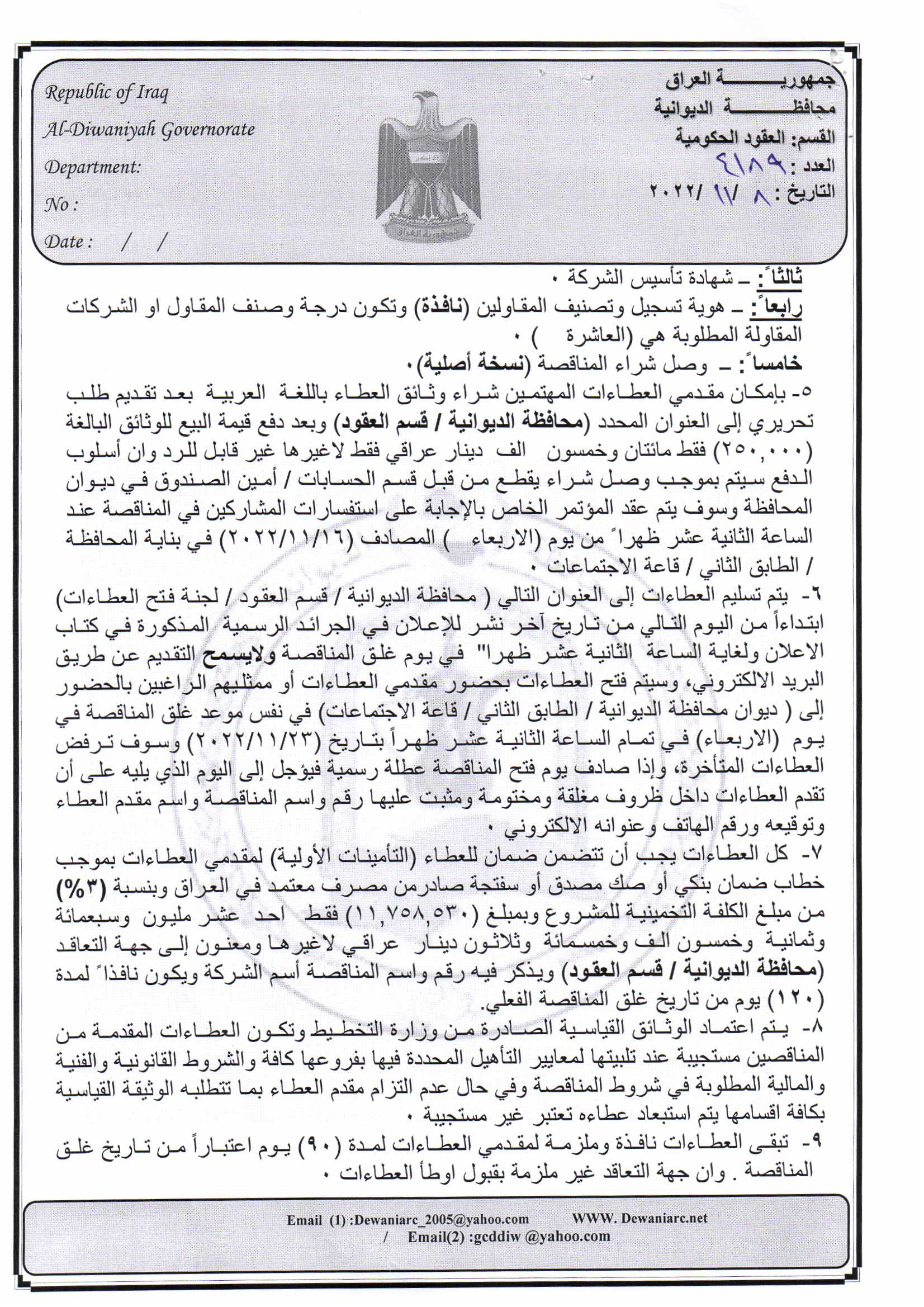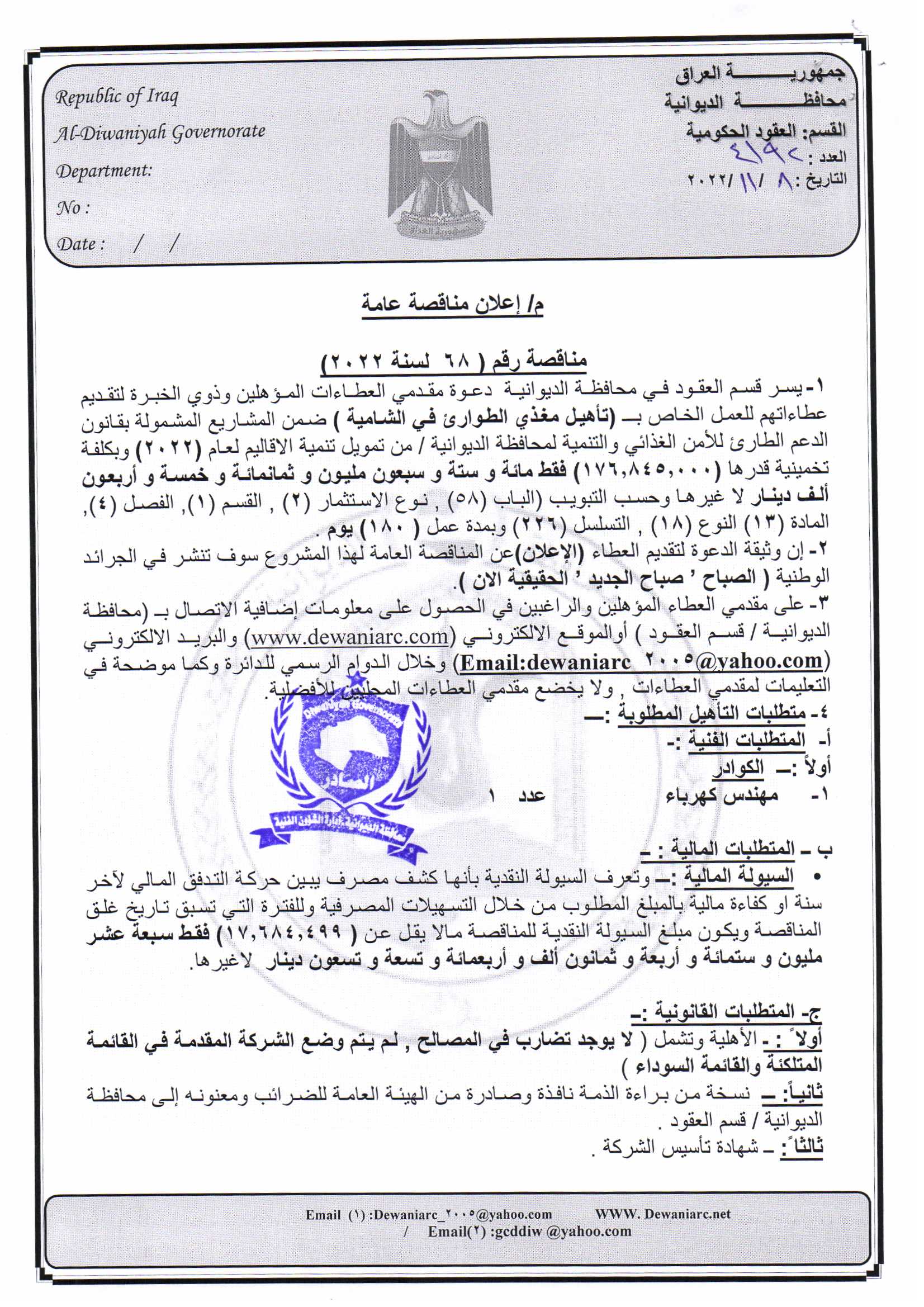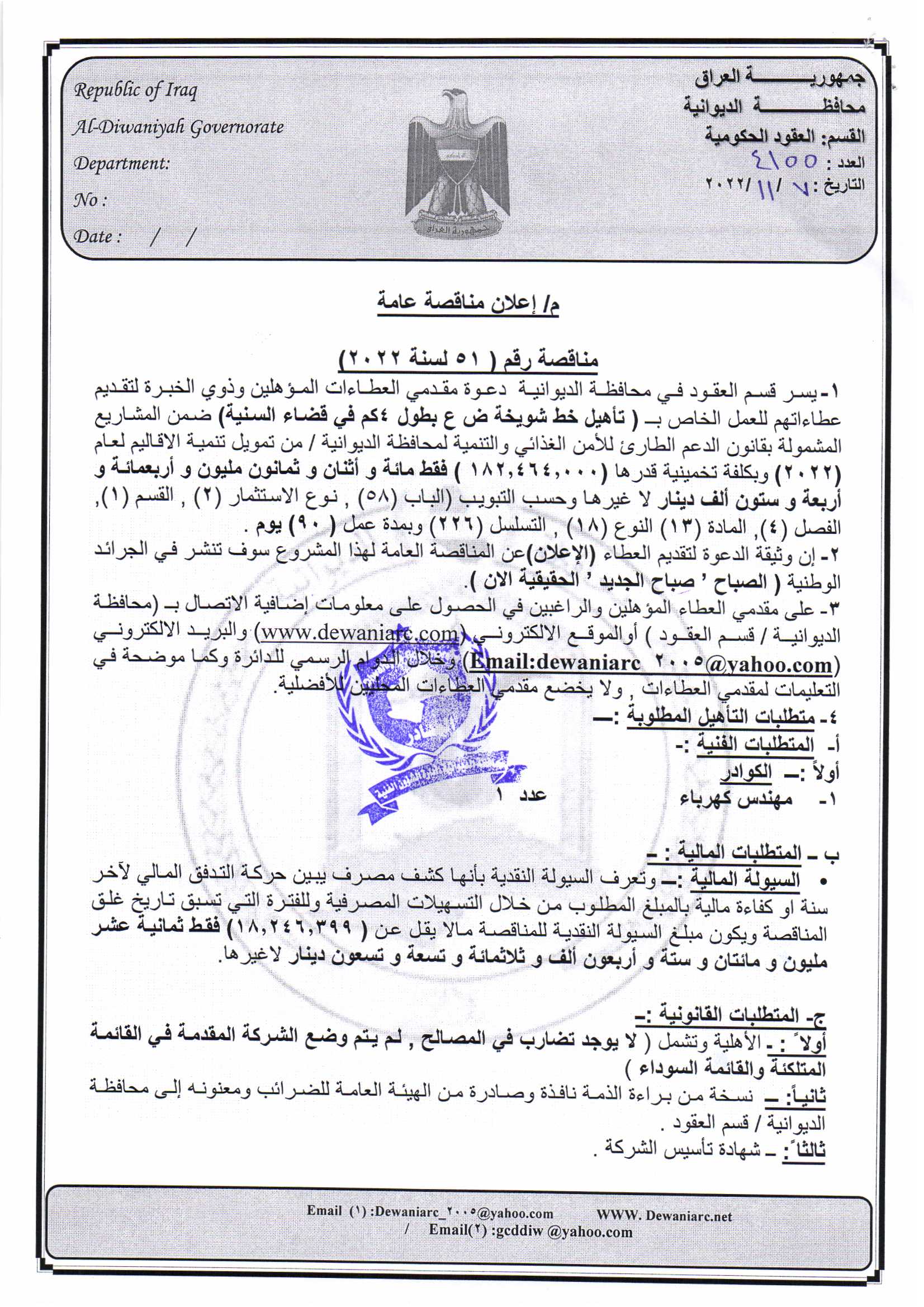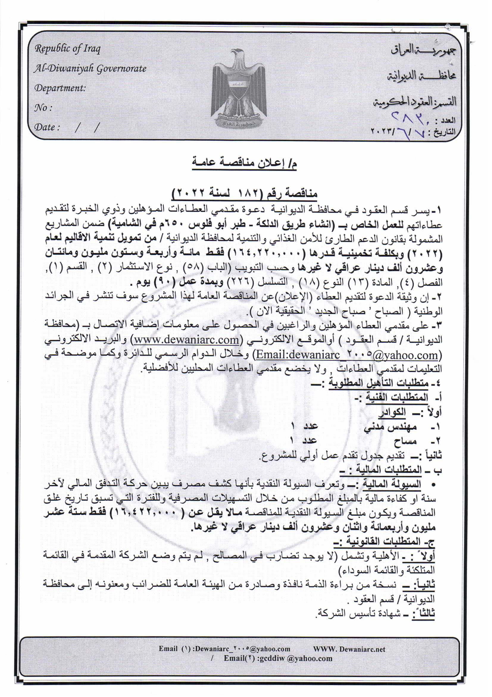 ﴿ إعلان مناقصة (182) لسنة 2022