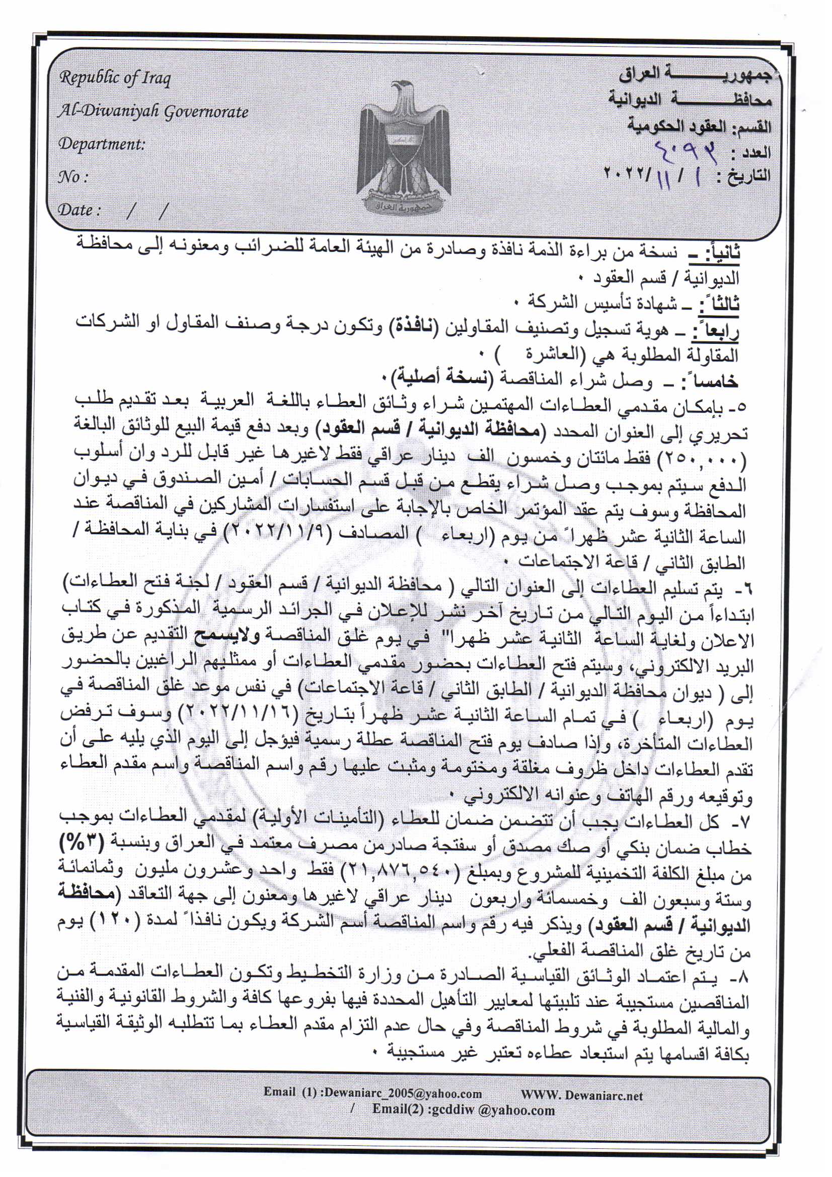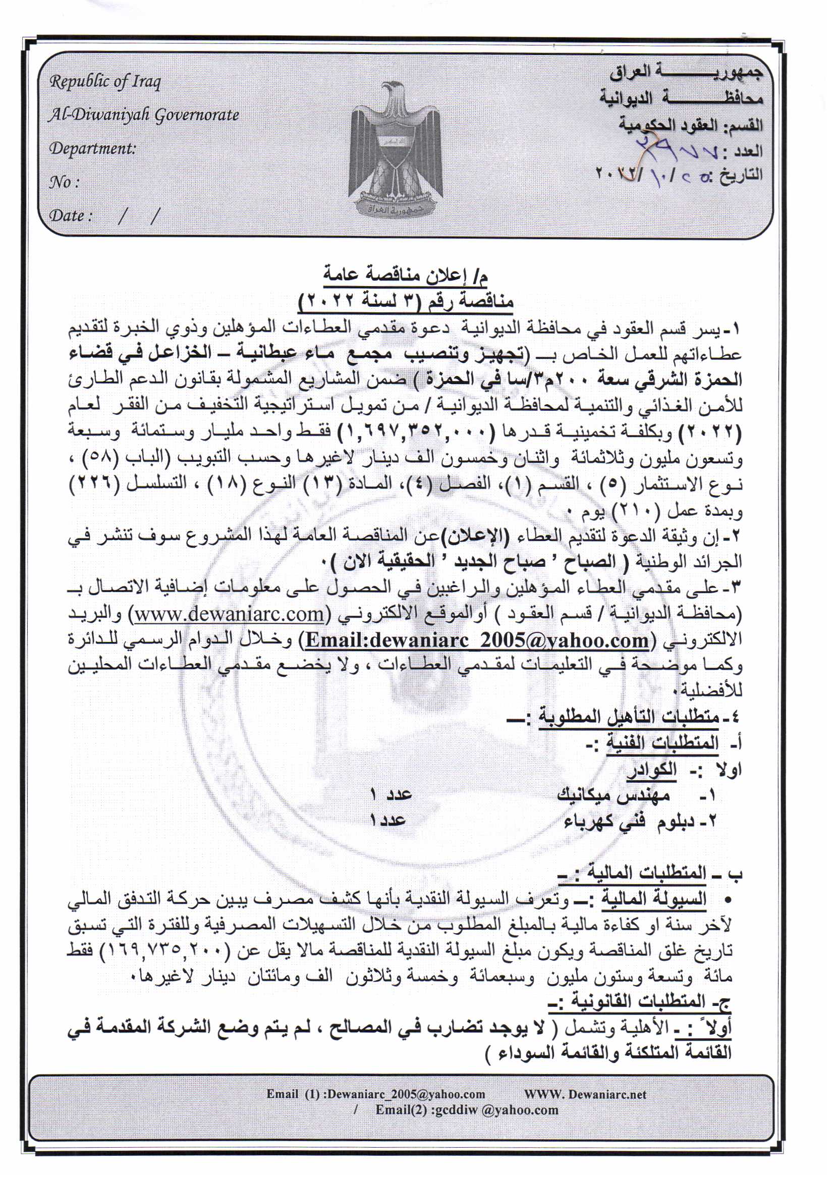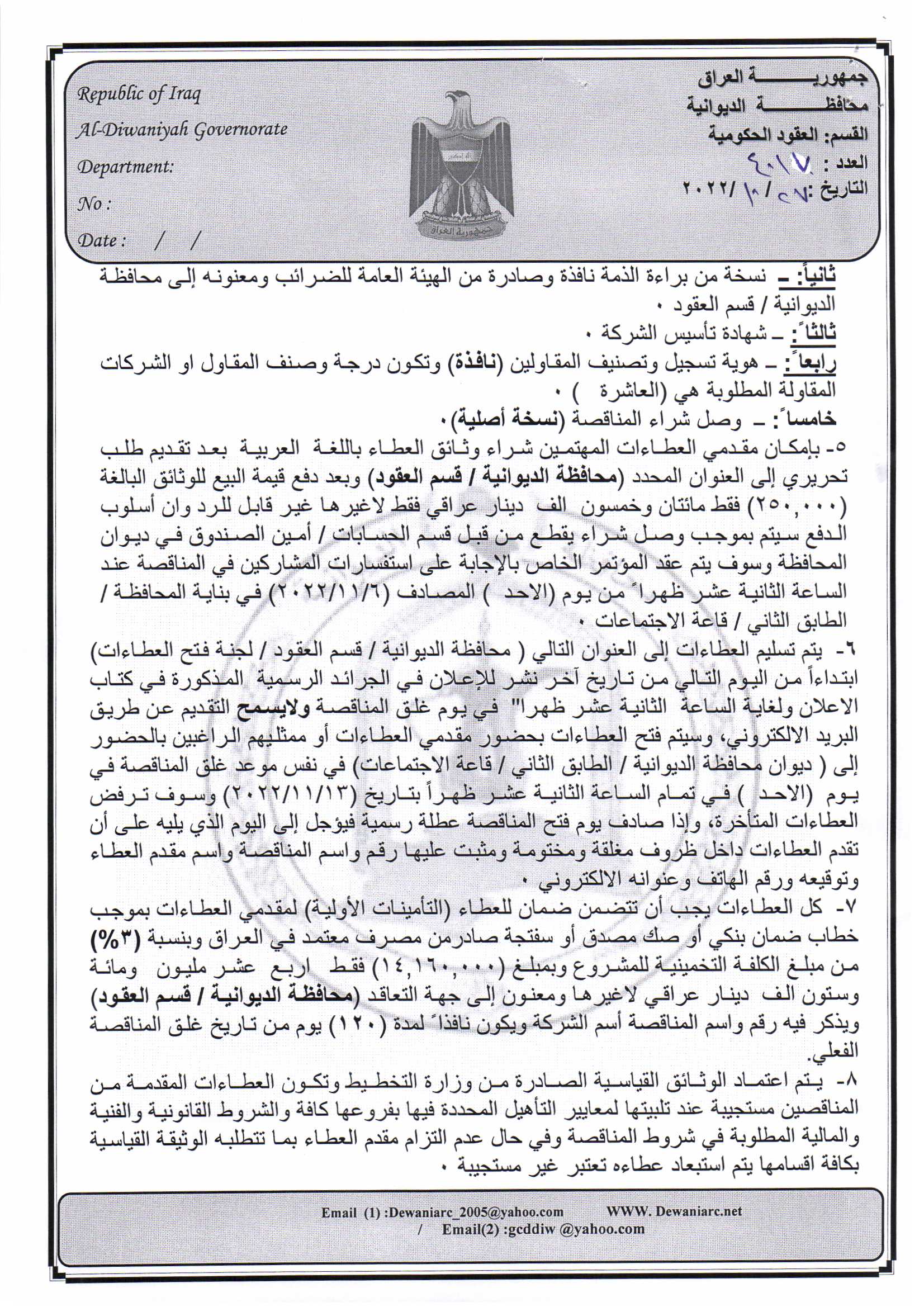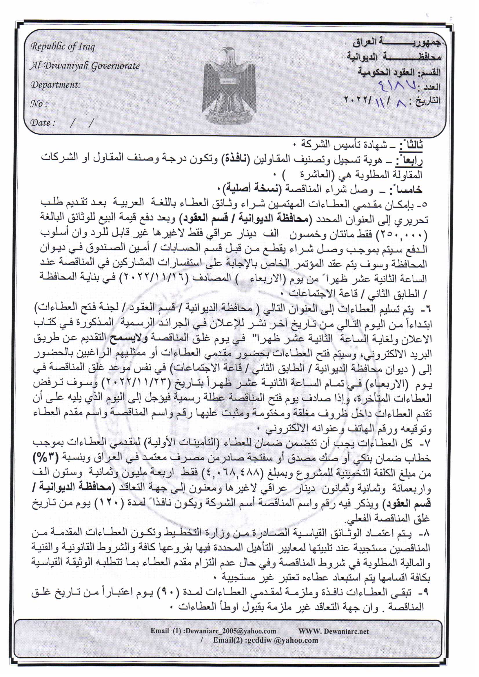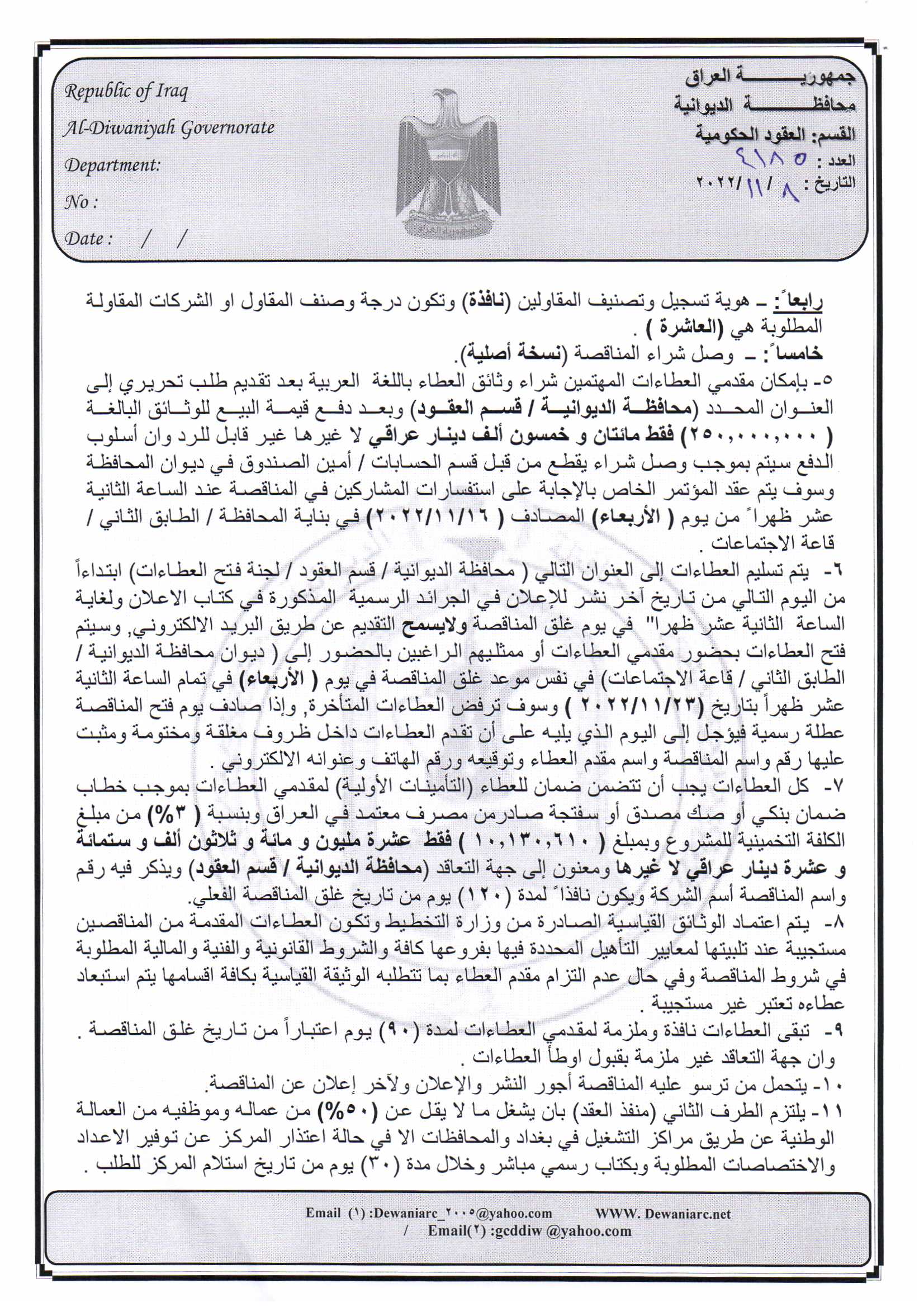 ﴿ إعلان مناقصة (182) لسنة 2022
