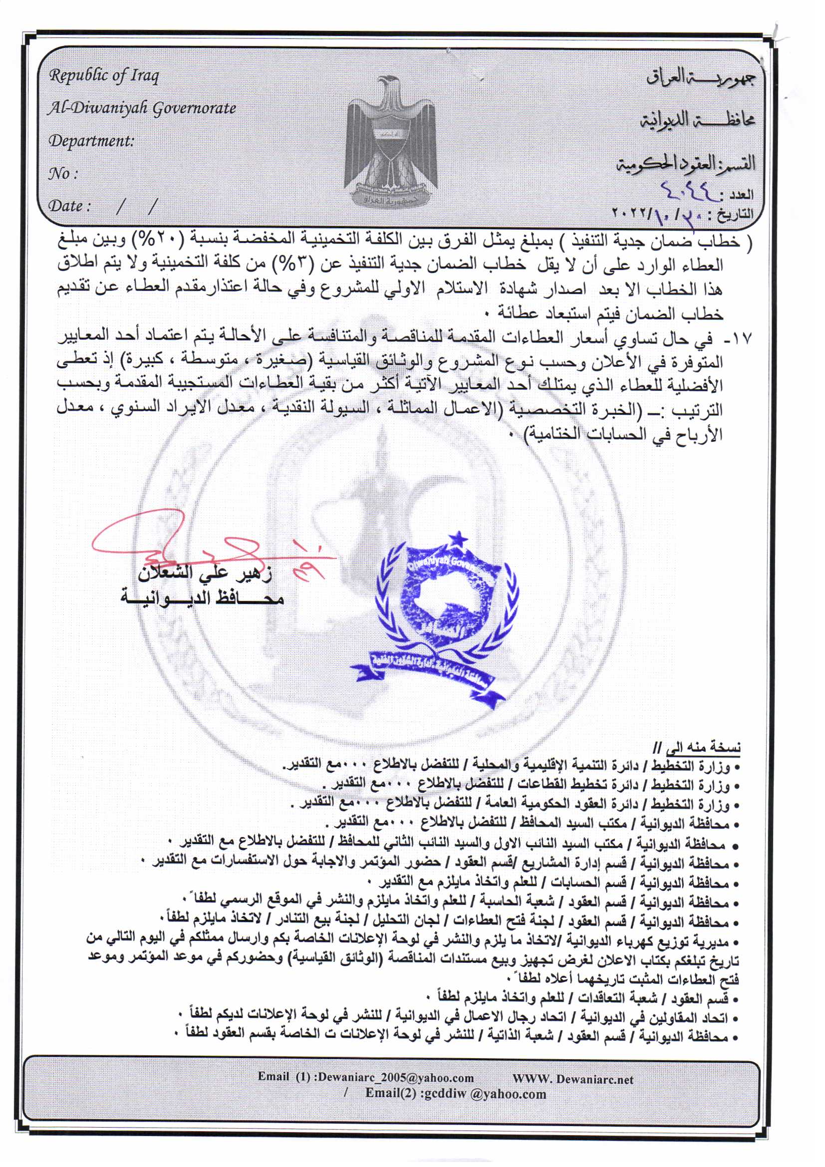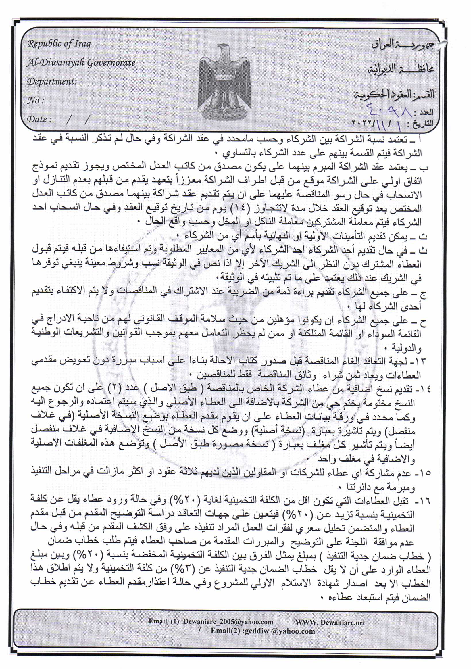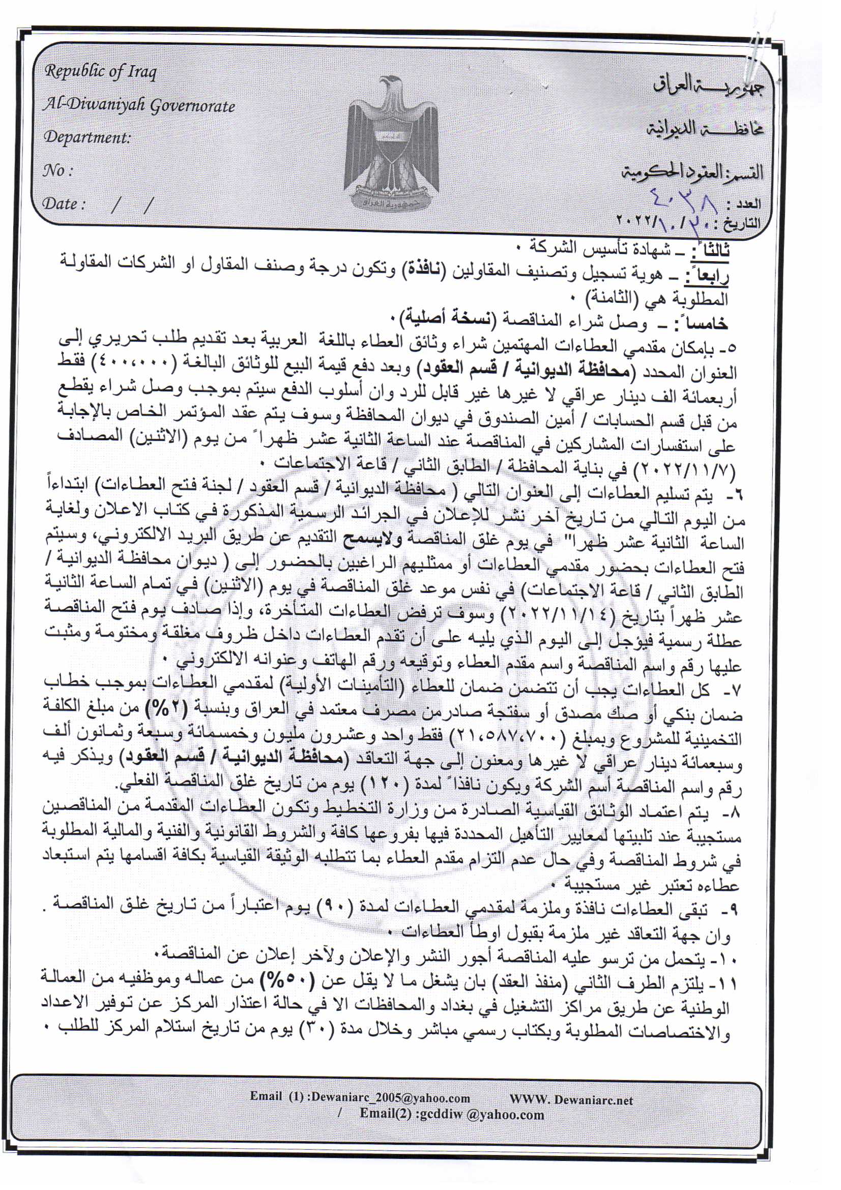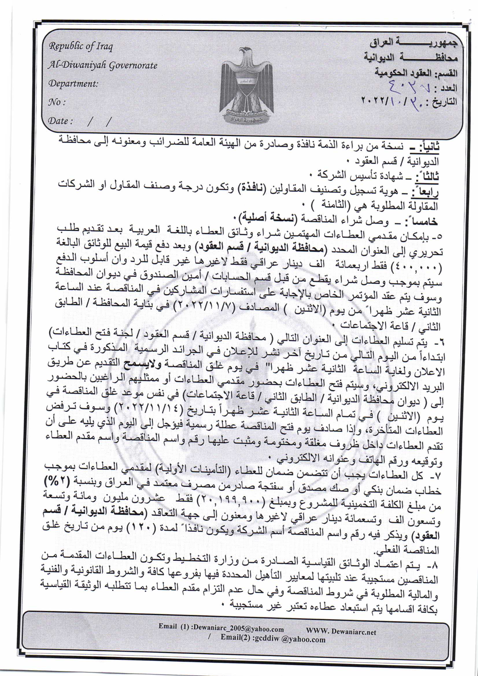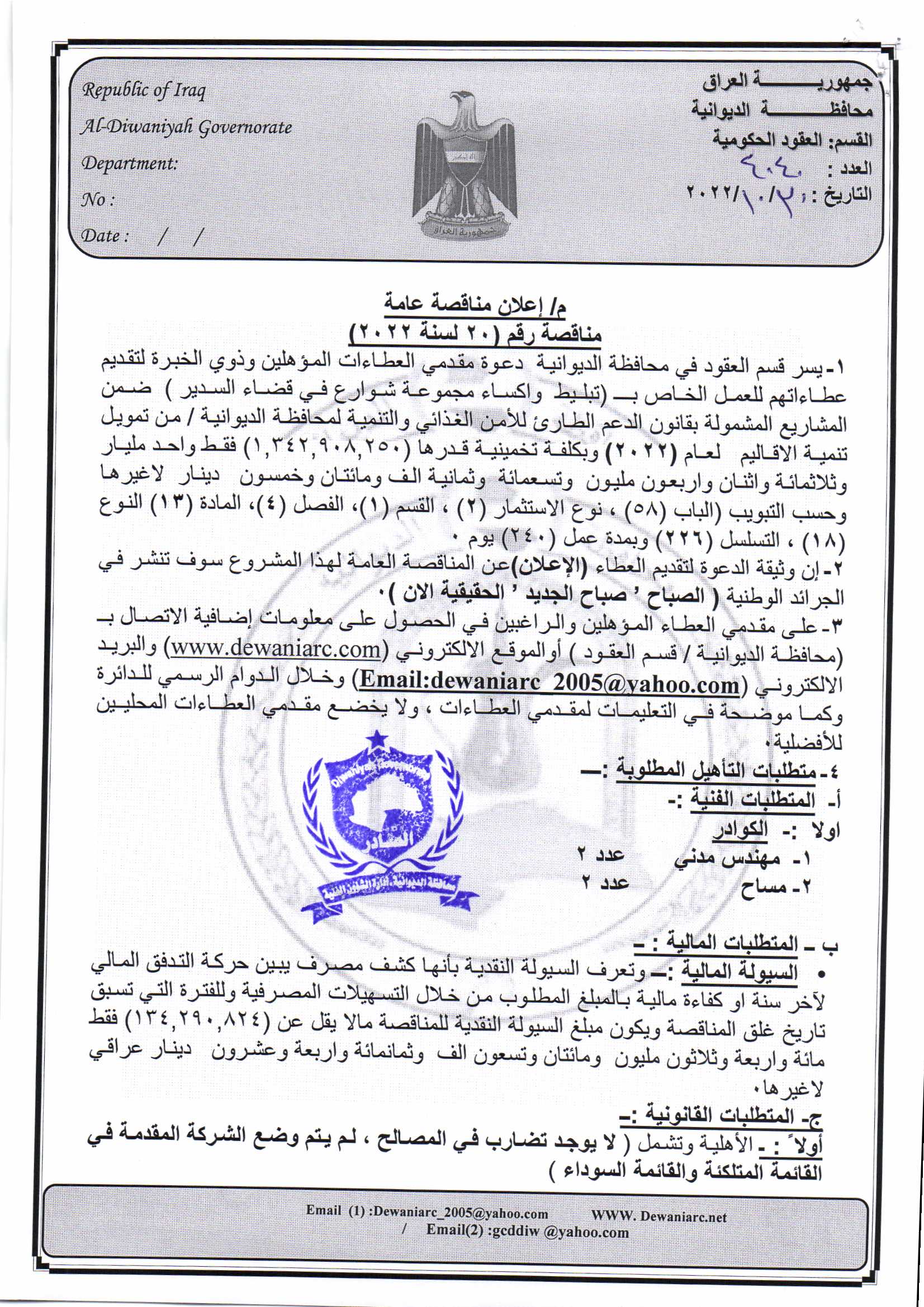 ﴿ إعلان مناقصة (20) لسنة 2022