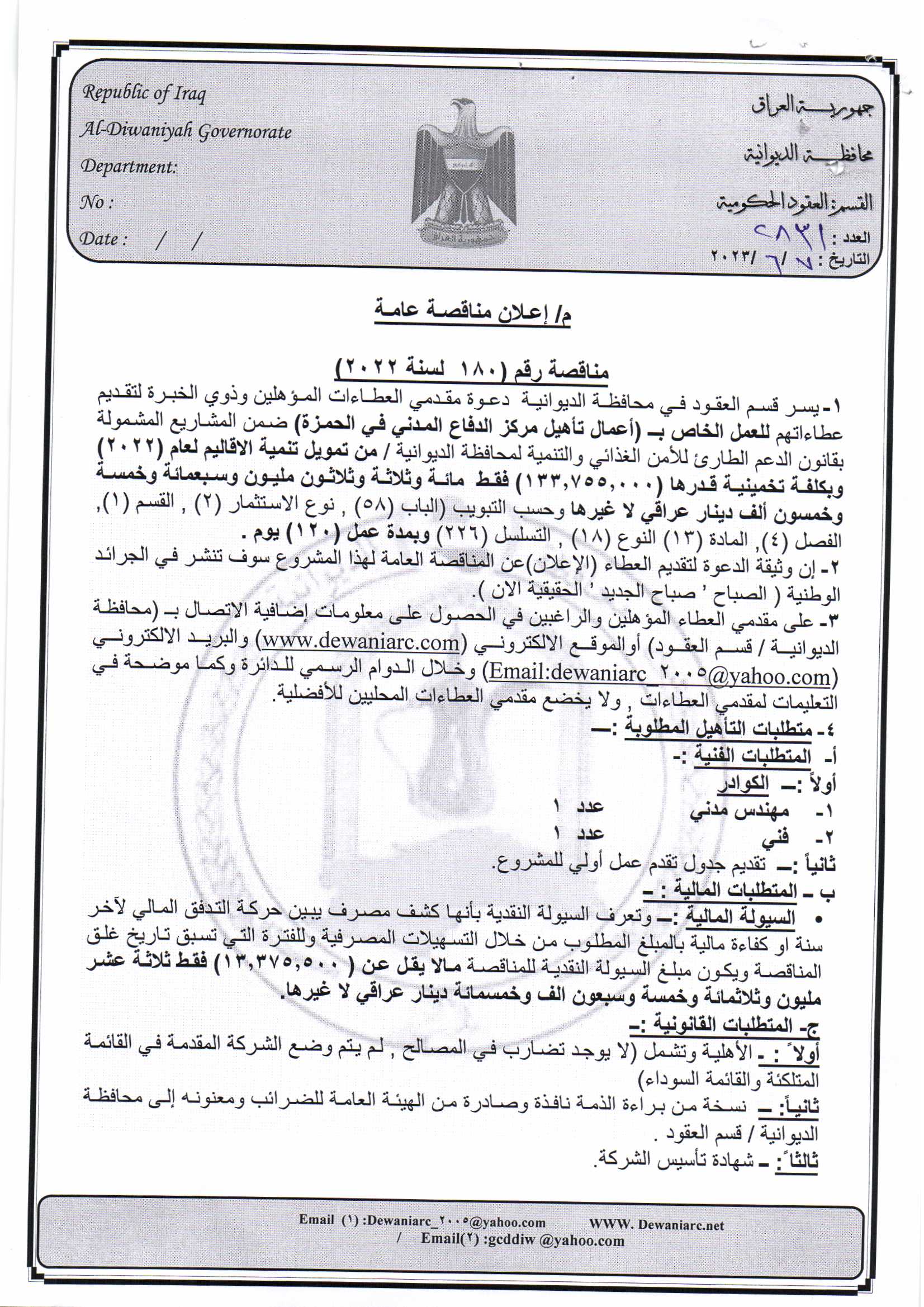 ﴿ إعلان مناقصة (180) لسنة 2022
