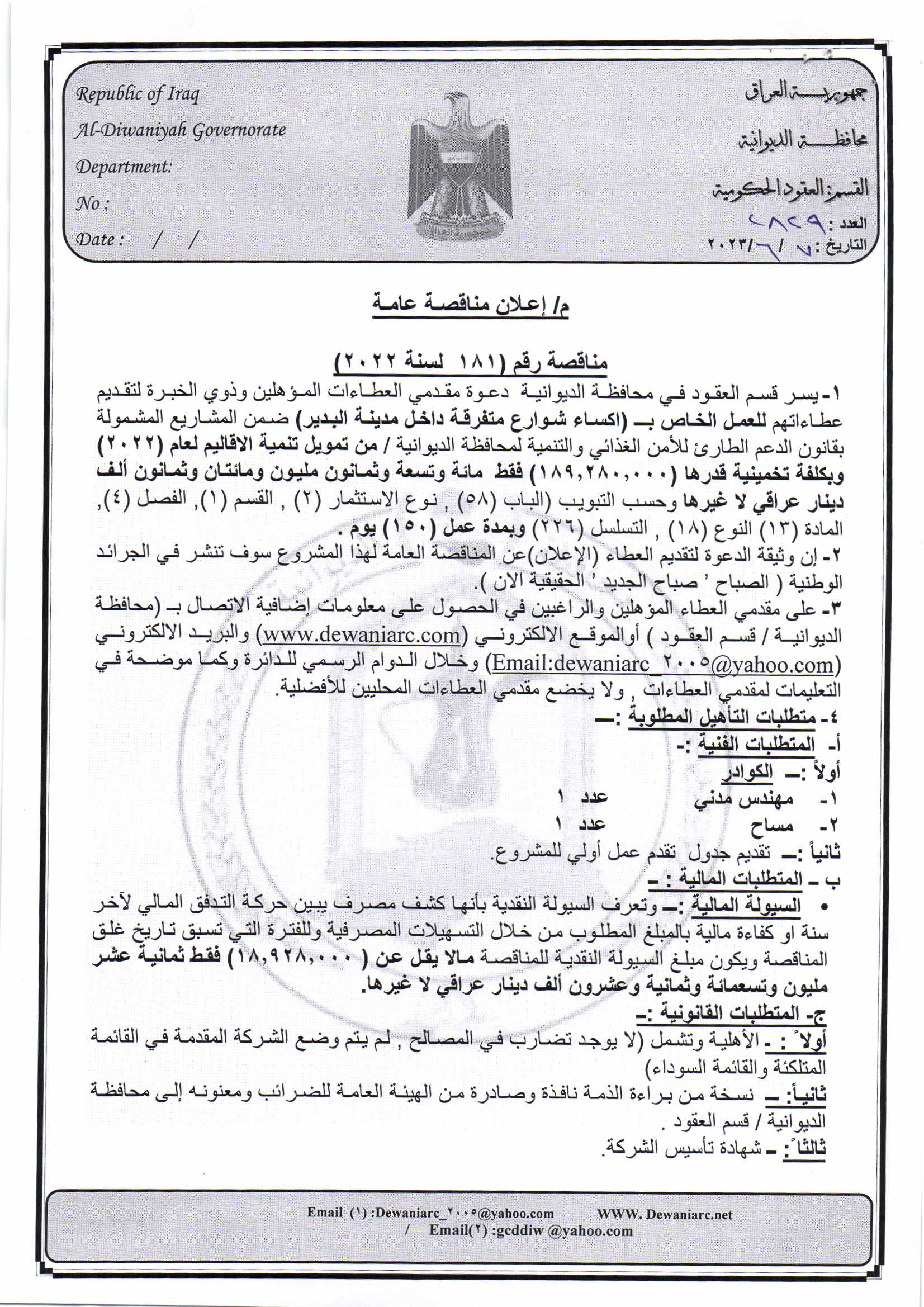 ﴿ إعلان مناقصة (181) لسنة 2022
