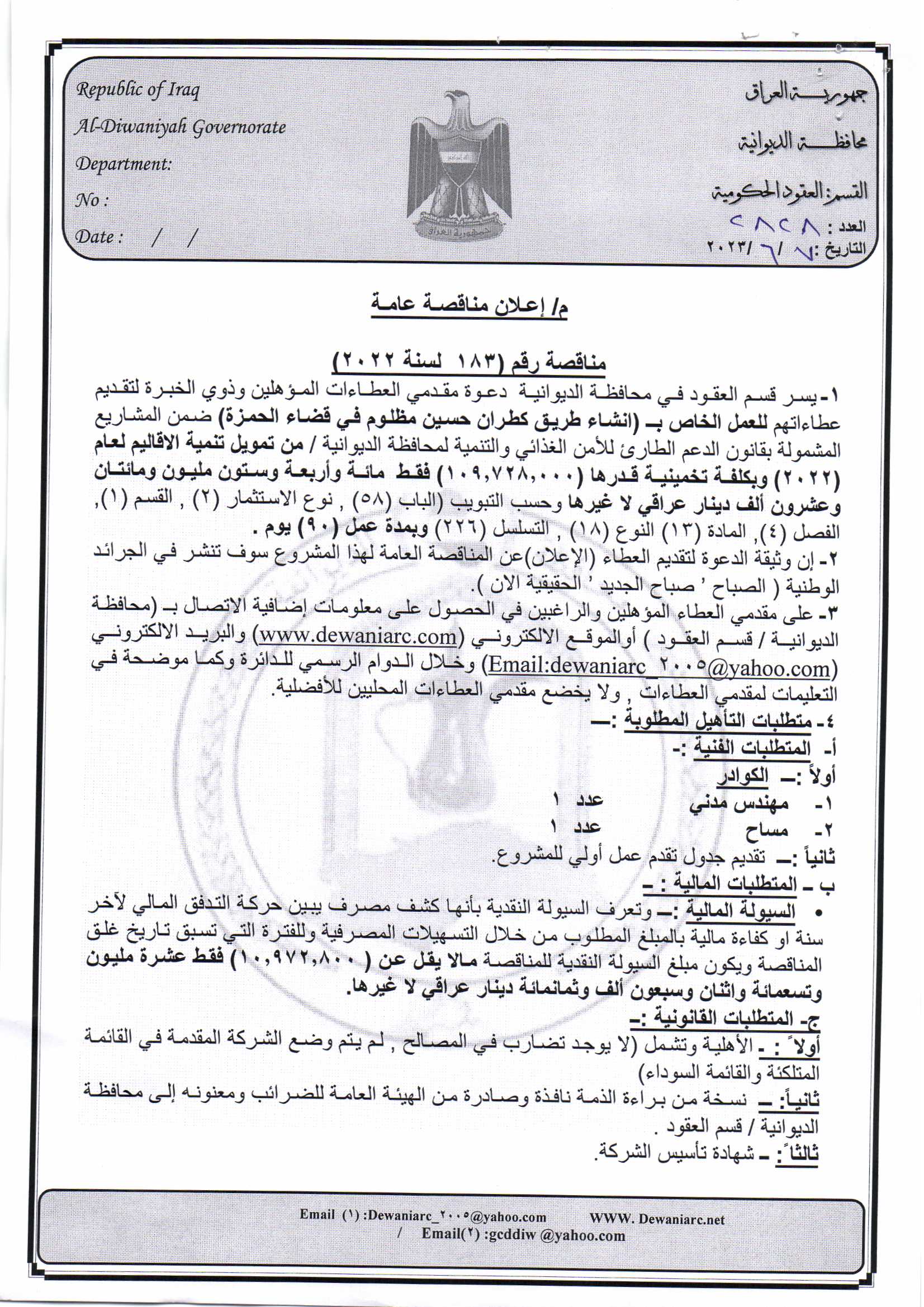 ﴿ إعلان مناقصة (183) لسنة 2022