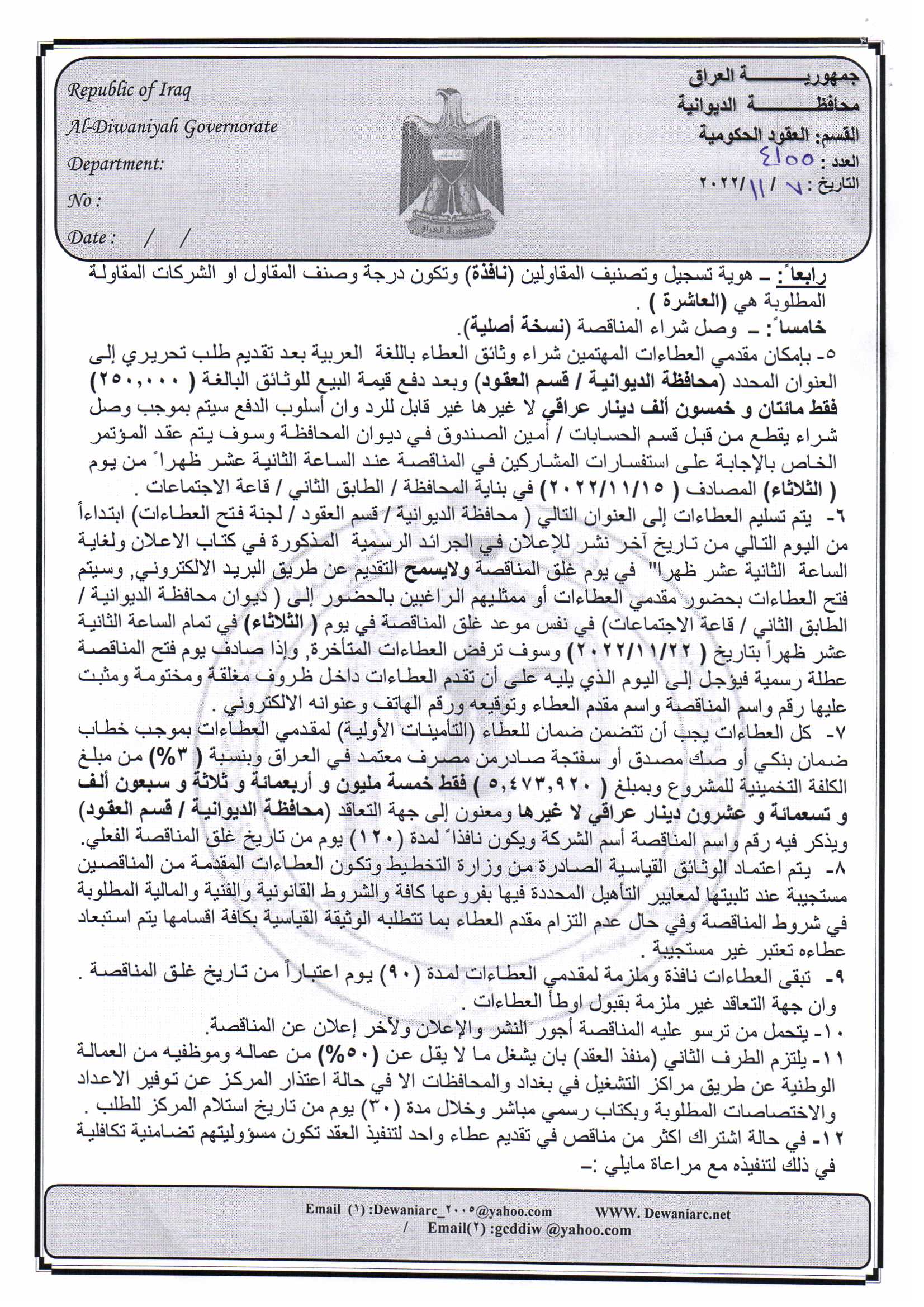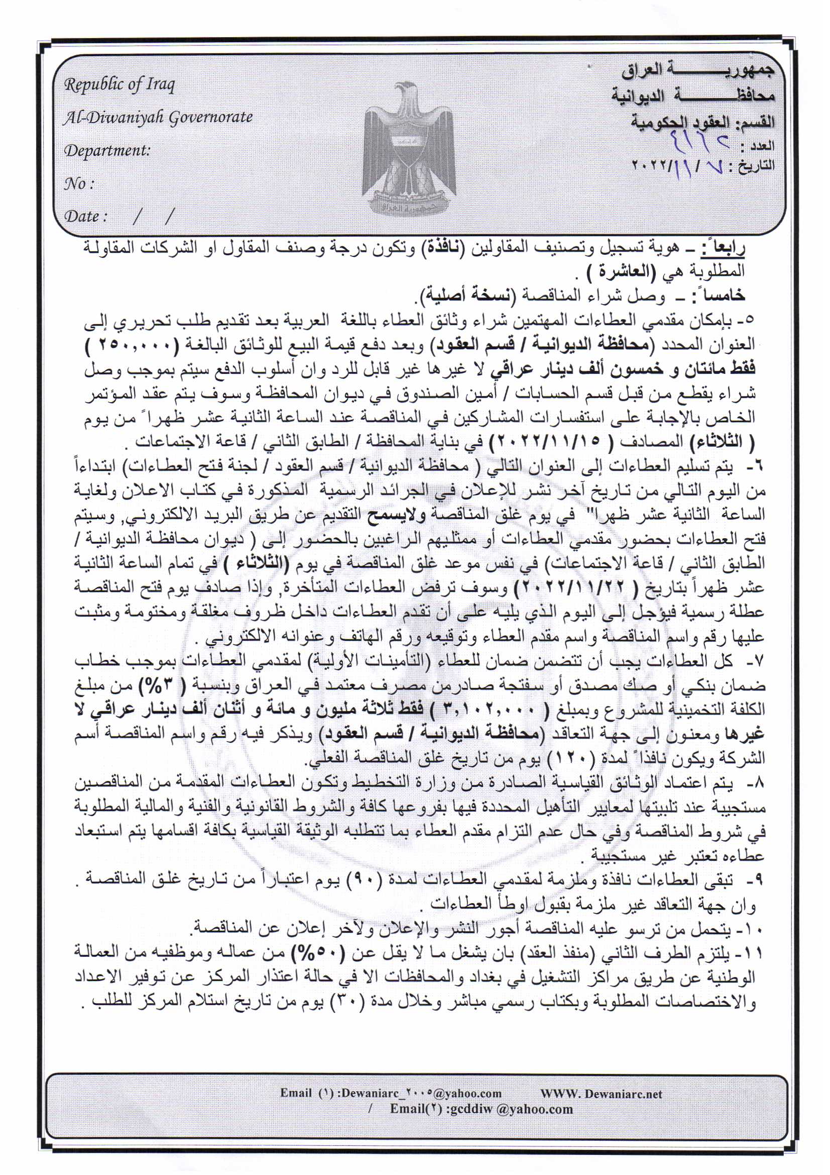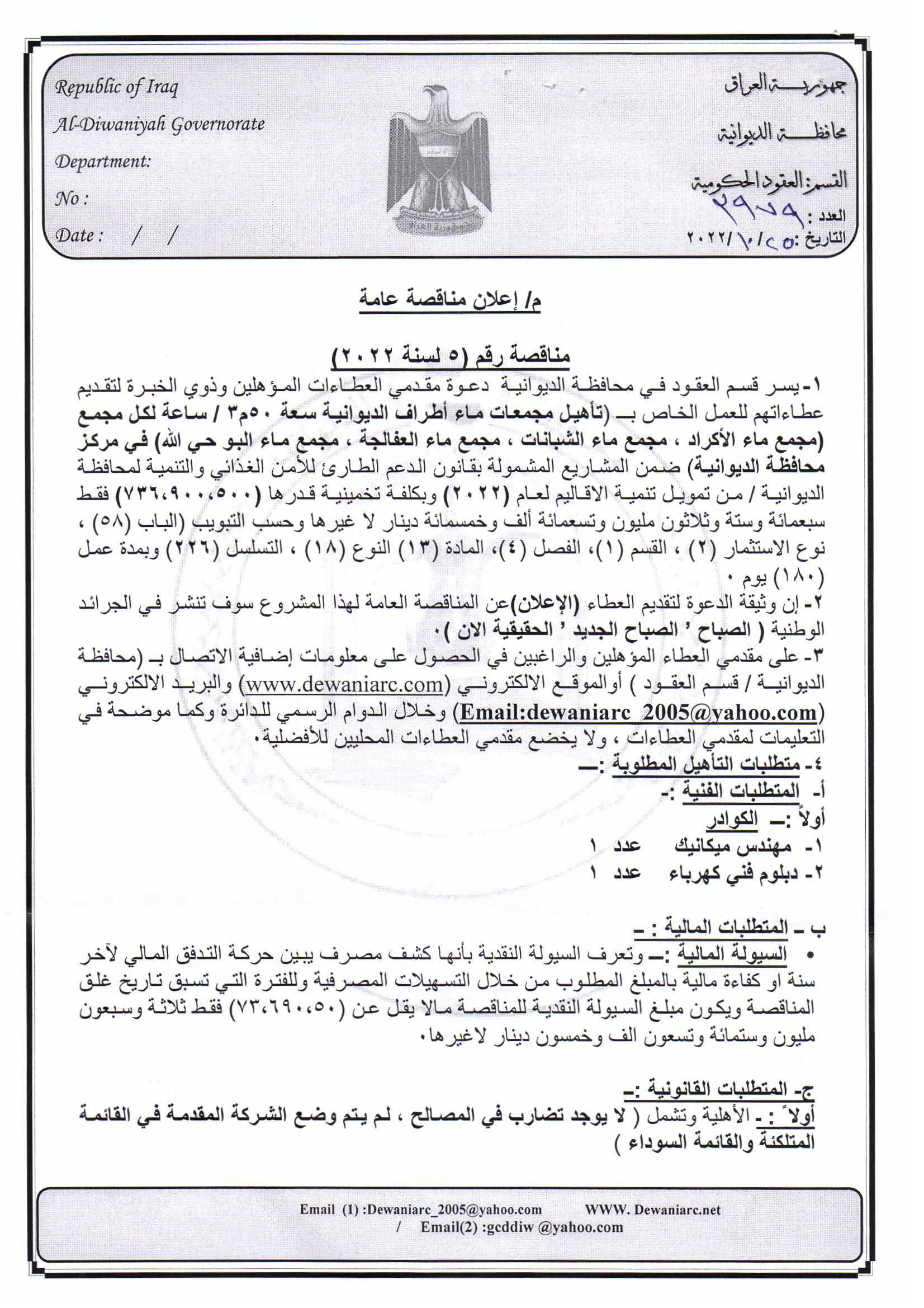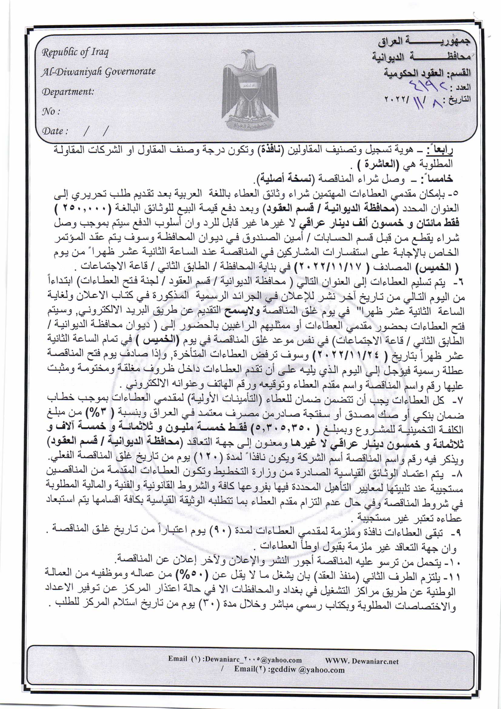 ﴿ إعلان مناقصة (5) لسنة 2022