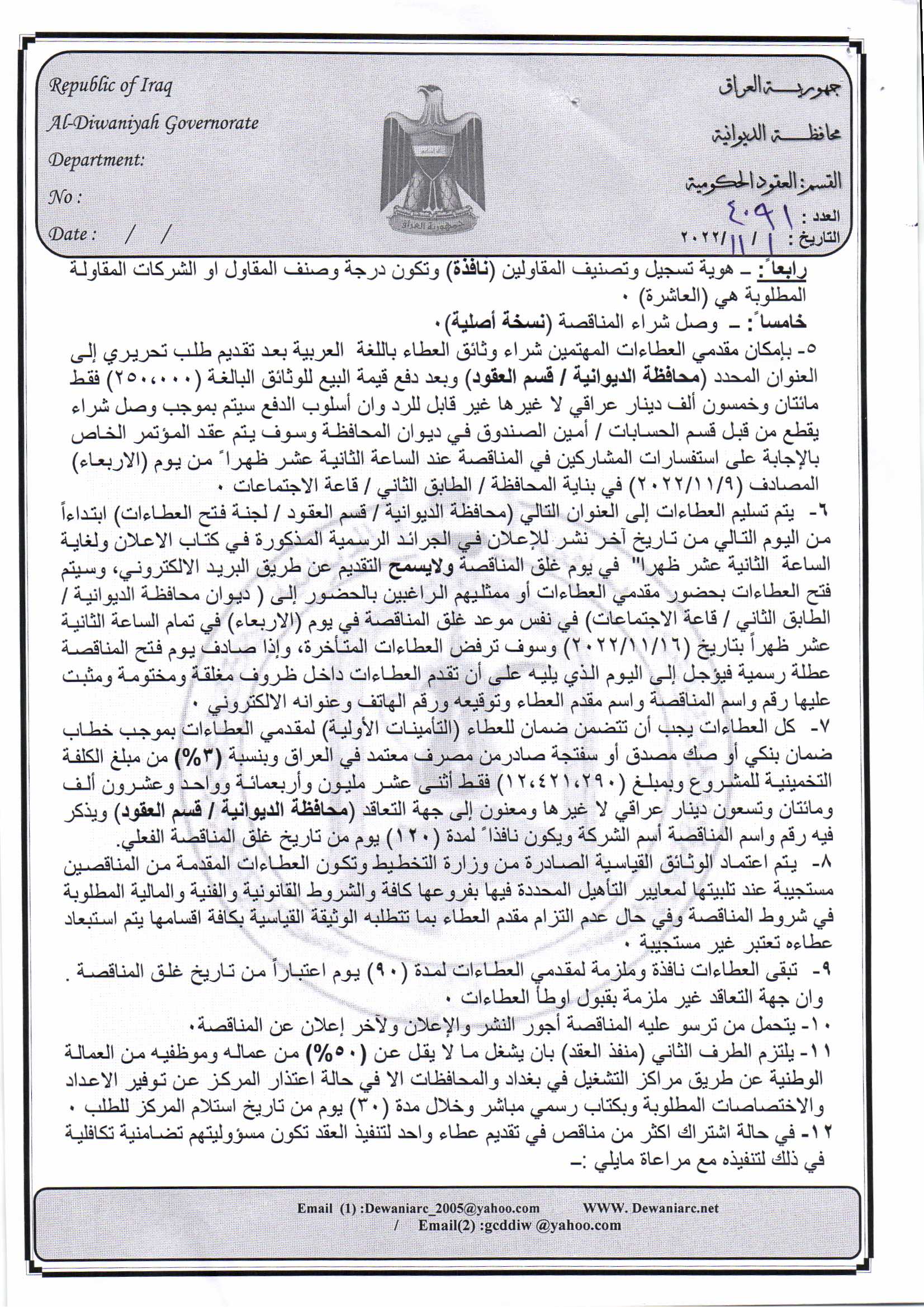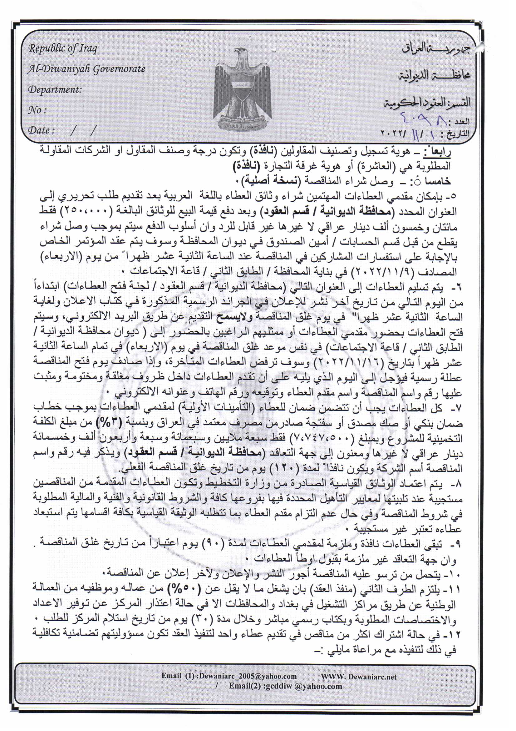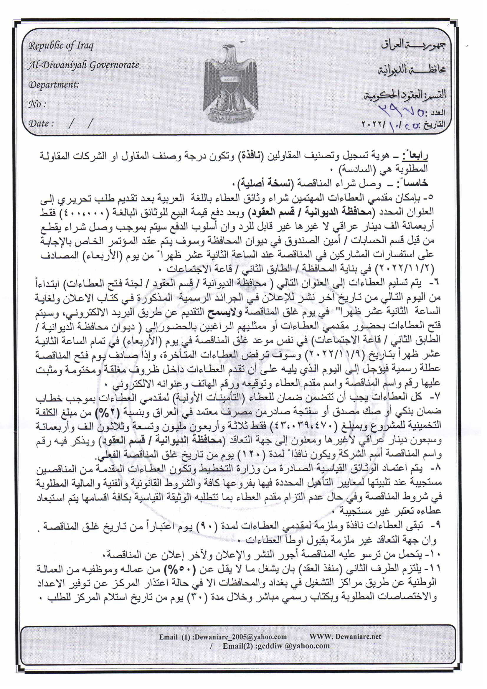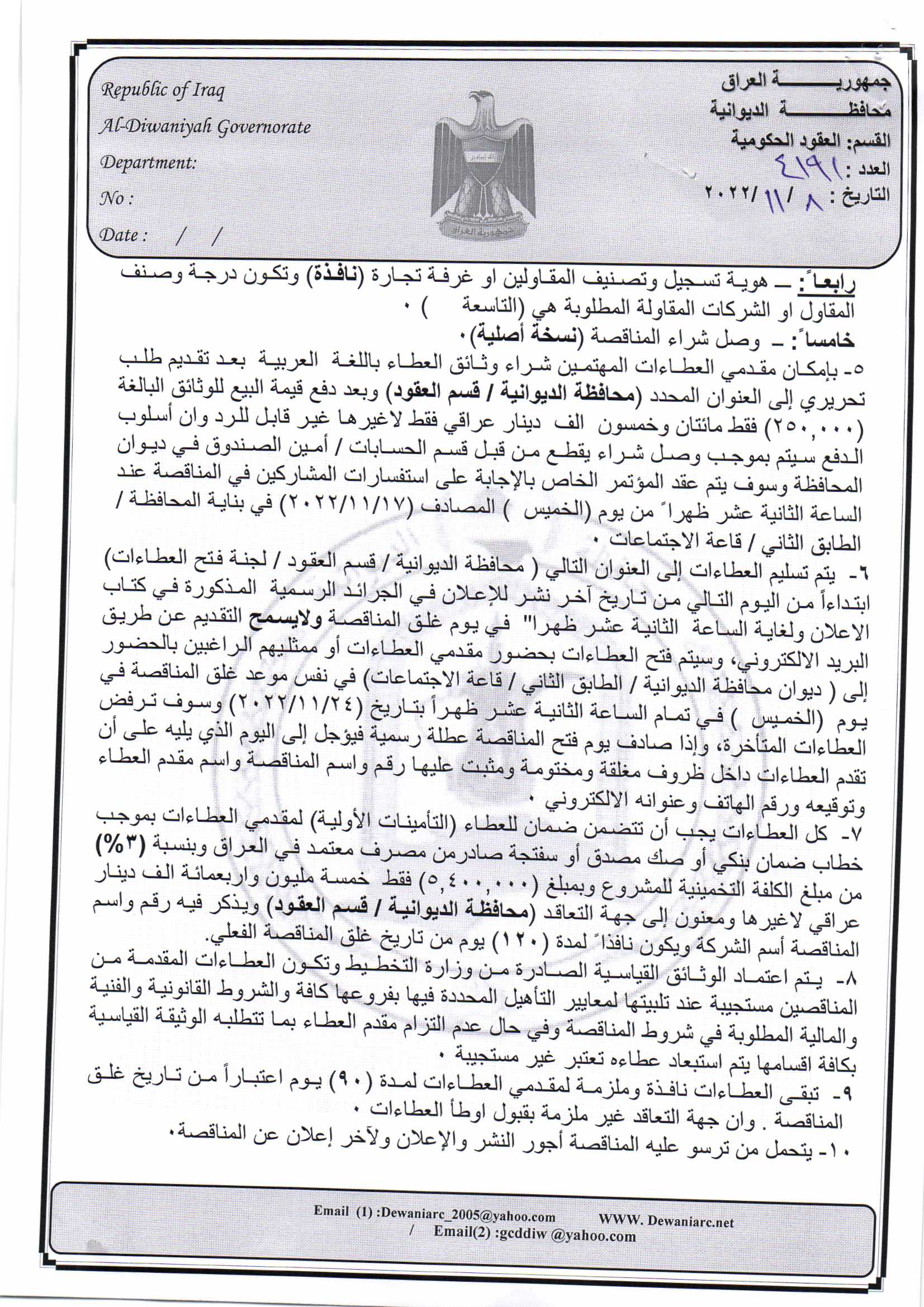 ﴿ إعلان مناقصة (5) لسنة 2022