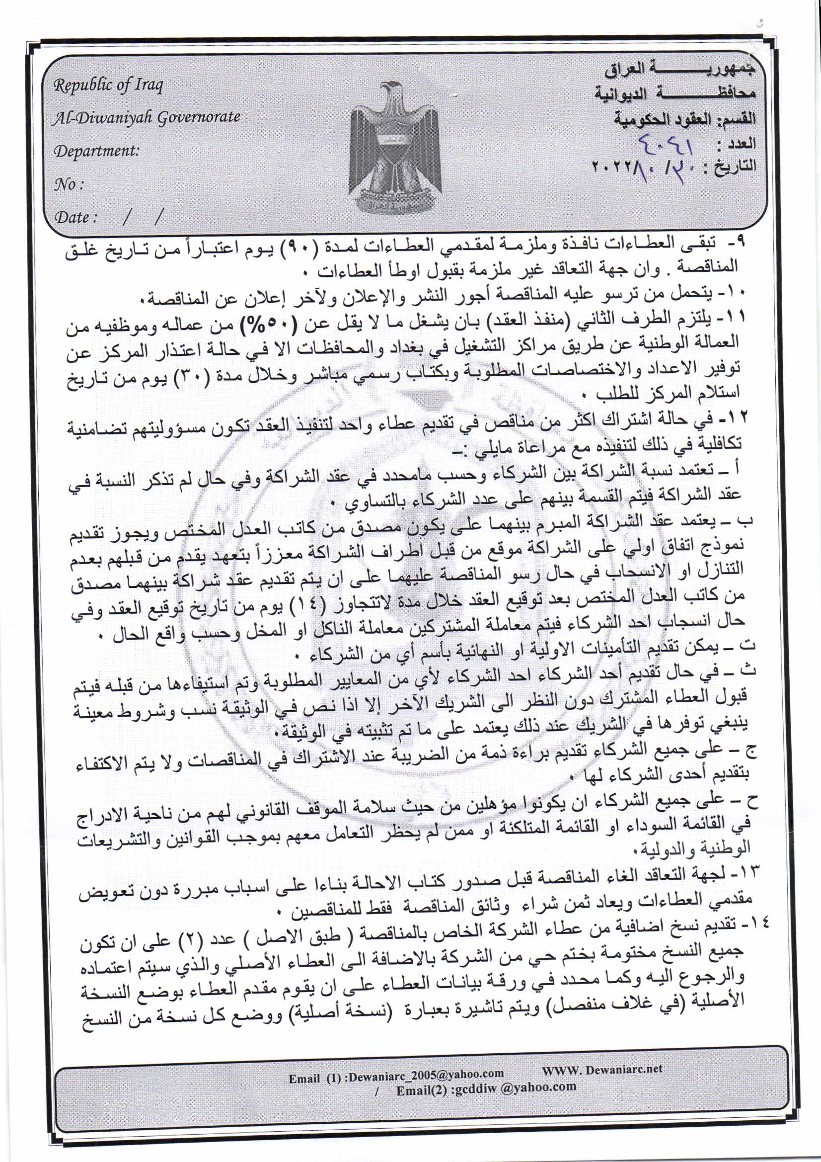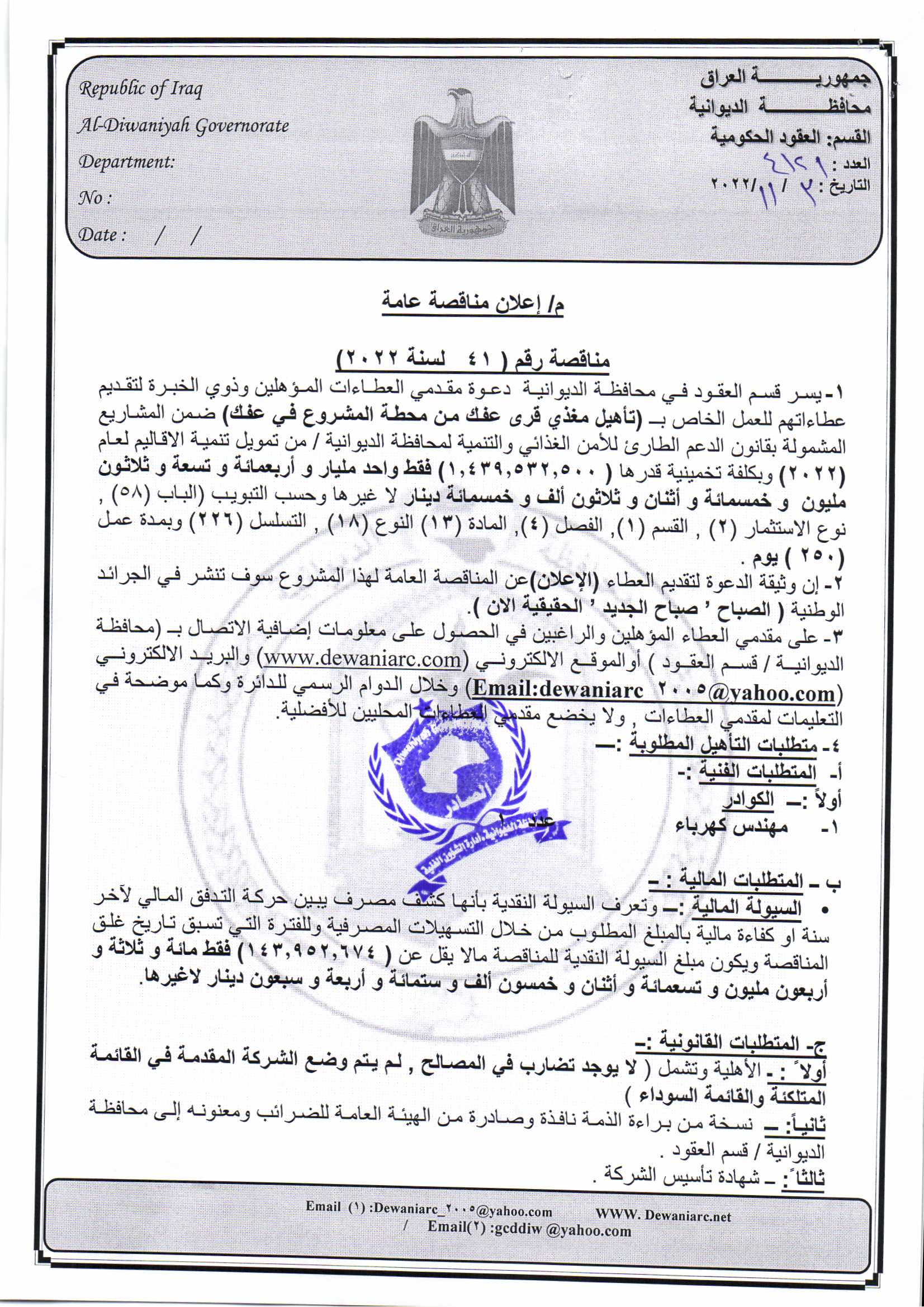 ﴿ إعلان مناقصة (41) لسنة 2022