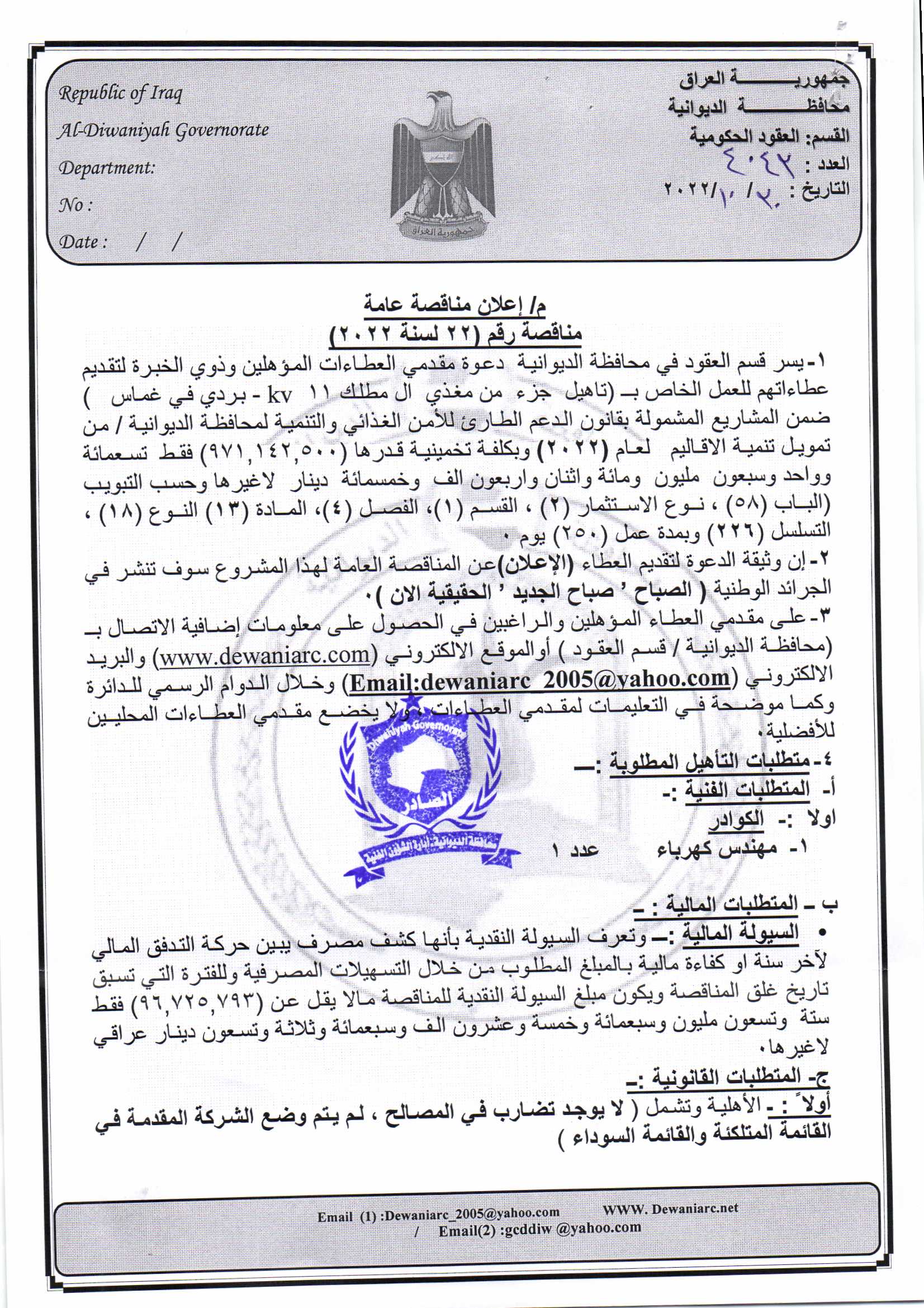 ﴿ إعلان مناقصة (22) لسنة 2022
