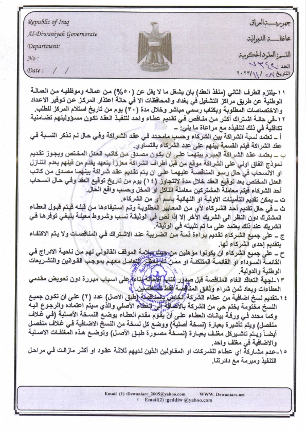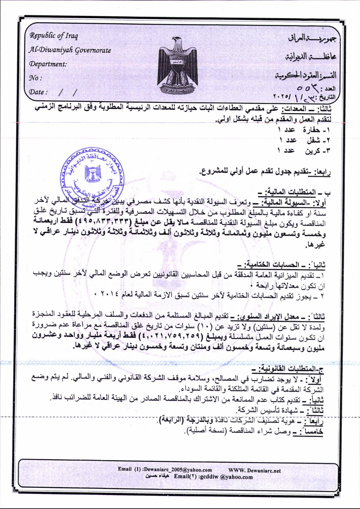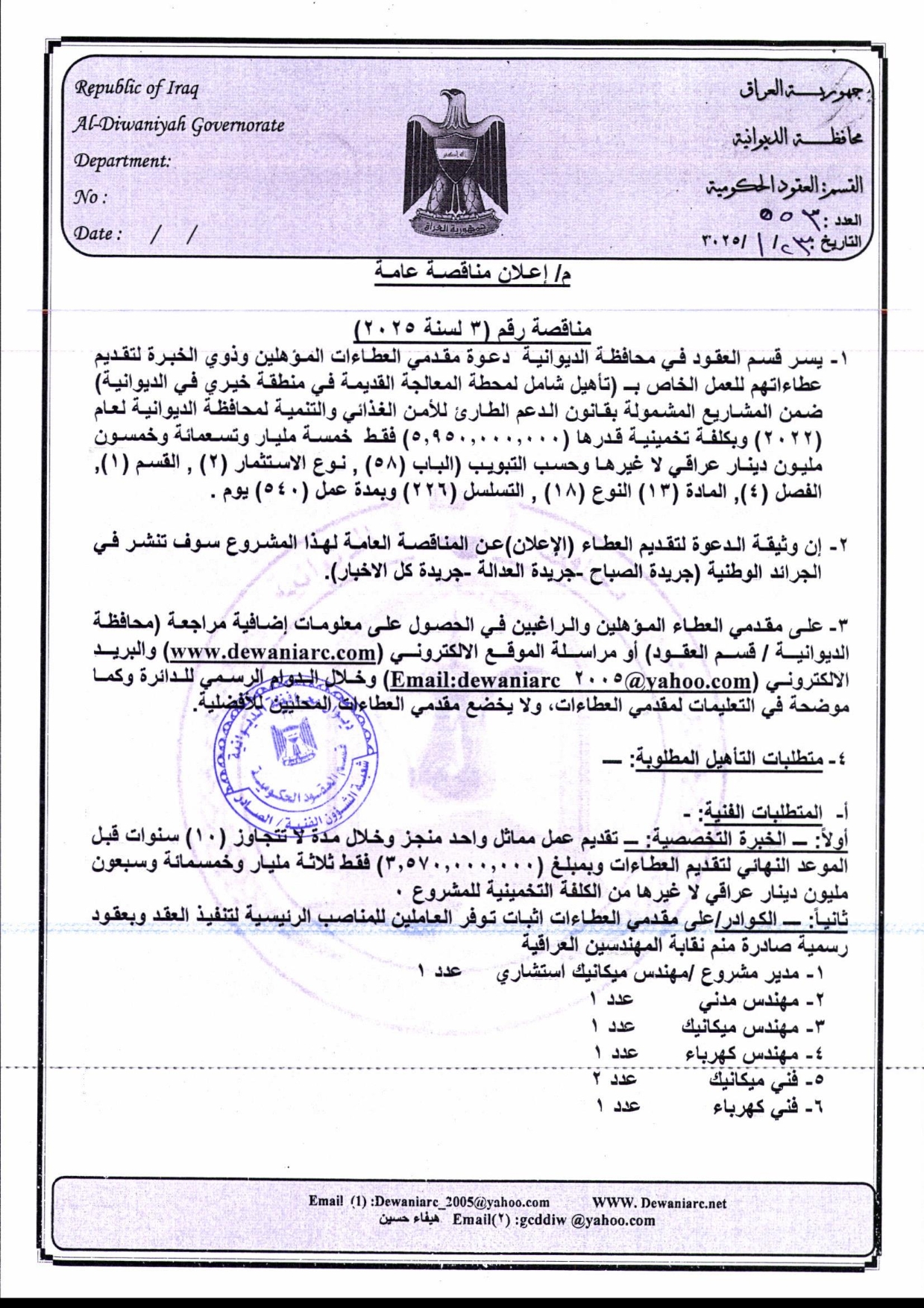﴿ إعلان مناقصة (3) لسنة 2025 ضمن قانون الامن الطارئ والأمن الغذائي 2022