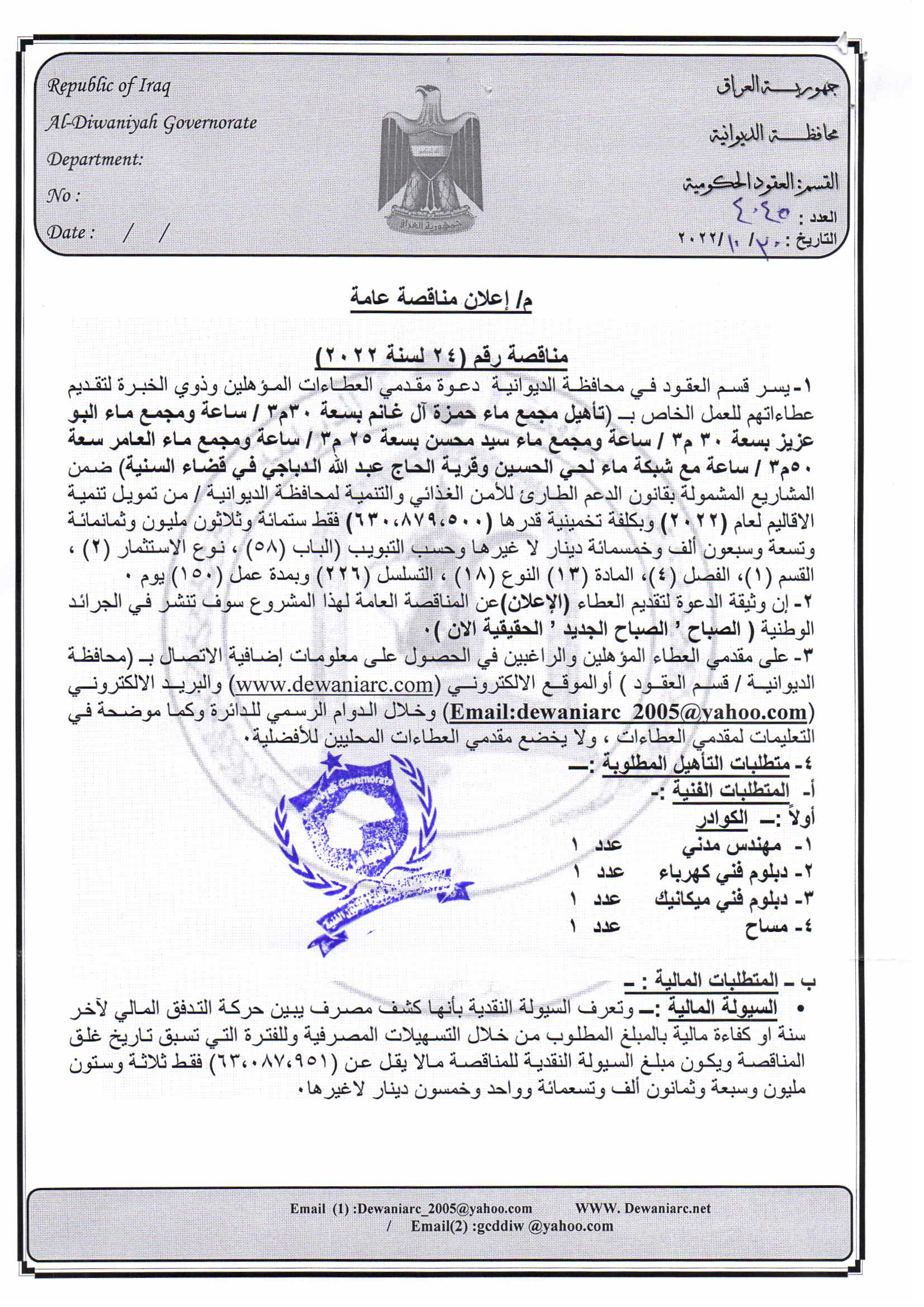 ﴿ إعلان مناقصة (24) لسنة 2022