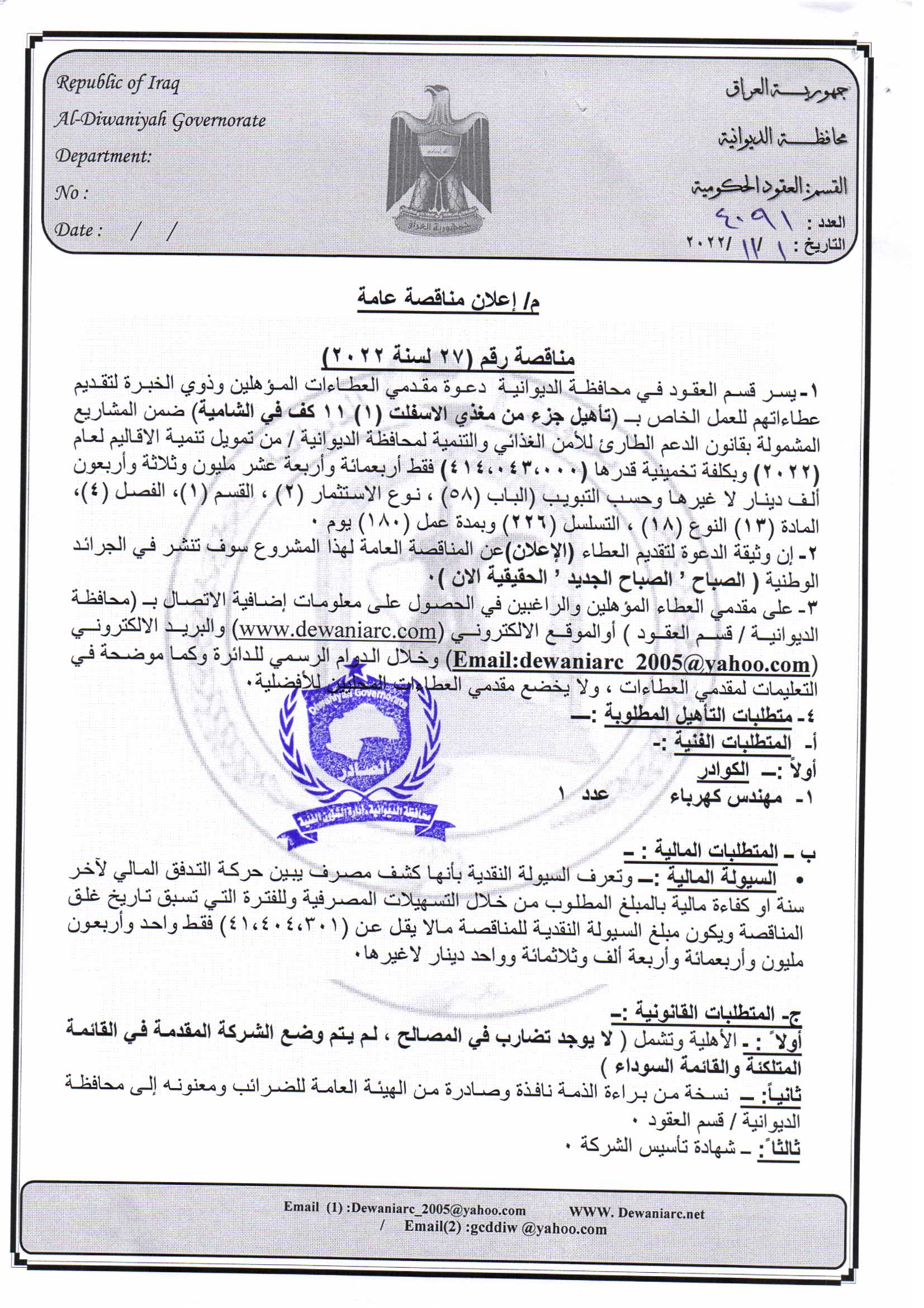 ﴿ إعلان مناقصة (27) لسنة 2022