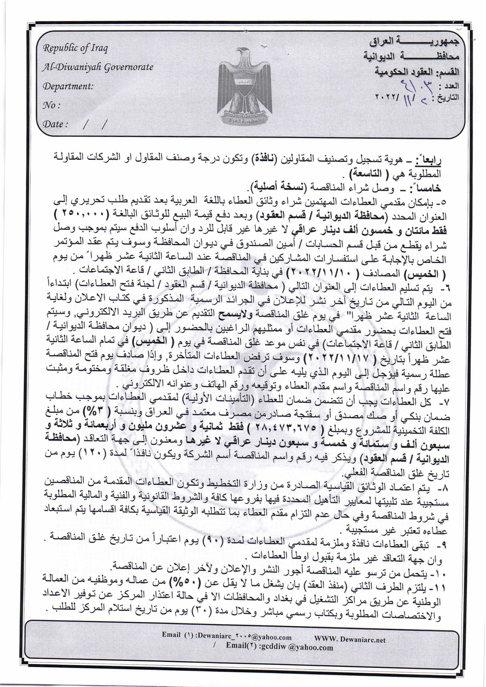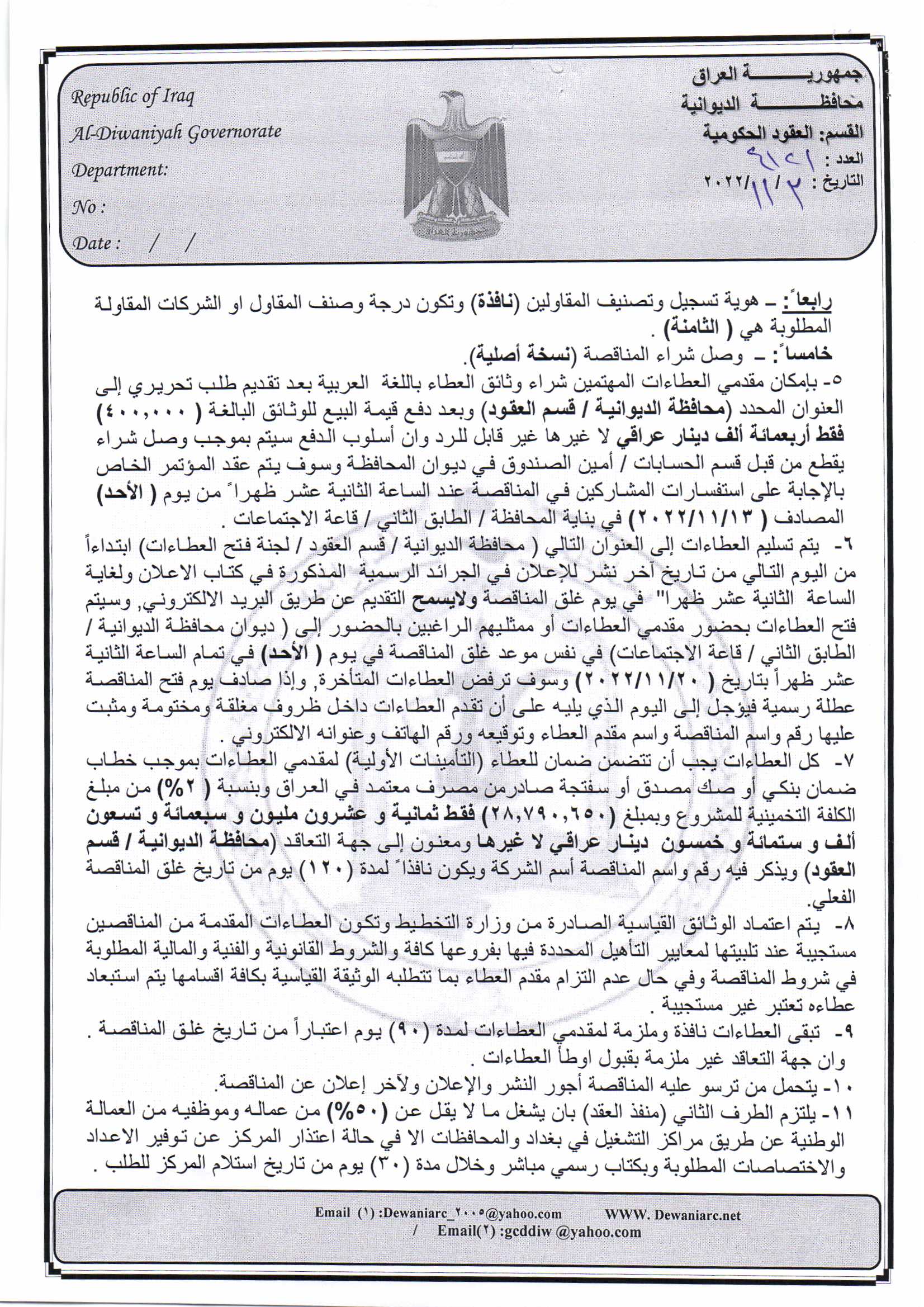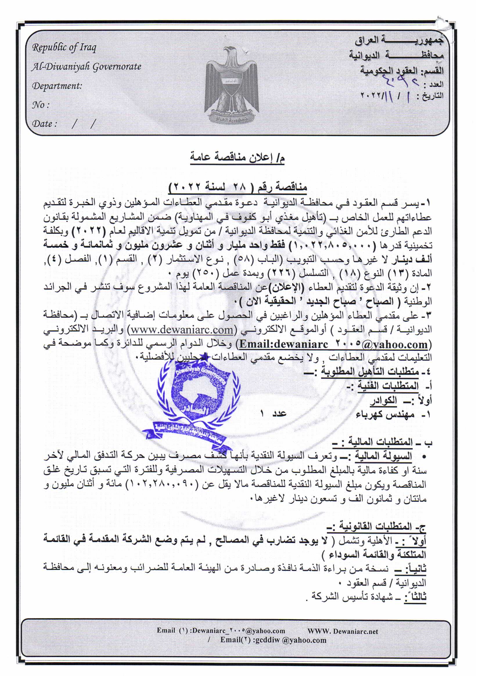 ﴿ إعلان مناقصة (28) لسنة 2022