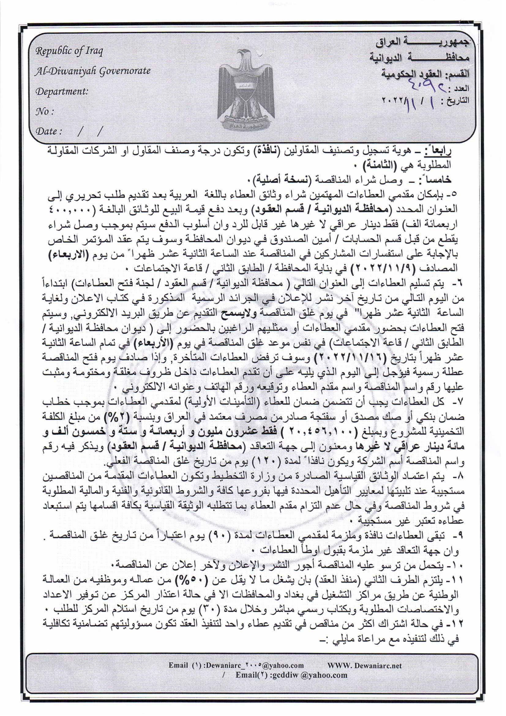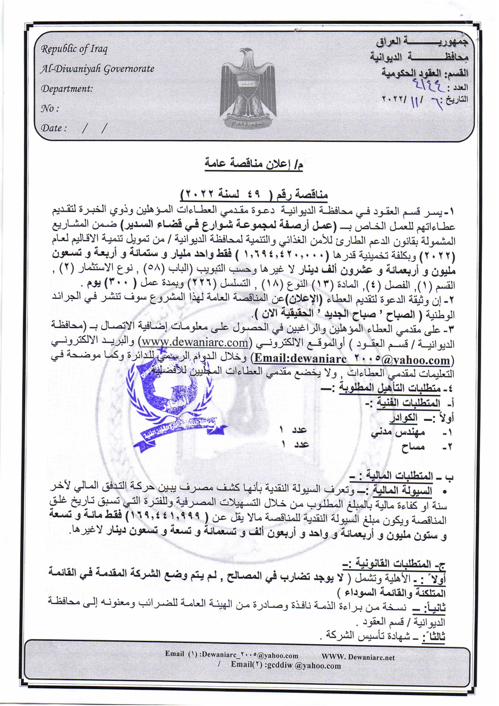 ﴿ إعلان مناقصة (49) لسنة 2022