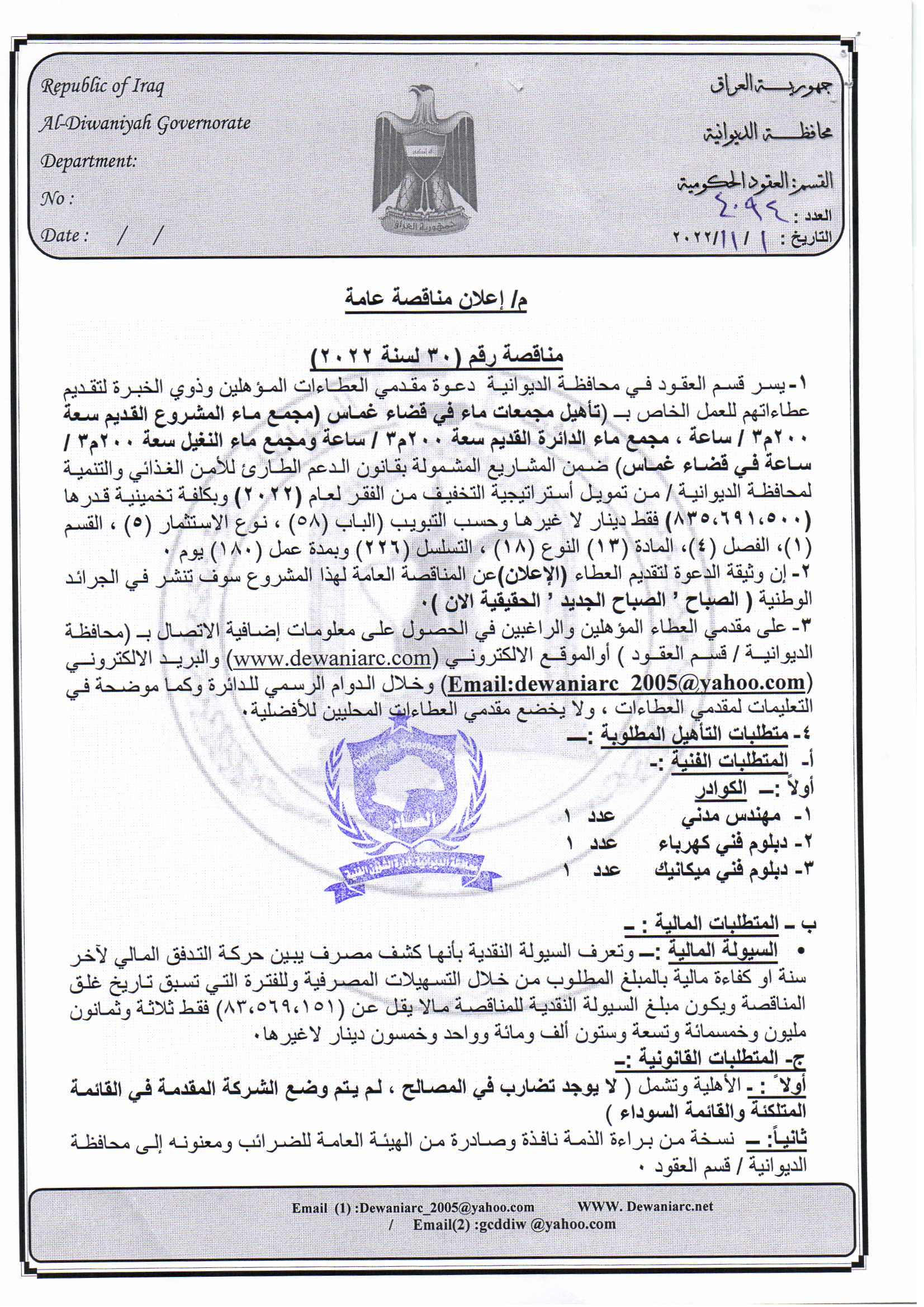 ﴿ إعلان مناقصة (30) لسنة 2022
