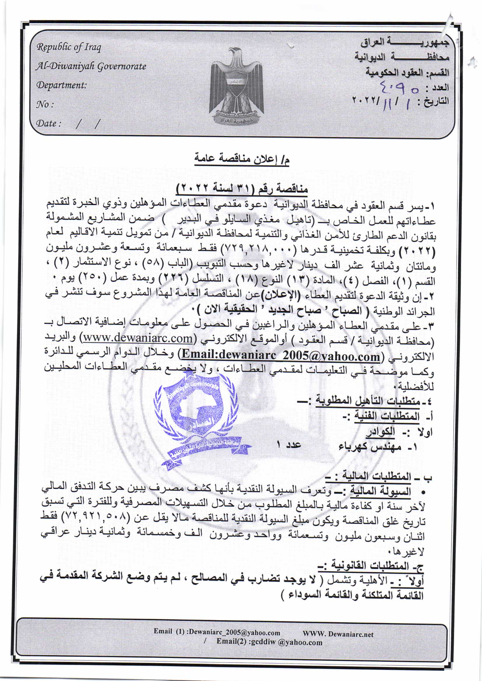 ﴿ إعلان مناقصة (31) لسنة 2022