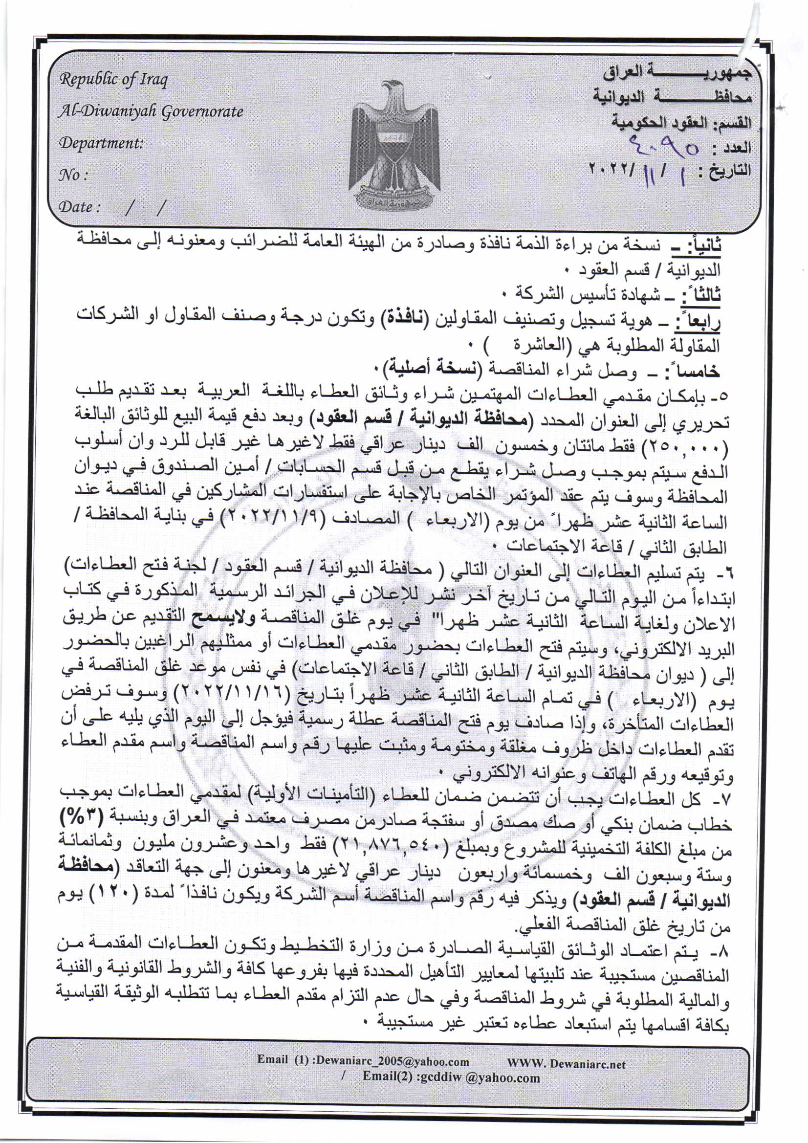 ﴿ إعلان مناقصة (21) لسنة 2022