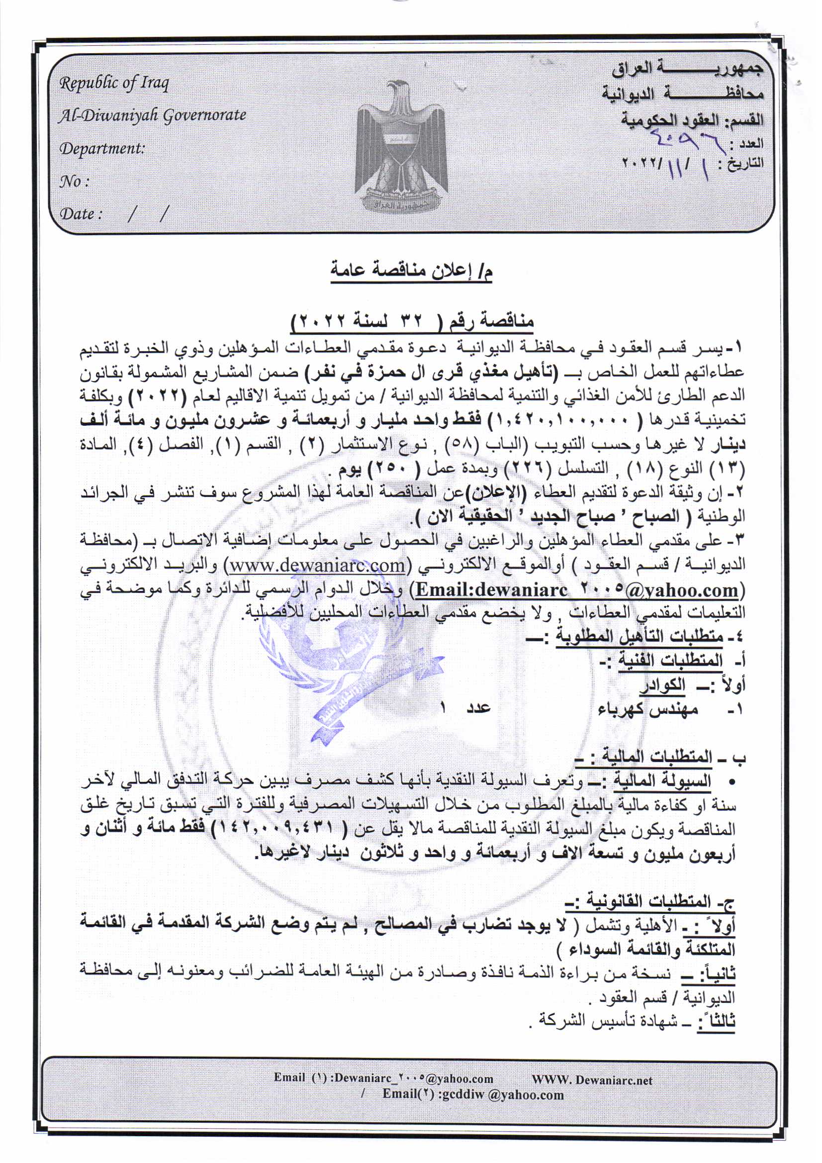 ﴿ إعلان مناقصة (32) لسنة 2022