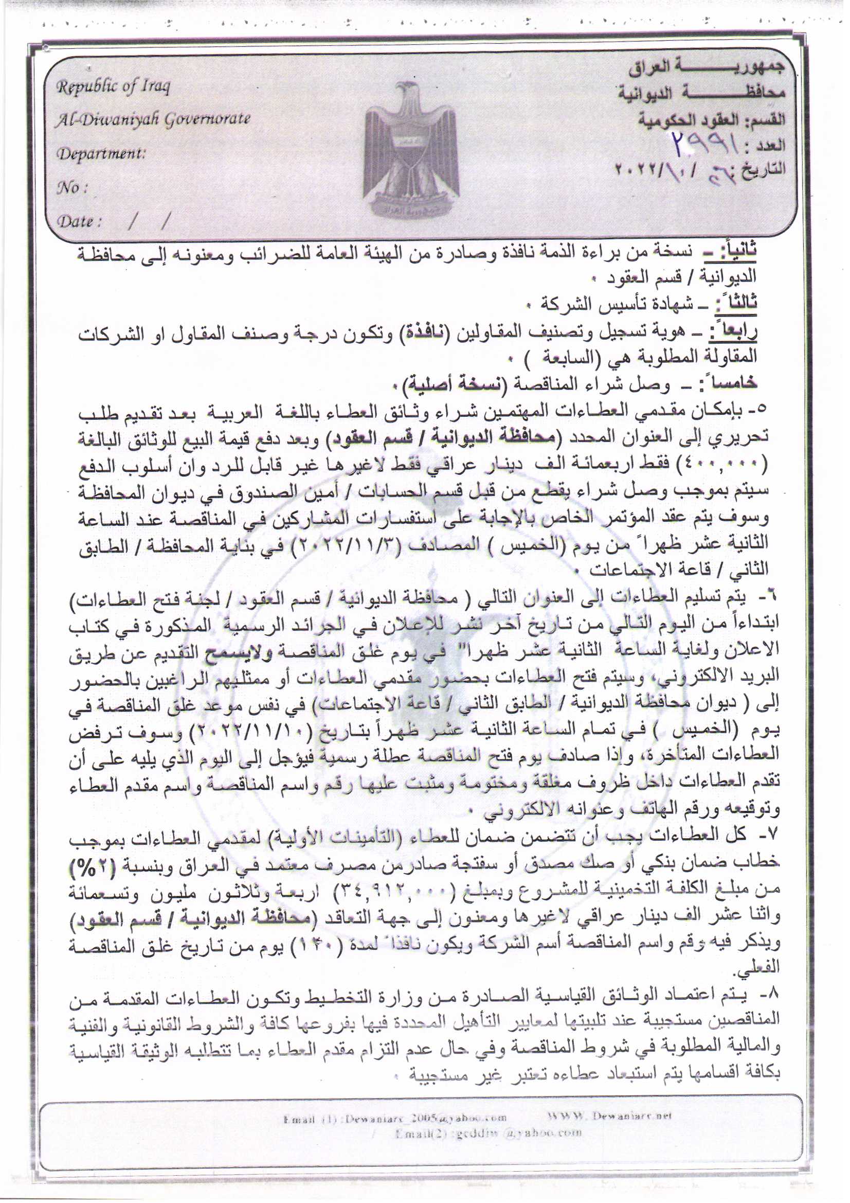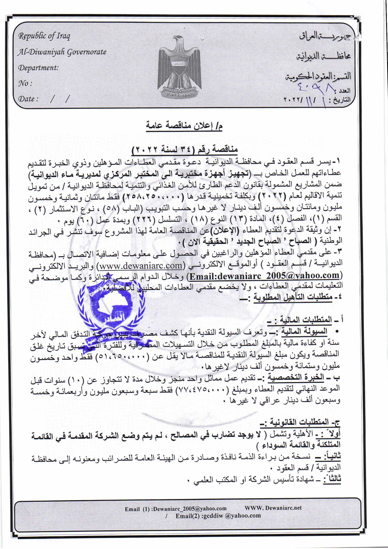 ﴿ إعلان مناقصة (34) لسنة 2022
