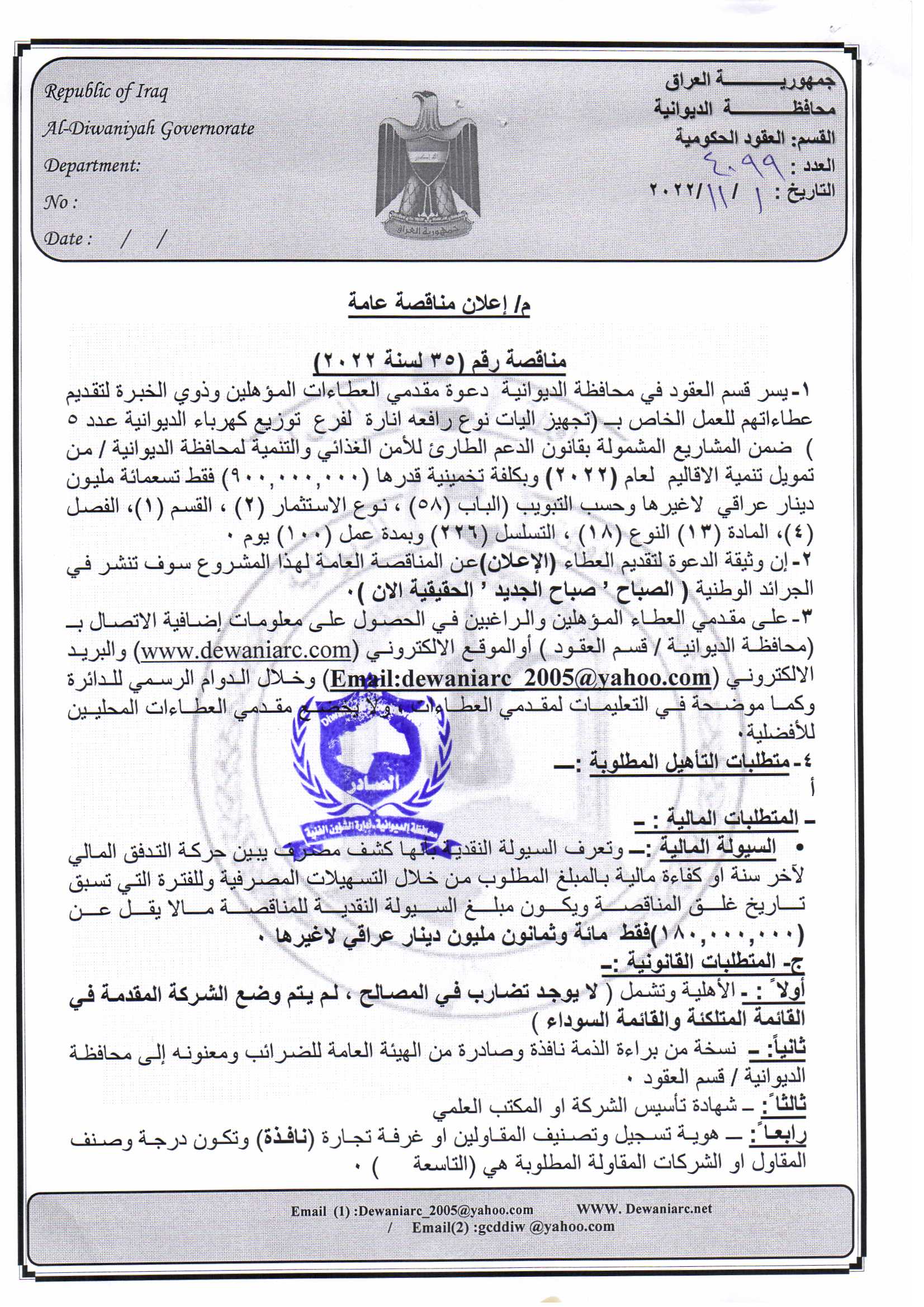 ﴿ إعلان مناقصة (35) لسنة 2022