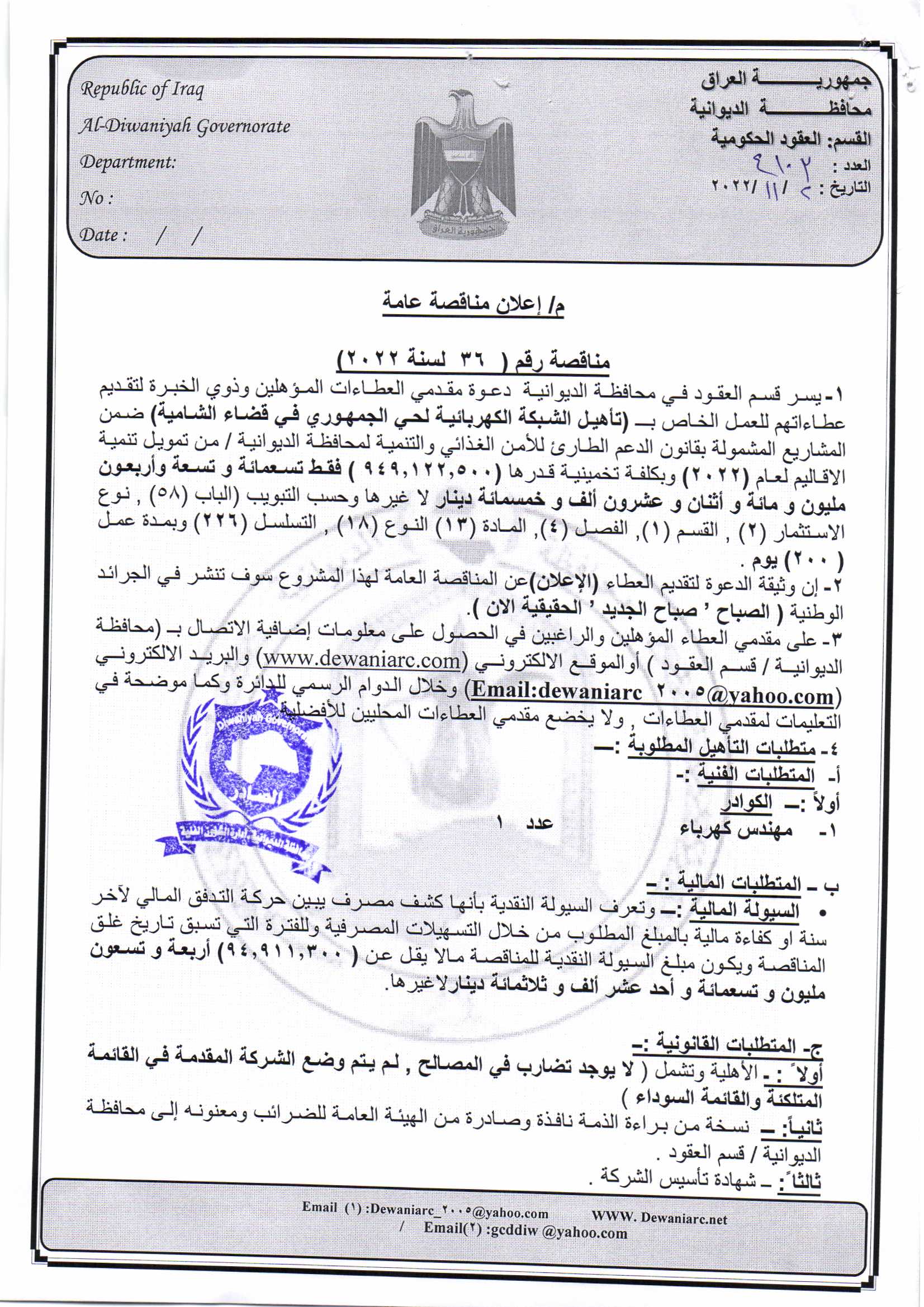 ﴿ إعلان مناقصة (36) لسنة 2022
