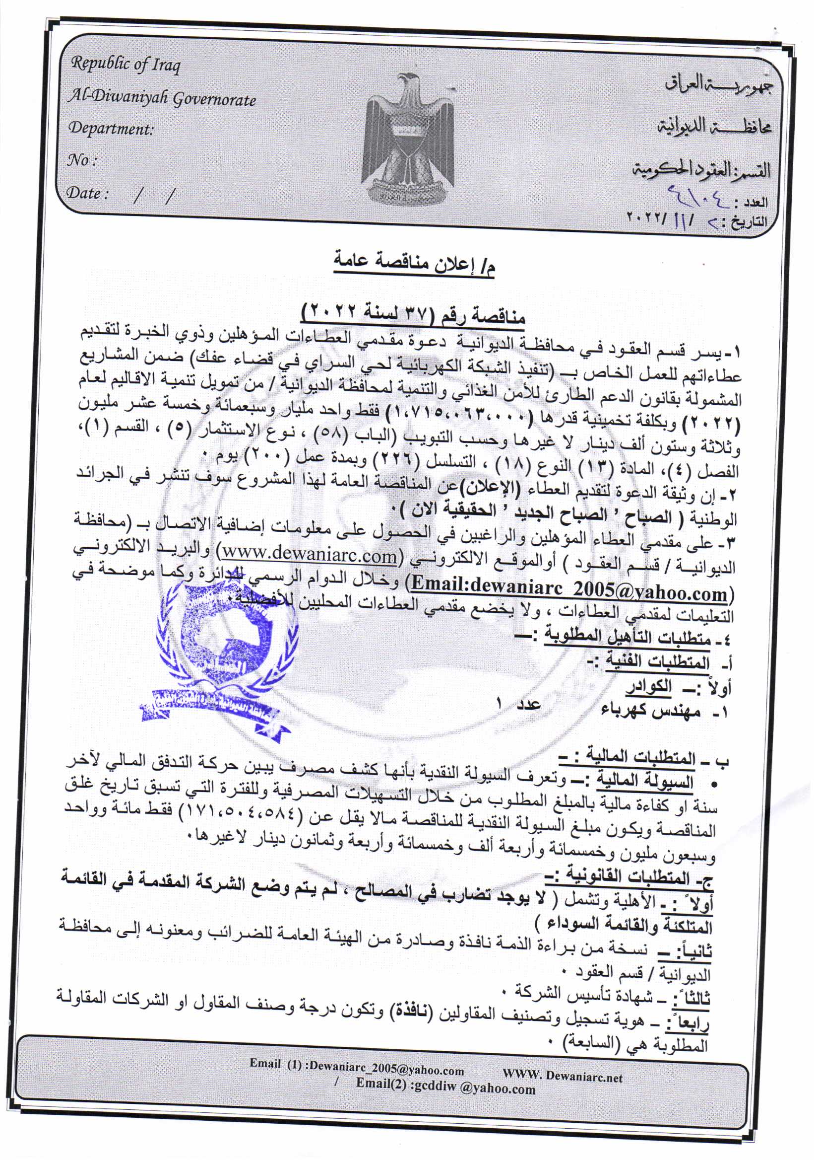 ﴿ إعلان مناقصة (37) لسنة 2022