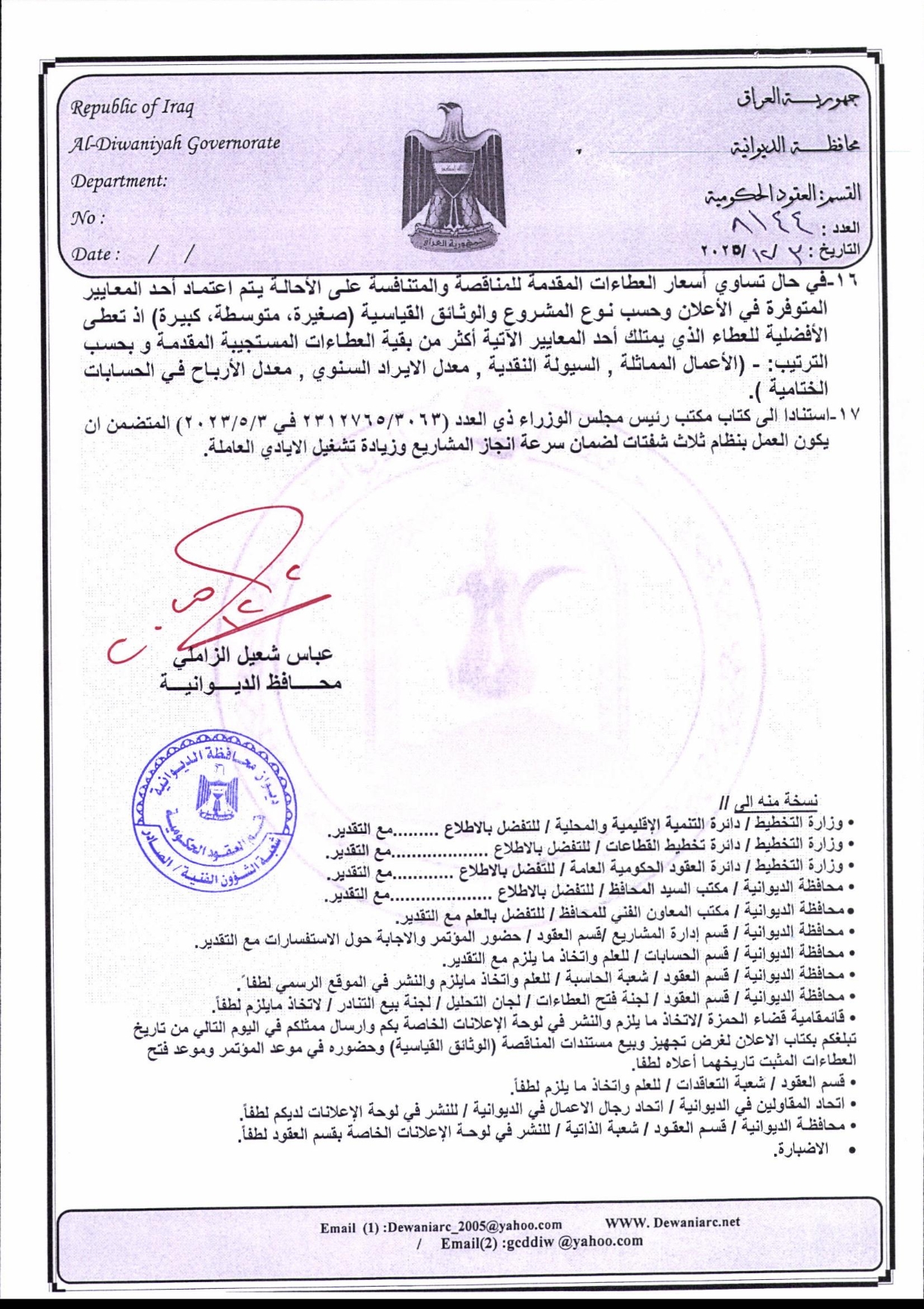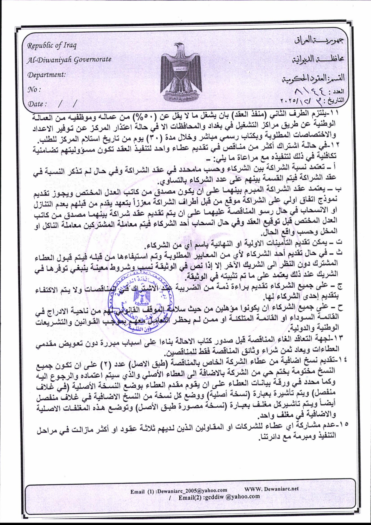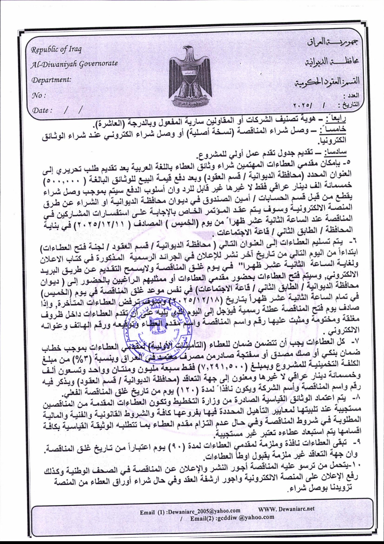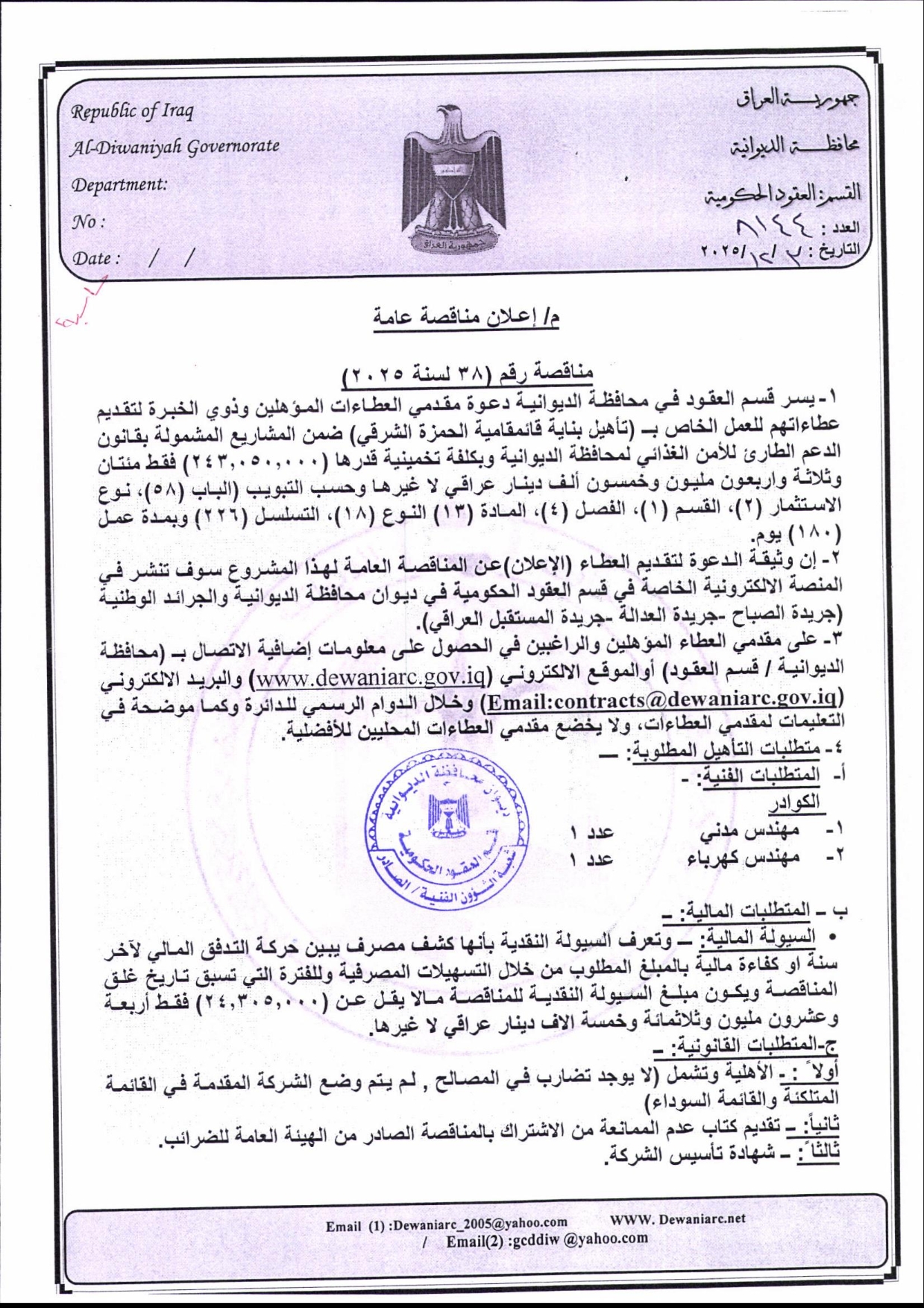 إعلان مناقصة (38) لسنة 2025 ضمن قانون الامن الطارئ والأمن الغذائي 2022