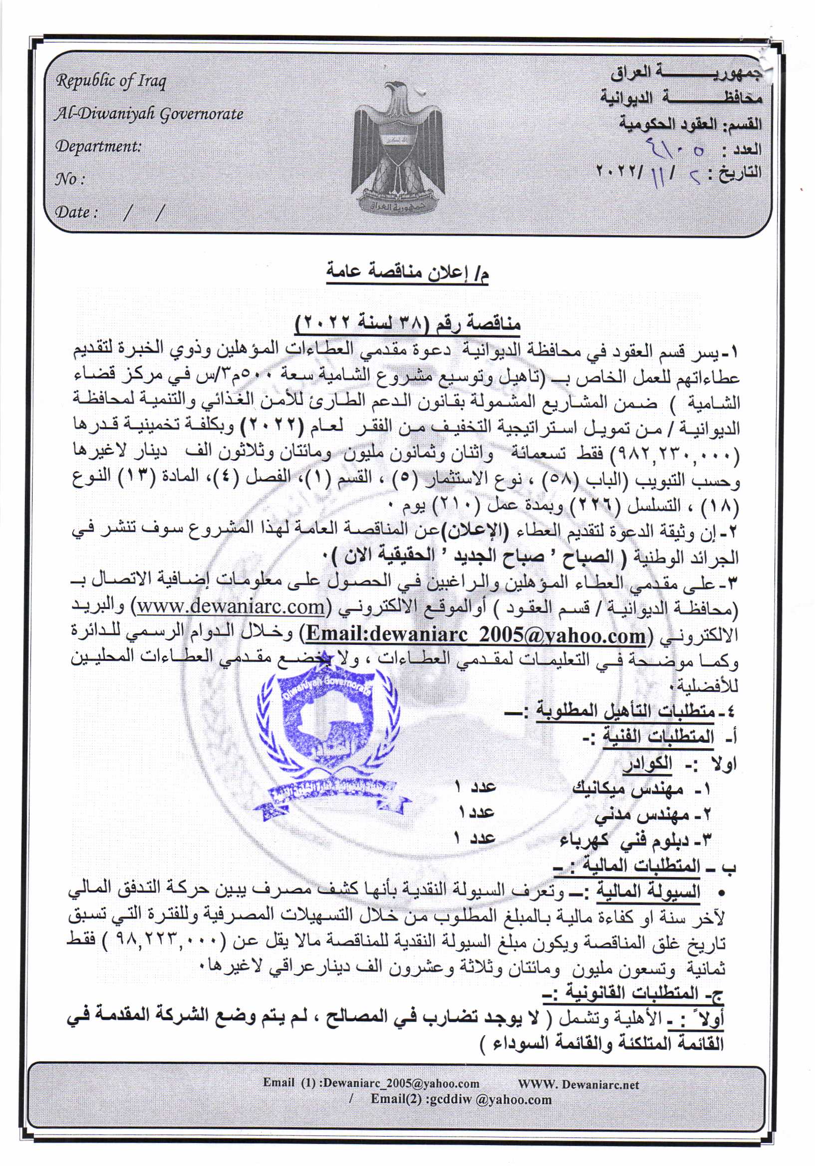 ﴿ إعلان مناقصة (38) لسنة 2022