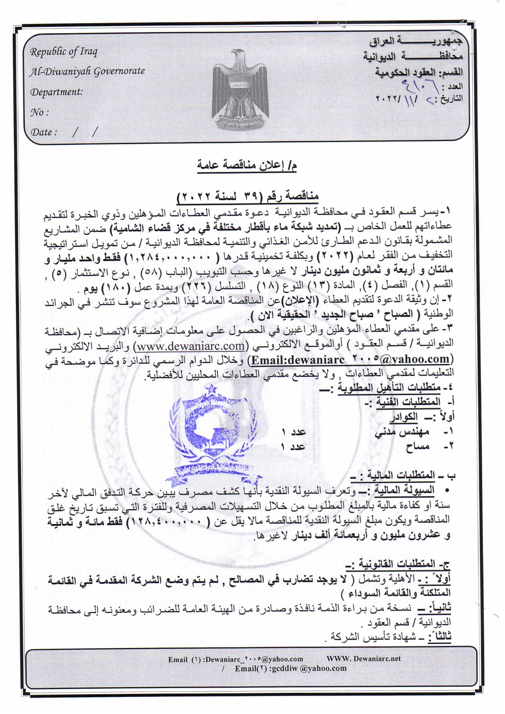 ﴿ إعلان مناقصة (39) لسنة 2022