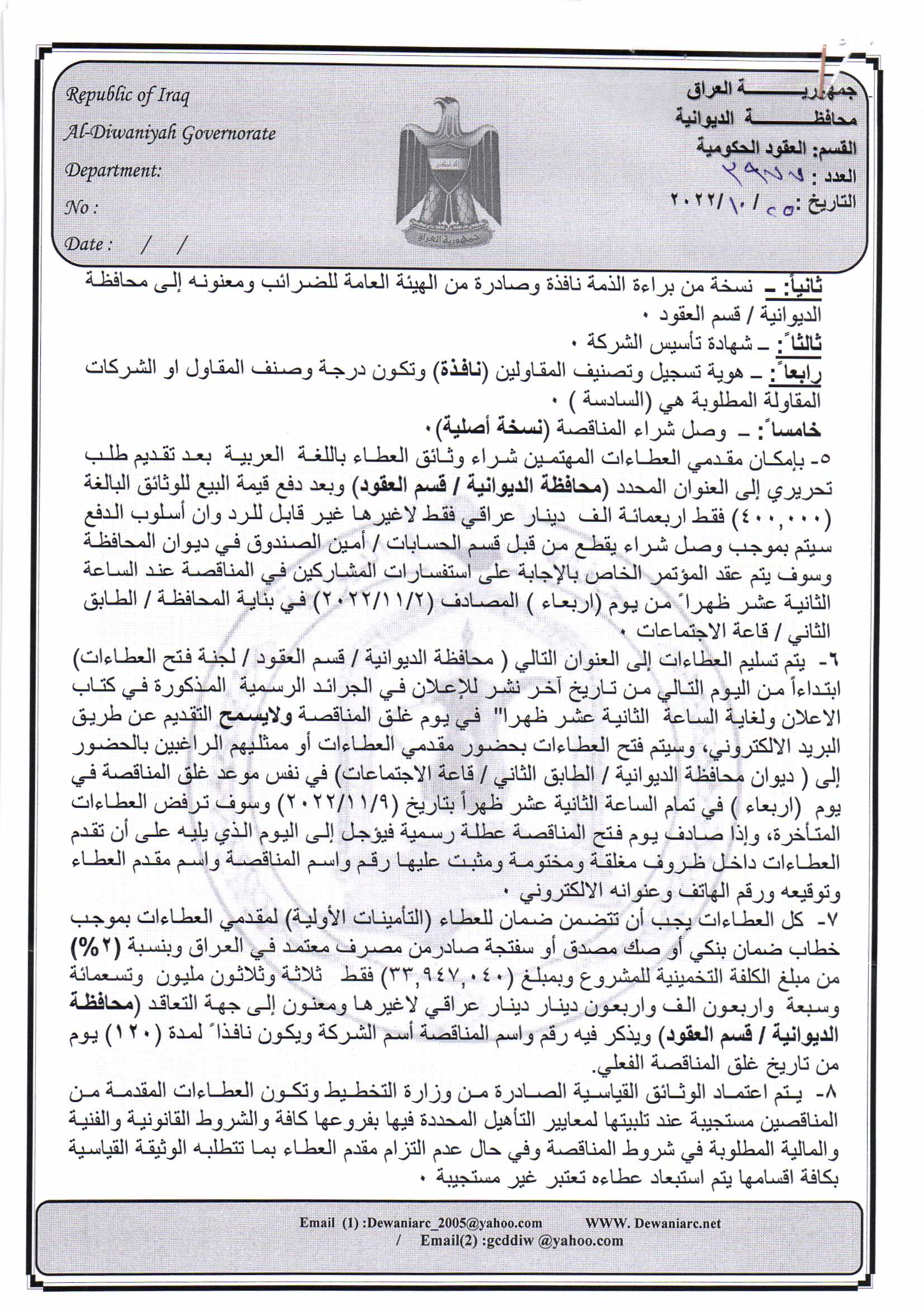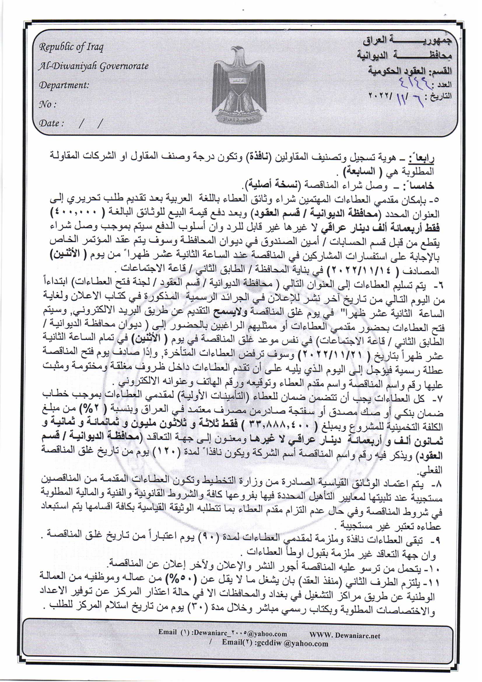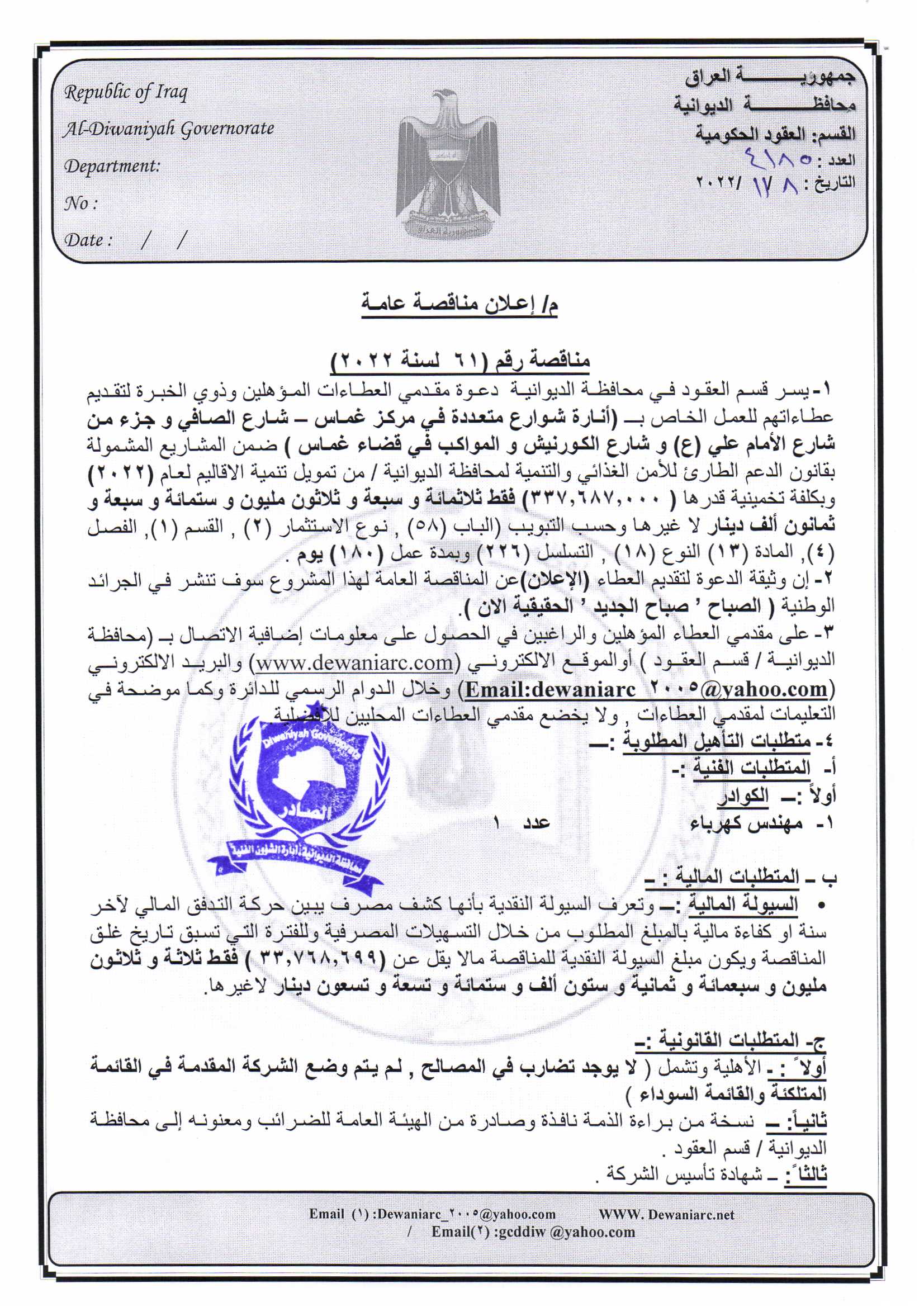 ﴿ إعلان مناقصة (33) لسنة 2022