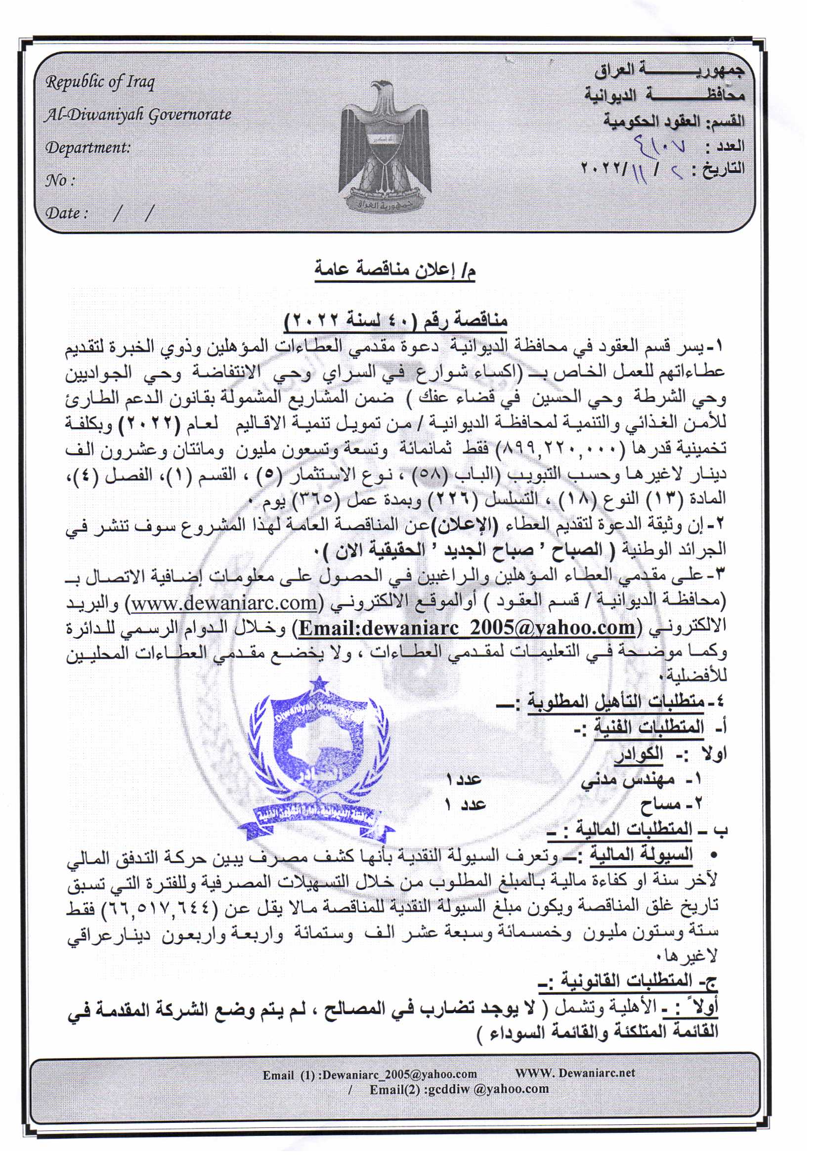 ﴿ إعلان مناقصة (40) لسنة 2022