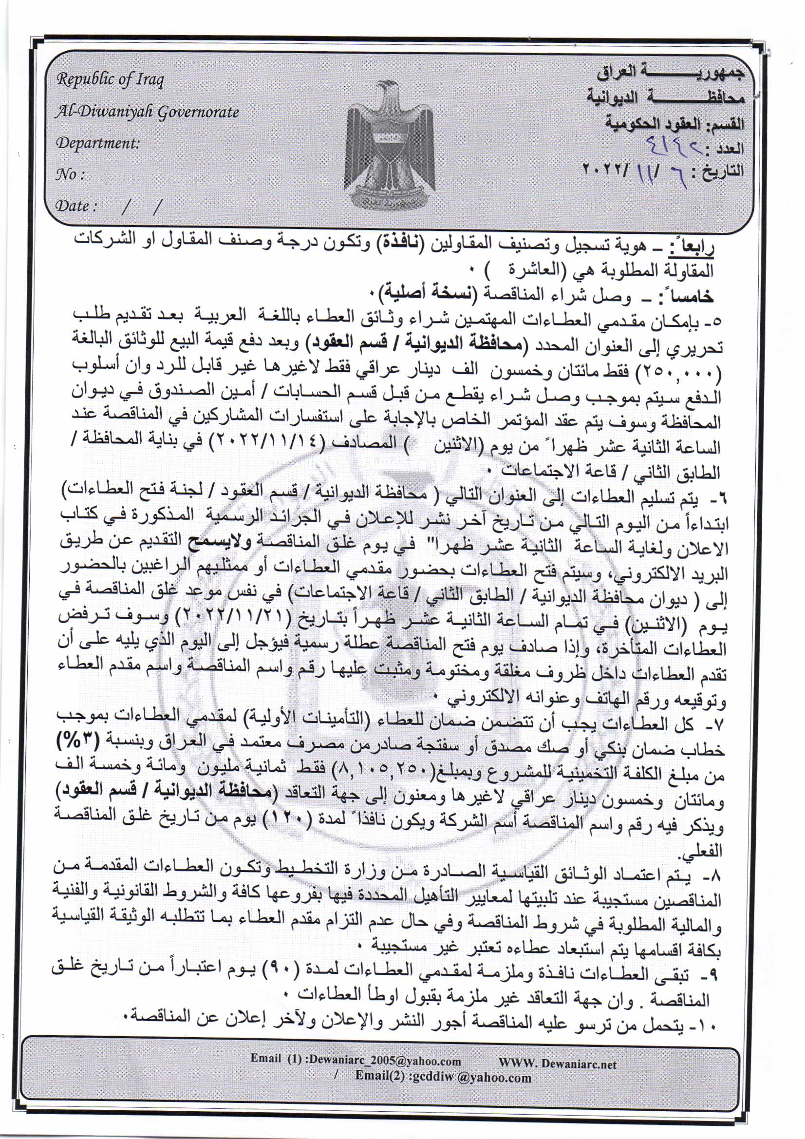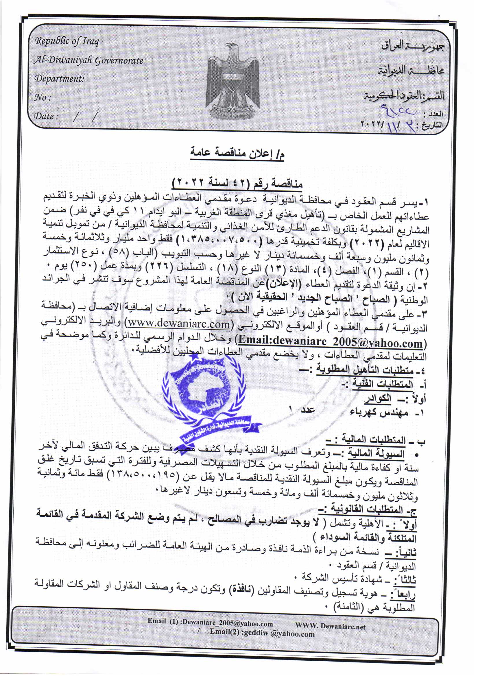 ﴿ إعلان مناقصة (42) لسنة 2022